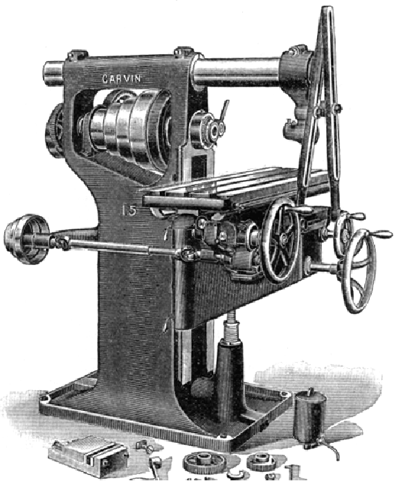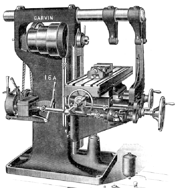 Designed to be a workman-like jobbing machine able to perform a variety of tasks in a general-engineering workshop, the Garvin Model 15 Plain Miller contained all the design features common to the makers but, instead of a screw-driven table, employed a hardened steel worm that meshed directly with a spiral rack cut on the underside of the table. The arrangement, also found on Swiss-manufactured Mikron precision bench milling machines of the 1930s, was geared to give a very direct feed with one turn of the large operating handle moving the table two inches. Micrometer stops were fitted to the knee, saddle and table.