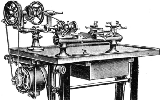 Circa 1907 - a neatly-arranged (and expensive) bench and countershaft assembly driving a WW pattern watchmaker's lathe. It would be many years before similar self-contained, motorised assemblies were available for small screwcutting lathes.