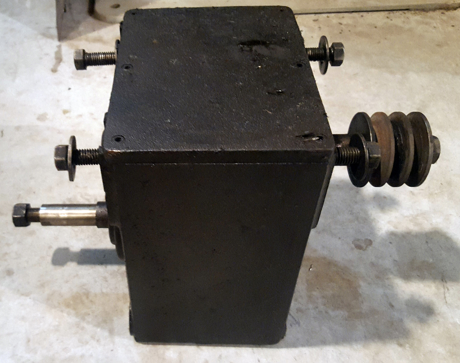Main drive gearbox held in the base of the main column - drive, via three V-belts, came from a motor mounted on an adjustable plate