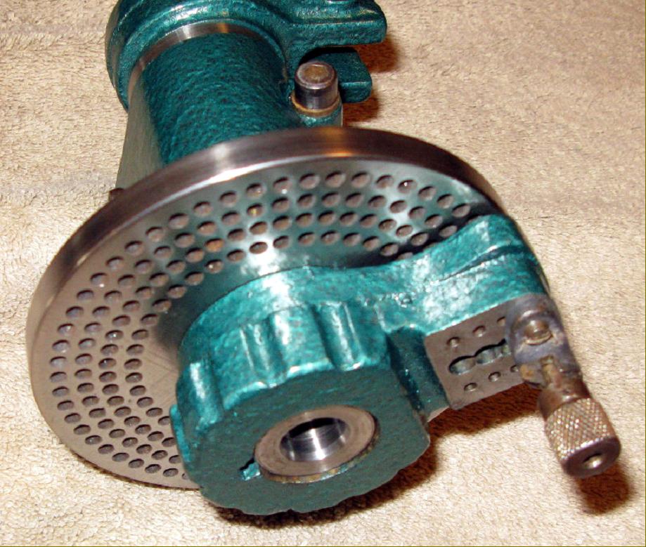 Globe milling attachment complete with tailstock Globe also manufactured, from around 1953, a now rare 4.75" swing dividing attachment with a No. 2 Morse taper spindle and complete with tailstock ( the unit is shown at the bottom of the page). Patented during 1942 by Mr. Paul Hellman, it was some time before it reached production and, when it did, was relatively expensive at US$81.90 - a figure that compares with the $295 asked for the Powr-Kraft lathe it was intended to fit. The makers claimed its uses were: For Most Indexing work - cutting spur gears; milling index plates, counterbore and reamer flutes, splined shafts, multiple keyways, squares, etc. Fits on Powr-Kraft, Logan 10 and 11-in. lathes. The nose was threaded 13/8" x 8 t.p.i. and fitted to the back was a division plate (and spring-loaded detent), with four circles of holes that allowed indexing to be carried out in steps of 1 to 10, 11, 12, 14, 15, 18, 20, 22, 27, 28, 30, 44, 54, 56 and 60. Most dividing heads of this type have some form of sector arms to assist the operator in keeping track of which divisions are selected - but the Globe has none. However, the Patent describes a most interesting point: the spindle arm casting is shaped with slight curves on each side and this appears, at first glance, to be a simple cosmetic feature but actually is a specific design point that covers the same number of holes irrespective of which division circle is being used. According to users, the cleverness of Paul Hellman's design shows through everywhere and the quality was good too, with the spindle, tailstock nose and thrust collar all hardened. It seems surprising therefore that it was only made for a few years. Although advertised for use on lathes (in conjunction with the Globe milling attachment using a specially adapted cross-slide), the unit would have been perfectly at home on any small milling machine.