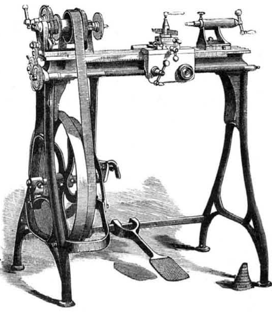 Notches in the underside of its bed confirm that the lathe was originally carried on a pair of cast-iron "standards" with drive coming from a "foot-power", treadle-operated 21.5-inch diameter, 60 lb., spoked flywheel - a cutaway in the bed, directly in line with smaller of the headstock pulleys, being intended to give clearance for the flat drive belt. The maker's publicity engraving, shown below, illustrated how the lathe was configured upon its introduction.
