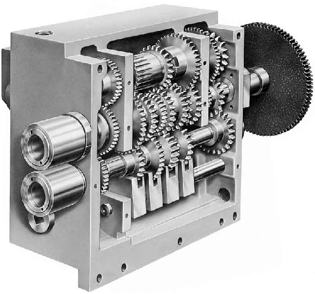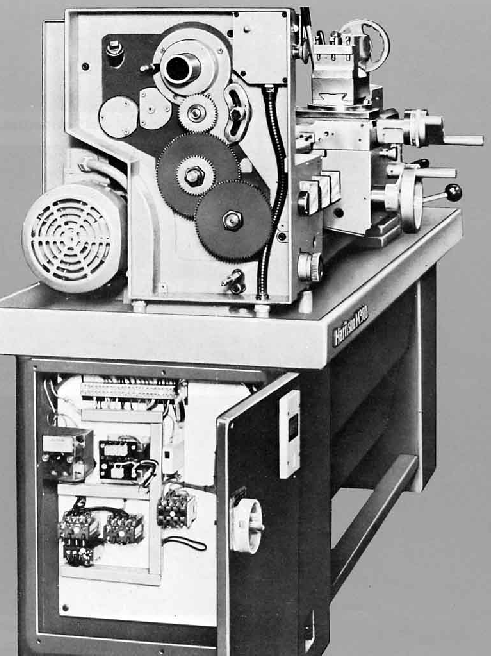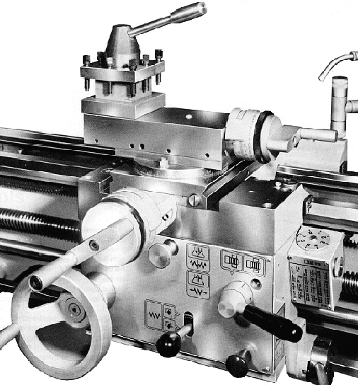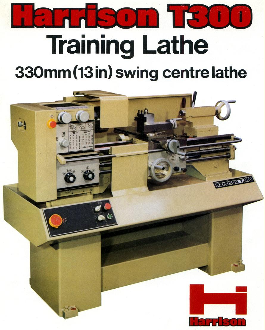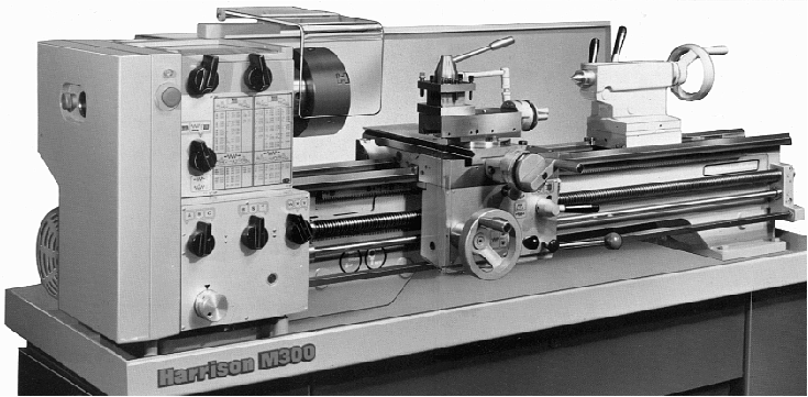 Continued: The spindle, which runs in Gamet Super-precision opposed-thrust roller bearings, has a generous 38 mm (1.5") bore and is equipped with a hardened and ground No. 4 D-1 Camlock nose and a No. 5 Morse-taper socket. The headstock gears, all induction-hardened, run in a simple splash oil bath and are moved by two rather short levers on the front face of the headstock; as a safety measure the levers have to be pushed in before they can be turned and their finish, which is far too smooth, can make them difficult to operate with oily hands. Early series lathes were fitted with a headstock gear-selector drum in "Delrin" which distorted, preventing movement of the selector forks. The fault was quickly recognised by the makers and a replacement drum (part: 303-039) made available in metal. Screwcutting is provided through a well-supported, ball-thrust-equipped 28 mm (1.125") diameter leadscrew, of 6 mm pitch or 4 t.p.i., that is engaged only for threading (a thread-dial indicator is part of the standard equipment) with a separate power-shaft driving the sliding and surfacing feeds. Surprisingly, for a lathe often found in training workshops, the leadscrew is not protected by a cover as on the M250, but there are torque-limiting clutches on both the leadscrew and powershaft - though earlier models were protected by a limiter on the powershaft with just a mild-steel shear-pin through the splined shaft of the top changewheel stud to prevent over-load damage to the leadscrew. Both systems are adequate enough to militate the damage that might otherwise be caused by the over-ambitious cuts often set up by apprentices or - if one dare one say it - the over-enthusiastic amateur. In comparison with earlier Harrison screwcutting gearboxes the "Universal" unit fitted to the M300 is a considerable improvement and capable of reliably transmitting much great torque. Formed from a one-piece casting it is completely enclosed and holds induction-hardened gears driven by changewheels that have included, over the years, one or more non-metallic intermediates to promote quite running. Controlled by three levers and an 8-position rotary dial the box will generate both English and metric threads: 35 Inch pitches from 2 to 56 t.p.i and 39 metric pitches from 0.2 to 14 mm. By the use of additional changewheels 18 Module pitches from 0.3 to 3.5 MOD and 18 Dimetral pitches from 8 to 56 DP can also be obtained. The range of power sliding feeds varies from 0.03 mm to 1 mm per revolution of the spindle in metric mode and from 0.001" to 0.040" in English; the power cross feed rate is arranged to be half the sliding rate. The box runs in an oil bath (a level window is fitted on the front face) with the lower gears distributing the oil by splash. Fitted on either the left or right of the apron (to the customer's choice) the carriage traverse handwheel can be disengaged when using power feeds. The double-wall apron carries a supply of lubricant in its base (with a level window let into the headstock-end face) that can be distributed to the bed and cross slide by a simple hand-operated plunger pump. Feeds are engaged by a traditional push-pull plunger and engaged and disengaged a very light-action, flick-up-and-down lever the operation of which is not affected by the how hard the lathe is working. Fitted with feed screws carrying twin ball-thrust races, that for the cross slide on early models had a nut closed by a wedge (in common with many conventional lathes made by the 600 Group) to allow the elimination of backlash - though when the assembly is badly worn this arrangement can disguise the imminent failure of the threads. Later machines were modified and the nut made solid--the change also affecting the design of the cross-feed screw, The satin-chrome finish micrometer dials are sensibly large with especially clear graduations with that on the cross slide arranged as a "direct-reading" type to shows the amount taken off the diameter rather than the radius of a workpiece. Whilst the top slide has a traditional screw-adjusted gib-strip, the full-length cross slide is fitted with a tapered type and the cross and top slides, as well as the saddle, are equipped with locking screws. Carefully thought out, the specification of the heavily constructed, set-over tailstock was very user-friendly - with especially long and easy-to-use locking handles fitted with gently tapered and consequently comfortable handgrips. The 42-mm diameter quill, marked with inch, metric (and sometimes both graduations) is fitted with a ball thrust bearing, a micrometer graduated collar and accepts a No. 3 Morse taper of the tang type with, usefully, a drift slot provided to aid its removal. As a final touch, tailstocks on later versions of the M300 carry felt bed wipers to help reduce the inevitable wear to the front section of the sole plate. Electrical stop, start and reverse of the spindle is by a "third-rod" system controlled by a lever attached to, and moving with, the apron. Both the electrical isolator and coolant pump switch are mounted on the left-hand face of the stand - the latter a unit that is well made and supplied with a chip tray, splash-back and locking tool cupboard as standard. Although safety equipment has varied during a long production run most machines have a useful "power-on" light, a rather small headstock-mounted, mushroom-headed emergency stop button, a long, foot-operated (and very powerful) spindle-brake and "motor-off" bar and electrical interlocking of the changewheel guard. The electrical system is built into the left-hand end of the stand and accessible thorough a door equipped with an interlocked isolating switch that can, for additional security, be padlocked in the off position. Although of an excellent mechanical specification equipment provided as standard with the M300 has generally been sparse: a single toolpost, drive plate, a 5 to 3 Morse adaptor bush for the headstock spindle (often missing on used machine