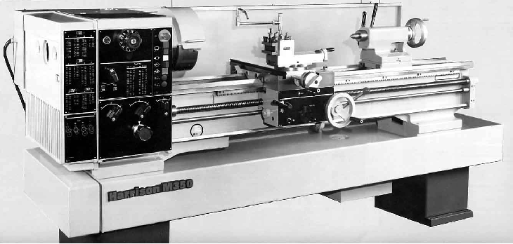 Designed in the early 1980s the Harrison M350 was to fit between the well-established (but approaching ten-year old) M300 and M400/450 lathes. As a model its production life was relatively short and, by 1998, it had been replaced by the almost identical M390 whose swing, in line with its model number, was 390 mm, whereas the swing of the M350 was actually 380 mm. Two bed lengths were offered: one gave 40 inches (1000 mm) between the centres the other 60 inches (1500 mm); either version could be had with or without a gap and both were induction hardened. With the gap section removed a piece of material 23 inches (585 mm) in diameter and 6 inches (150 mm) thick could be turned on the faceplate. With 12 speeds in geometrical progression from 40 to 2200 rpm the geared headstock was fitted with a cleverly-engineered speed-change system operated from a single dial, centrally positioned at the top of the headstock's front face. The spindle, able to accept a 2.125-inch (54 mm) diameter bar was fitted with a No. 6-D1 Camlock nose and ran in pre-loaded Gamet super-precision tapered roller bearings. Two types of drive system were offered: one, intended for serious production and industrial use was driven by a 5.5 kW motor and incorporated a Matrix mechanical forward-reverse clutch on the headstock-input shaft controlled by a lever mounted on the right-hand face of the apron (exactly as the M400 Model). The other system, better suited to lighter-duty and training establishment use, employed a 3.7 kW motor with electrical operation direct through a simple forward/reversing contactor - again controlled from the apron-mounted lever; both lathes were fitted with an electromagnetic fail-safe spindle brake. The headstock of 3.7 kW lathe, being lightly stressed, relied upon splash lubrication, whilst the more powerful model, with considerably greater forces to handle, was provided with pressure lubrication from a base-mounted pump and tank. Continued below: