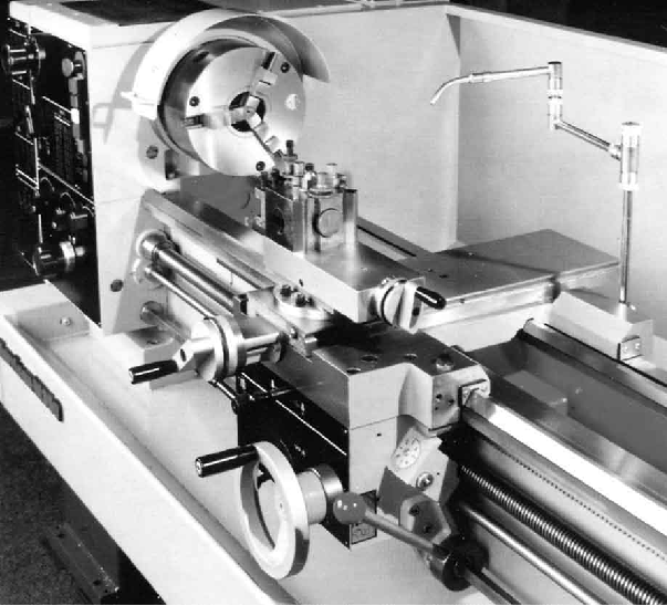 The geared headstock provided 12 speeds in geometrical progression from 40 to 2200 rpm all selected by a cleverly-engineered system from a single dial, centrally positioned at the top of the headstock's front face.