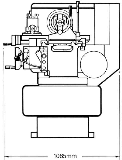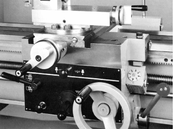 Fitted with a conventional spoked wheel for movement by hand, the apron carried both leadscrew and power-shaft driven feeds; the 32 mm (1.26") diameter leadscrew (of 6 mm pitch or 4 t.p.i) was engaged only for screwcutting (and carried a torque-limiter) whilst the powershaft provided the sliding and surfacing feeds used in normal work. A push/pull button selected the power sliding and surfacing feeds, with engagement by single lever in the middle of the apron.