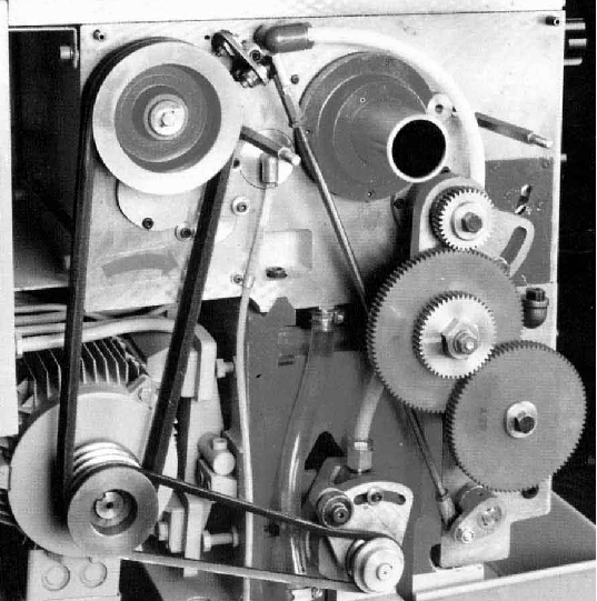 With the end cover removed from a heavy-duty headstock M350 the simple but effective rocking motor mount, quiet-running, non-metallic intermediate changewheels, the V belt drive to the headstock pressure lubrication pump (bottom) and long spindle clutch control rod are all clearly visible.
