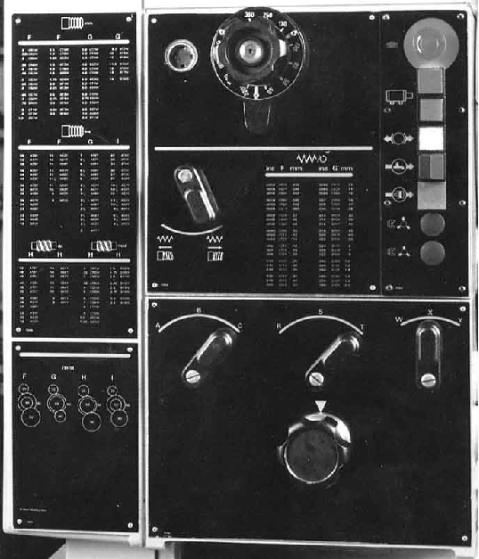 Clearly labelled and logically laid out headstock control panel. Although a centralised low-voltage push-button control "Station" was mounted on the headstock (which controlled the main motor, spindle brake, emergency stop and coolant pump) electrical control of the spindle was intended to be primarily from a lever attached to the right-hand face of the apron, where it fell conveniently to hand and, of course, moved with the carriage as a cut was taken.
