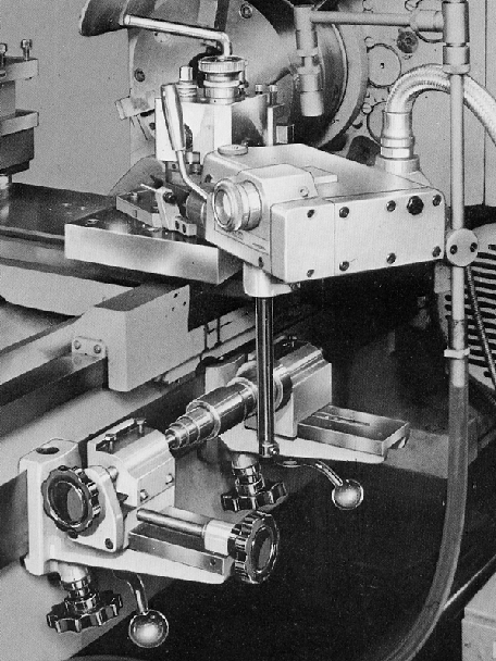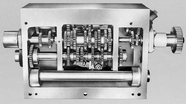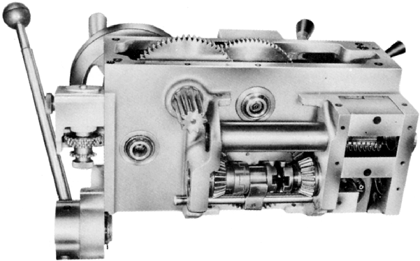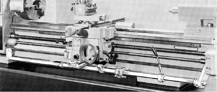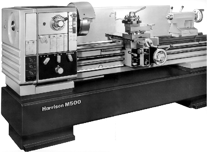 When introduced, the 500 was the largest machine to join the original line up of M250, M300 and M400/M450 and was designed to meet the international ISO standards R1708 and BS4656 for general-purpose lathes (suitable for both production use and in maintenance and repair shops); it was also subjected to lengthy testing by the Machine Tool Industry Research Association. The actual swing was 530 mm with a choice of three between-centres' capacities of 1000, 1500 and 2000 mm (40", 60" and 80"). A detachable gap in the induction-hardened bed was optional and when fitted allowed the lathe to turn a piece of metal 730 mm (28.75") in diameter and up to 200 mm (7.875") deep. The bed was identical in size and weight to that used on the M400 and M450 lathes with a maximum depth beneath the headstock of 380 mm (15") and a width of 360 mm (14.125"); heavy cross ribs braced the front and back faces and left clear vertical spaces for swarf to fall through. The stand, whilst adequately strong and supplied with a splash-back had neither any form of storage, nor a slide out chip tray - both cost-cutting measures that would have been certain to annoy the unfortunate operator, if not the purchasing company's bean counters. Of massive construction, the headstock held hardened and 'Reishauer' ground gears fitted to shafts rotating in Gamet precision bearings - a double row at the front and a single row at the rear; the gears and bearings were supplied with oil from a belt-driven pump attached to a separate tank held within the cabinet base. The spindle was bored to pass 80 mm (3.125") and was fitted with a hardened No. 8 D1 Camlock nose and a bush to sleeve it down to a No. 5 Morse taper. 18 spindle speeds were provided from 31 to 1600 rpm from (an easily-changed) 9.2 kW (12.5 hp) motor fastened to an adjustable plate bolted to the back of the bed immediately below the headstock. Five V belts transmitted the power to the geared headstock - the input shaft was fitted with separate clutches, manufactured by the Matrix Company, for forward and reverse operation and the main spindle also carried (as standard) a powerful Warner electro-magnetic brake mounted on its outer end. Two concentrically mounted, rotary selectors that had unambiguous markings and positive indents selected the spindle speeds. Oil-splash lubricated, the screwcutting and feeds gearbox (with induction-hardened gears) was controlled by three smooth levers - awkward to operate with oily hands - and a single rotary selector. Without changing or rearranging any of the end gears (changewheels) 54 metric pitches from 0.2 to 14 mm pitch, 51 English threads from 2 to 84 t.p.i., 18 Module pitches from 0.2 to 3.5 MOD and 27 Diametral from 8 to 72 DP. The feed to the leadscrew (but not the powershaft) incorporated a torque-limiting mechanism and power feeds ranged from 0.04 to 2.84 mm per revolution of the headstock spindle (0.0016" to 0.112") with power cross feed set to be one half of the longitudinal rate. With a double-wall, oil-sump apron the carriage was of a type developed in the 1980s where twin bevel gears, which incorporated dog clutches, powered the sliding and surfacing feeds; this feature enabled the operator to instantly reverse either without having to stop the headstock spindle. The engagement lever for the feeds worked through a simple safety gate and merely had to be lifted to selected power surfacing (cross feed) or lowered for sliding (longitudinal feed) - returning the lever to its central position, which could be done under load from the heaviest cut, stopped the feed. On gap-bed machines the carriage-traverse handle (which could be disengaged when using power feeds) was positioned on the right-hand side of the apron, whilst on straight-bed models it was on the left. The makers described the leadscrew nut as being of the "floating" type, used to ensure "maximum threading accuracy". On the right-hand side of the apron, immediately below the standard-fit dial thread indicator was a gated spindle-control lever that provided electrical stop/start and forward/reverse functions. In the middle of the apron was a single gear (moving through a vertical gate in a manner first used on Kerry lathes of the early 1950s) that both selected and engaged power feeds; a separate rotary control was used to set the point at which the power-feeds would be automatically disengaged if overloaded. Of the full-length type, the cross slide and the top slide (the latter able to be swivelled through 360 degrees) were both fitted with taper gib strips; the handwheels were of the typical Colchester/Harrison semi-lever type with the micrometer dials (dual reading metric/English units were an optional extra) finished in non-glare satin chrome; the cross feed screw could be adjusted to eliminate backlash. When a machine is fitted with dual dials the cross feed screw and nuts (the nut was a 2-part affair with fixed and adjustable components) and be either English or metric. To tell which is fitted look at the micrometer dials: the engravings on the outside (nearer the operator) indicate that type is fitted. i.e. if the metric graduations are on the outside the lathe has been fitted with a metric screw and nut. Apart from its height the tailstock was identical to that on the M400 and M450 machines; it had a 73 mm diameter (2.875") spindle with 155 mm (6.125") of travel and a No. 5 Morse taper. The spindle was engraved with ruler marks in either inch, metric (or both) graduations and a rotary micrometer dial was fitted as standard. A 1000 mm capacity machine weighed 1871 kg (4124 lbs), the 1500 mm version 2074 kg (4571 lbs) and the long-bed 2000 mm model 2277 kg (5027 lbs). Overall lengths were, approximately: 2215 mm, 2690 and 3240 mm (88", 106" and 127") respectively..