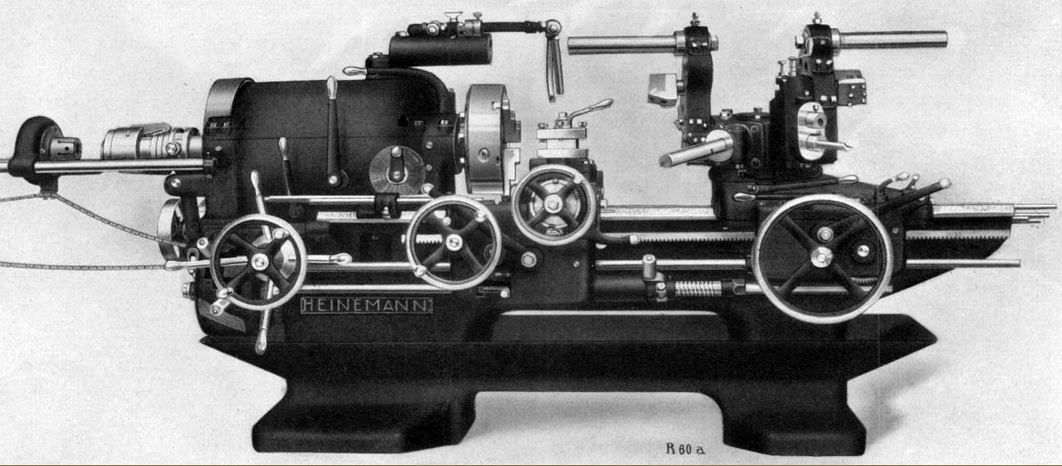 Heinemann turret lathe Type R-40 and R-50 with a horizontal turret and an all-geared headstock. The maximum diameter of bar that could be passed though the headstock spindle was, respectively, 40 and 52 mm, the centre heights 170 and 200 mm and the maximum distance between spindle nose and turret 170 and 200 mm. On all versions of the R-40, R-50 and R-60 the bed ways were chilled, ground and fitted with protective covers and the turret, on the R-50 and R-60, equipped with power feed. The headstock contained hardened gears mounted on shafts running in ball bearings.