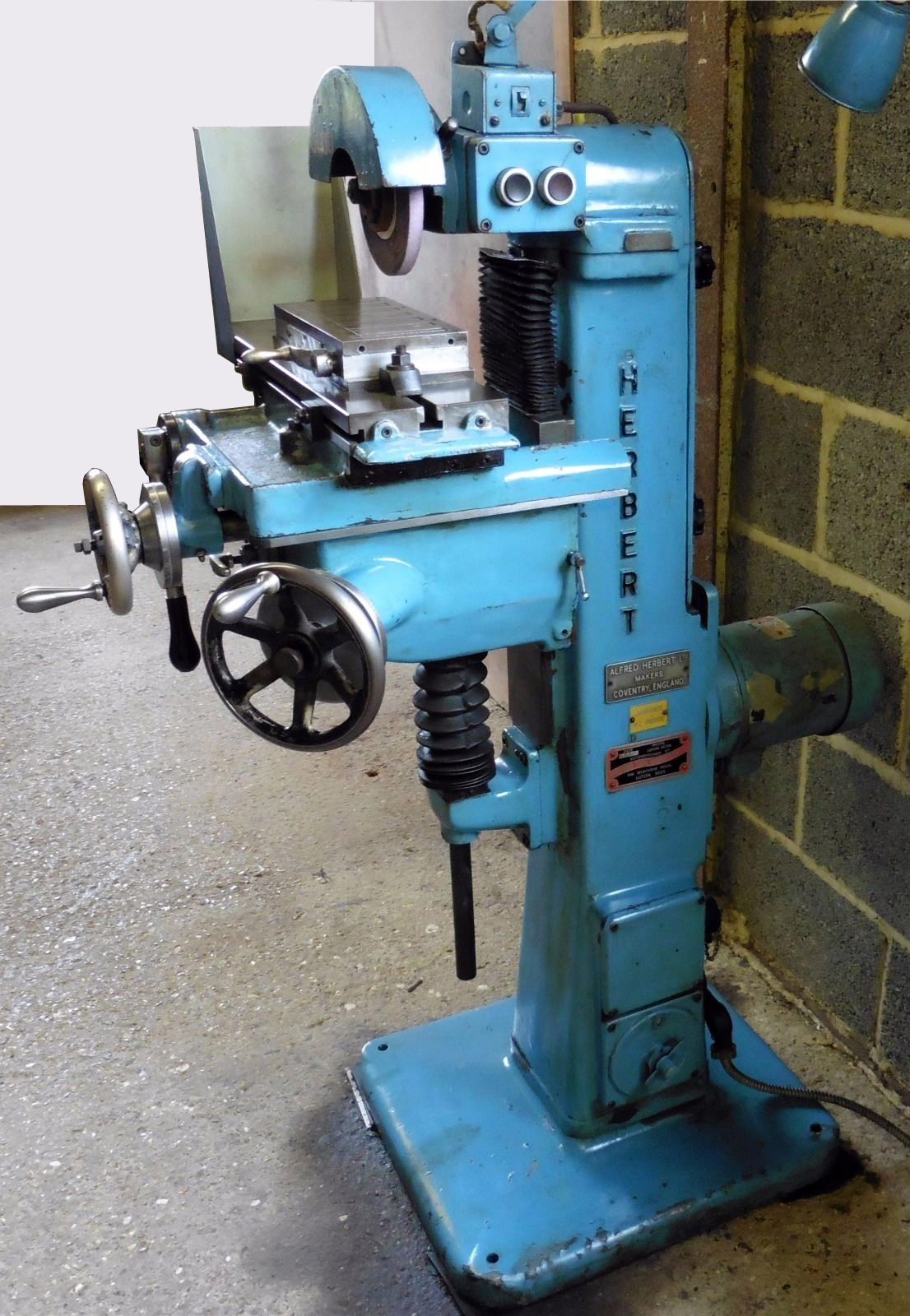 Less well known that the similar hand-operated Eagle, Capco and Superior machines, the Herbert "Junior" surface grinder first appeared during the 1930s (presumably to replace or complement the much smaller and rather old-fashioned "Ball-bearing Bench Surface and Die" machine) and continued to be listed (if not actually available) until the mid 1970s. Built in early and late versions, both had the same capacity: a table 21" x 6" (533 x 152 mm) with a single central 7/16" T-slot, a maximum longitudinal travel of 10 inches (through at one setting only 8 inches could be used) and a cross travel of 4 inches. Longitudinal feed was by rack-and-pinion gearing, the operating lever being adjustable on its ball-bearing-supported shaft with the mechanism sealed against the ingress of grinding dust, as was the cross-feed screw. The maximum distance from the underside of a 6-inch diameter grinding wheel was 9 inches and the vertical travel of the knee 9.5" (241 mm). Mounted on two V-way guides, the saddle was moved inwards and outwards by a large full-circle handwheel equipped with a large-diameter, adjustable micrometer dial. The knee assembly was elevated on a pair of V-ways machined into the vertical front surface of the main column, movement being controlled by hand-wheel working through bevel gears and a screw. A very large zeroing micrometer dial was fitted to the wheel to gauge the very important vertical movement. The only noticeable difference between early and late machines was the mass of the knee, the newer model having a much more substantial casting that held a supply of oil and a hand-operated, single-shot "Tecalemit" plunger pump. If the operator could be relied upon to use it, the pump directed lubricant automatically to all sliding and rotating surfaces of the table, saddle and knee. Intended to carry a wheel up to 6 inches in diameter by 0.75 inches wide, the spindle ran in grease-lubricated, matched-pair, precision ball races. Flange mounted against the machine's rear face and adjustable vertically to tension the belt, the 0.5 h.p., 2800 r.p.m. motor drove the spindle by means of an endless flat belt - the maximum recommended wheel speed being 3600 r.p.m. Electrical controls were all built in: the isolator switch was low down on the right-hand face of the column, push-buttons for stop and start carried on the right-hand side of the head and no-volt safety release and overload protection included. A useful range of of accessories was offered including a non-electric magnetic chuck by the Sheffield firm of Eclipse; a Low-Vo light unit; jig blocks for the grinding of Herbert "Chipstrean" box tools and Coventry dies; a radial truing device; a universal vice with dovetails and one plain jaw; a Universal Fixture for grinding tangential chasers; an attachment for the grinding of Fellows' gear shaper cutters; a "radial truing" device that allowed a diamond truing tool to be swivelled and a Herbert No. 1 "Tapconer" for the accurate grinding of the taper lead of taps. The Herbert Junior surface grinder occupied a floor space of 3 feet 3 inches by 2 feet 8 inches (991 x 813 mm) and weighed approximated 500 lbs (228 kg).