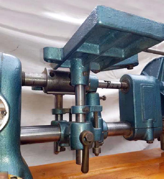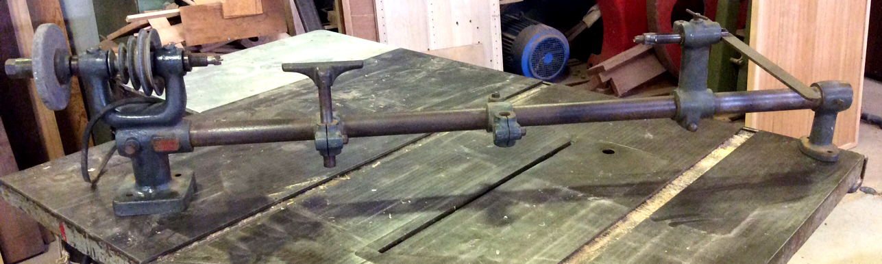 Manufactured by A.E.Herbert, a maker well known for their industrial machine tools including metal lathes (and some lighter wood-turning types), the "Home Workshop" was produced (almost certainly in small numbers) during the 1940s and 1950s. Similar is concept and size to the very successful UK-made Cornet Major, the Herbert was based upon a solid bar bed (like other lathes offered by the company) that allowed it to be used as a conventional between-centres wood machine or, by mounting a range of accessories, as a multi-function woodworking machine able to mount a circular saw, planer, thicknesser, long-hole boring equipment, a jig-saw assembly, a jig saw and undertake sanding and a myriad of other woodwork related tasks. One notable addition to the Herbert (and lacking on the Coronet) was the provision of what appears to have been an intermediated headstock assembly by which means the drive could be extended down the bed to accessories mounted towards the tailstock end.