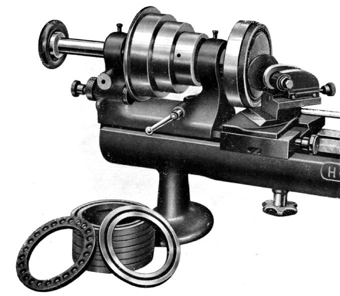 Famous for their very high-quality toolroom lathes, the English Holbrook Company, concentrated mainly on popular and hence profitable medium and larger-sized backgeared and screwcutting models - although they also made a superb, almost-Rivett-like precision bench lathe, the Model B No. 8 and it's companion, an advanced, electronically-controlled lathe introduced during the 1940s, a larger plain-turning lathe and the small, 31/2-inch centre-height by 161/2-inches between-centres precision plain-turning model shown below. The latter, designed using principles first established in American by Stark in 1862, when they had used scaled-up watch-lathe technology - both headstock spindle and bearings in hardened and lapped steel together with a flat-top, bevel-edged bed - to produce their much-copied and long-lived "Precision Bench Lathe." Thus, the little Holbrook joined a specialist, though crowded market, and one largely dominated by imports from the USA and Europe, amongst whom the better-known were: Levin, Bottum, American Watch Tool Company, B.C.Ames, Bottum, Hjorth, Potter, Pratt & Whitney, Rivett, Wade, Waltham Machine Works, Wade, Pratt & Whitney, Rivett, Cataract, Hardinge, Elgin, Remington, Sloan & Chace, W.H.Nichols, Crystal Lake and (though now very rare) Bausch & Lomb, Frederick Pearce, Van Norman, Ballou & Whitcombe, Sawyer Watch Tool Co., Engineering Appliances, Fenn-Sadler, "Cosa Corporation of New York" and UND. All these lathes were intended for use by both skilled operators turning and grinding one-off parts and (equipped with a range of suitable accessories) for small-batch production work. Hardened, ground and lapped, the 13/16-inch bore headstock spindle ran in adjustable steel cone bearings (a proven and economical way of providing high speeds and long life) and was driven by a 1-inch wide belt running round a 3-step cone pulley with diameters of 3, 37/8 and 43/4-inches. Two rings of indexing holes were drilled in the outer face of its largest diameter with an unusually robust indexing pin mounted eccentrically and able to be rotated in its housing to allow either ring of holes to be picked up instantly. There was no spindle thread and the only way of holding parts or accessories was by using collets or items (such as centres) mounted on a collet fitting. Continued below: (Read: An Apprenticeship at Holbrooks)