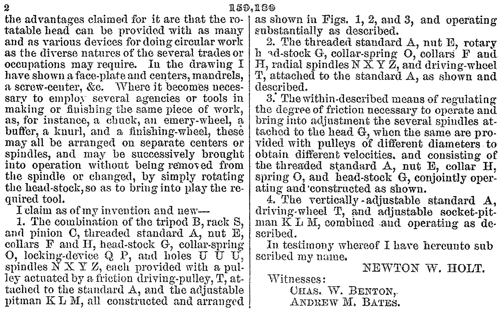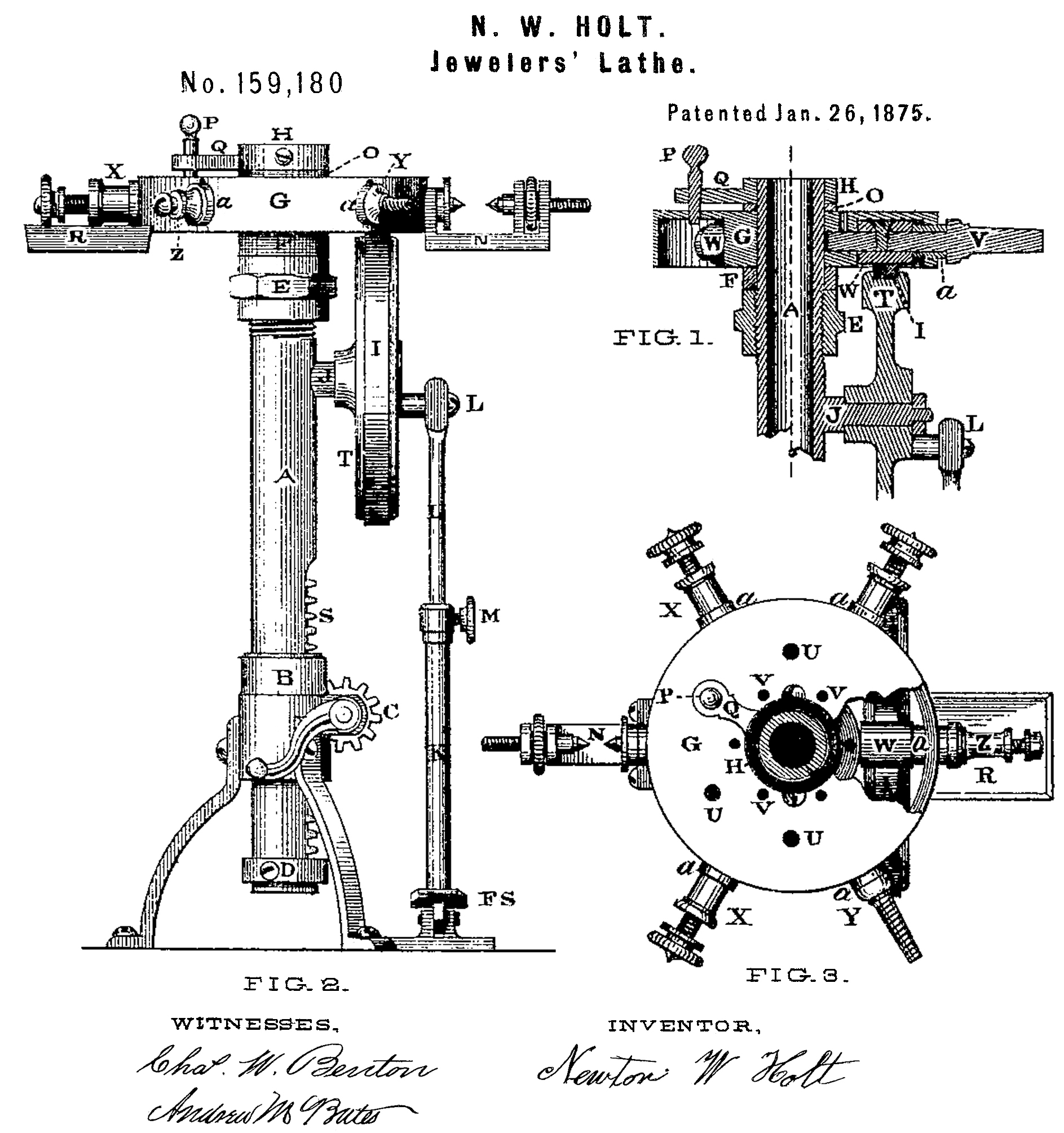Unique - and almost certainly never put into production or even, the writer would guess, built as a prototype - the Holt friction-drive watchmakers' lathe was an interesting but unnecessarily complicated and would potentially expensive to build.. Mounted on a rack-and-pinion, rise-and-fall column (A) the lathe had a large circular head (G) fitted with four spindles (N X Y Z) arranged around its periphery. Drive came from a treadle mechanism (FS) through a height-adjustable link to a large flywheel whose outer surface was covered with a friction band, in leather or some other material. Each of the four spindles was attached to a pulley, all of different diameters to give a range of spindle speeds. By rotating the head (G) until the required spindle was over the flywheel, and adjusting the flywheel up or down to make contact with it, the drive could be connected. A mechanism, using a handle and a pin (H, Q P) was provided to lock the head in place when the drive was connected with the pressure of the drive able to be regulated by a large nut (E) working against what was called a "rubber spring or cushion". One supposes that this device might have been handy if the spindles were other than just fixed centers - though of course it was possible for simple tools such as " a chuck, an emery wheel, a buffer, a knurl, and a finishing wheel" to be arranged so that a job could be passed from one to the other. Unfortunately, each time the job was moved, it was inevitable that the speed would need to be changed and the pressure of the friction wheel altered - a tiresome and inconvenient process..