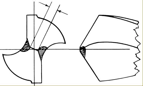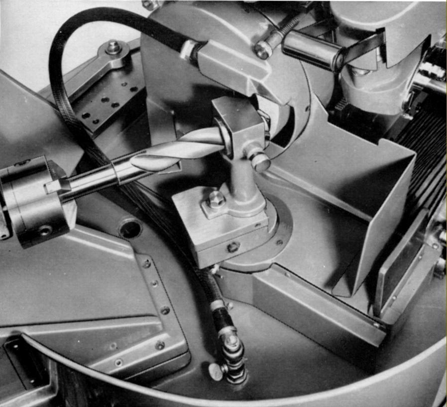 Manufactured by Herbert Hunt & Sons with works in Elsinore Road, Old Trafford, Manchester, the Hunt range of drill grinders were heavy, industrial machines and sold well for many decades. In addition to "Hunt" the machines have also been found carrying Churchill, Dormer, Herbert and Jones & Shipman badges. Although made in several sizes, all used the same, relatively simple operating procedure that allowed even unskilled workers (given just a minimum of training and a little practice) to produce good results. Early machines were numbered simply as the Types 0, 1 and 1A Standard (these versions being intended for two-lipped drills only); the No. 2 and No. 3 Universal (able to grind two, three and four-lipped drills); No. 2 and 3 Automatic (identical in ability to the Standard models but with all motions, including an in-feed to the drill, driven by a separate 3-phase motor - these varying in power from 0.5 to 0.75 h.p.) and the No. 4 Standard. By the 1950s the range had been renamed as the DG Series with models types including the DG2S, DG2A, DG3S DG3A and later still (reflecting metrication), the DG50 (2" capacity) and DG100 (4" capacity) automatic types, this latter pair differing from the original versions in having the grinding wheel instead of the drill holder set to oscillate. Often described as the "Hunt's Patent", the machine was carried on a heavy cast-iron base and consisted of a grinding wheel fitted to a belt-driven, ball-bearing-supported spindle with a compound slide assembly used to carry the drill holding table - the latter arranged to swing to and fro by hand on the Standard models and by motor drive on the Automatics. On the later DG50 and DG100 Models instead of the drill swinging it remained stationary, with the wheel head arranged to swivelling instead The reason for this change was several-fold: to increase the speed of metal removal without burning, to allow a wider range of point angles to be ground (from 80° to 180° - or beyond if used for trepanning points to drill thin sheet steel) and to obviate the difficulty of grinding very long drills when, as the drill-support table swung to and fro, there was a danger of the drill end catching a workman's clothes - or worse. With this new arrangement, the Hunt grinder could safely handle extraordinary long drills, up to 10 feet long or more. On all models the plain end of the drill was held in either a self-centring 3 or 4-jaw chuck (or a Morse taper for Morse-taper shank drills) with the end to be ground supported in a hardened bush - the latter not needing to be an exact fit as the drill only needed to be set so that it rested against the lower inside surface of the bush; a range of bushes was supplied in standard sizes with each machine. In operation the drill was revolved by hand through a system of gears and, by the swivel action of the drill-support arm, the same clearance was given to each cutting edge - this being adjustable to make the drill suitable for working through hard or soft materials. Bevelled corners were also generated, these being claimed to extend the drill's survice life before re-sharpening was required. Point thinning - the process by which the straight line formed where the flutes faces meet at the point of the drill - was cut away (thinned) at each side by a movement of the cross slide that brought the drill under a separate, narrow, thinning wheel carried on an extension to the shaft on which ran the main wheel. Drill bits used for heavy feeds often have much thicker webs than standard and are neither intended nor suitable for use without thinning; any drill with a web thickness greater than one-eighth of its diameter should be thinned. A demonstration of point thinning can be found here). A machine designed for a long life, all the slides were adjustable, the swivel slide - its surfaces were equipped with hardened steel inserts - turned on rollers and grease cups and oilers fitted where necessary. An essential element in the successful grinding of drills was an adequate supply of coolant, this being lifted from a tank within the base by (on early models) an impeller pump driven by a friction disc fitted to the spindle drive pulley - the latter taking its drive from either a built-in motor or arranged so that it could pick up a belt from overhead line shafting..