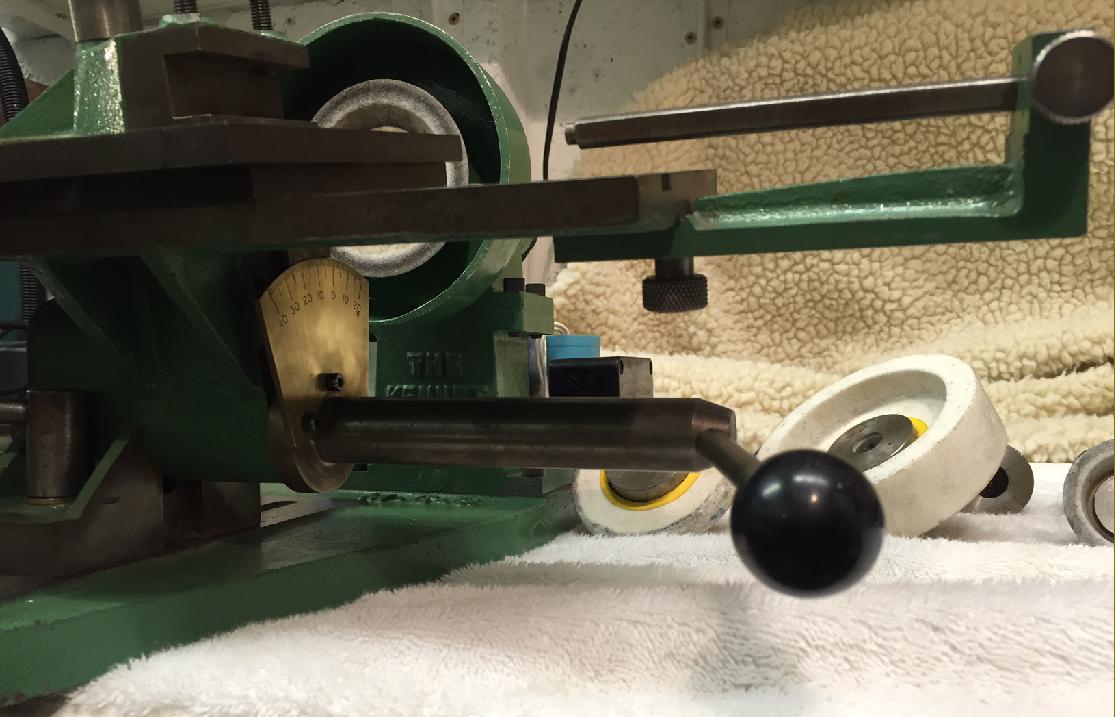 Produced by Model Engineering Services (proprietor Ivan Law and makers of the well-known Dore Westbury miller) the Kennet is a relatively simple machine and offered as an alternative to their very much more complex and difficult to build Quorn. However, despite its relatively straightforward design, the Kennet it is still a very versatile machine and can sharpen not only lathe tools but, with the right holders, slitting saws, end mills and slot drills - though it is not capable of handling the spiral flutes of the latter two, just their ends. Sold only in kit form, everything needed is supplied including iron castings for the base, table and intermediate table (now furnished surface ground) aluminium pulleys, bronze, two pre-formed and engraved protractor scales and length of belt material. Mounted on its cast-iron base plate the machine is built up from three elements: a grinding spindle running in sealed, angular contact bearings (preloaded by springs), a platform assembly on which can be secured the tools to be sharpened and an electric motor. While motor and spindle are fixed, the tool table is adjustable and consists of three parts: a support bracket, able to be slide towards and away from the wheel, and fastened to it an intermediated table that can be raised, lowered and tilted so as to provide the correct grinding angles and clearances. On top of the intermediate table is the tool-mount table, this being arranged to slide from side to side under hand control with an adjustable screw stop fitted at one end. In order to gauge tool angles, a large 180° protractor scale is rivetted to the table with, at its centre a stud used to secure various holders - including ones for lathe tools, endmills and slitting saws. Also provided is a rectangular block of steel, pivoting around the stud, against which turning tools can be held by hand. By juggling the position and angulations of the table and fitting a suitable grinding wheel, it is possible, with little effort, to grind extremely accurate profiles. Should you find a used Kennet without a motor (or one that is not working) it's vital to use the correct type: 1/6th h.p. running at 2,800 r.p.m. The more commonly available 1/4 h.p. 1450 r.p.m. can be used, but will need a larger pulley to get the right grinding wheel speed. Do check with the wheel maker what the correct speed is and, if in doubt, scrap those provided and buy new ones (there is also the danger that, unknown to you, the wheels might have been dropped or otherwise damaged and could burst in use). The unit shown below has no wheel guard; if yours is the same, the writer would strongly advise making one. A complete, well-written and profusely illustrated article about building a Kennet by John Baguley can be found here and sometimes units for sale here..