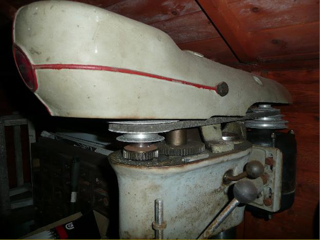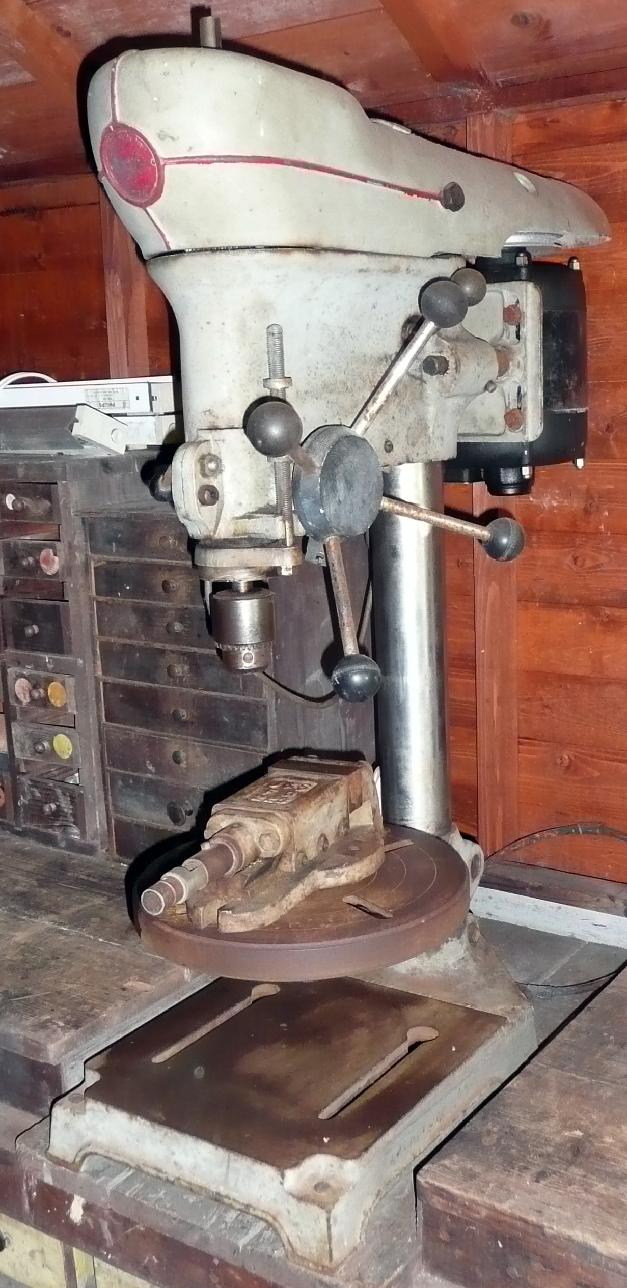 Kerry belt-driven bench and pillar drills were made, beginning in the late 1940s, as four models: the simple Cadet and Junior (shown here), the highly effective and compact Super 8 with its wide speed range and the Drillmaster (shown here), a small machine that had a full five inches of spindle travel - almost certainly the longest of any made, world-wide, in its size range. Especially well-designed and finished - and probably the smallest and most compact No. 2 Morse taper drill ever fitted with a "backgear" mechanism - the Kerry Super 8 was built in two models, an early Mk. 1 and a later Mk. 2, both made for either bench or floor standing - the latter in two versions one a Pedestal type with its round column reaching right down to the base plate and the other a Box Column, intended for heavier work, with a rectangular cast-iron support in place of the lower half of the column. Like most machines of its era (spanning the early 1950 to 1970s), the first version can be recognised by its rounded styling and the second by a much more angular appearance. Both were of a conventional layout with a 0.5 h.p. 1000 r.p.m. motor fastened to a platform at the rear that, in order to help tension the belt, was carried on a pair of spring-loaded, round bars. Drive was by an A-42 V-belt over 4-step aluminium pulleys, the assembly guarded by a cover that rose parallel to the top on hinged links; for safety reasons the cover was non-detachable and so unlikely that the machine would be used with the belt exposed. A split through-clamp allowed the head to be released and swung around, lifted or lowered; a head safety stop was provided in the form of a separate clamp-on ring immediately below it - this being formed into a handy if rather small tool tray on the floor-standing version. Fitted with a No. 2 Morse taper, the spindle was manufactured from a high-quality steel and ground all over. Its lower section ran in deep grove journal ball races with angular contact ones at the top to take thrust. Also ground all over, the Mehanite cast-iron quill had a travel of 5 inches, its centre line being 7.5" away from the inside face of the column. On the bench model the maximum distance from spindle nose to base plate was just under 17" and to the table 10"; on the floor models the two figures were, respectively, 49.5" and 39". Backgears were arranged just like those used on many lathes with the separate gear pair carried on an eccentric engagement shaft and a pull-out pin securing the large spindle-mounted bull wheel to the pulley; depending upon the year of manufacture, the gears ran in either plain or ball bearings. All versions of the drill could be had with high or low-speed drives: on the Mk. 1 the low range ran from 45 through 94, 169 and 287 r.p.m. in backgear and from 320 to 656, 1180 and 2000 r.p.m. in direct drive; speeds on the other model began at 86 r.p.m. progressing through 154, 260 and 460 r.p.m. in the reduction gearing and 617,1100, 1880 to 3360 r.p.m in open drive. The Mk. 2's speed range was very similar, though a little compressed - the slowest speed available being 54 and the highest 3000 r.p.m. With such a wide range available the Super 8 was capable of drilling holes from 1/64" to 3/4" in diameter - though if pressed, and with care, ones up to 7/8" could be managed. The slow speeds also allowed tapping, though the use of a self-reversing tapping attachment was recommended for safety and efficiency. Fitted as part of the standard equipment on the Mk. 1 was an 11-inch circular table carried on a solid bar that fitted into a socket on the support casting; able to be rotated through 360° it could also be tilted through 90° in each direction from horizontal and locked in any position. As an extra-cost option for heavier work the makers offered a particularly robust rectangular table; this had a working surface of 13.5" x 15" and carried 4 T-slots surrounded by a coolant trough; unfortunately, this is a rare item, and seldom found on used examples. On the Mk. 2 the round table and its special bracket were consigned to the options' list and replaced by an ordinary 11" x 11" rectangular type with two plain slots. Unlike the equally well-made Fobco Star drill with its heavy, solid steel column, that on the Kerry was made from a length of 2.75-inch diameter seamless steel tubing; this was hard-chrome plated, using the patented "Fescolized*" process, and ground to fine limits. The result was a finish that allowed the table to be slid up and down easily and locked solidly - while also providing an effective rust-proof coating. Cosmetically all versions were very pleasing with the main castings finished in either a cream or blue enamel and all handles chrome plated. The bench version was around 37" high, 14.5" wide, 27.75" front to back and weighed 200 lbs (91 kg); figures for the column model were, respectively, 71", 16", 31" and 260 lbs (118 kg). *A patented system using cadmium, chrome or nickel for direct electro-deposition onto the base metal. The process is also known to provide effective rust-proofing and has been widely used in the aircraft industry. Other drills - some useful links: For a high-quality, heavily-built, versatile yet compact drill with a wide speed range and torque-enhancing reduction gearing within the head the choice is simple, one of the following: the superb Meddings Pacera MB and MF models and the equally useful Fobco 7/8 and 10/8, Boxford PD8, Progress 2G and 2GS and late models of the Kerry Drillmaster 3/4". Also in contention would be the rarely-found 10-speed Startrite Mercury with its epicyclic gearbox mounted around its spindle nose. All makes and models were available in both bench and pillar for, some of the latter with more strongly constructed "box column" supports in cast iron. Standard bench and pillar types For a lighter, less expensive type - the ones with head-mounted reduction gearing always command a premium price - the same makers listed above also offered a