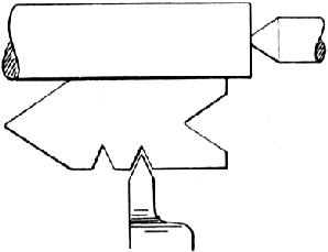 Forming Threads by Hand: It is possible to generate threads on a revolving cylindrical surface without using mechanical assistance by employing a "chaser". These look rather like wood-turning chisels with a "thread form" cut into their end or side faces and are made from hard steel - tool steel for the finest-quality ones - and vary in width and thickness according to their thread pitch and job they have to do. The full-sized type are normally fitted to stout wooden handles to give the necessary purchase (which can be considerable) and are expensive. However, there is a cheaper alternative, the chasers that come from automatically-releasing die holders; these units are used on capstan lathes and hold four small identical sections of tool steel formed with a very accurate thread along one edge. If these are removed and mounted in a suitable metal holder they can be used exactly like their full-size cousins. Unfortunately, using either type is difficult and beginners are well advised to avoid them completely - although they can have a role to play in "cleaning up" a mechanically-cut thread and imparting a radius or other shape to the crest and root of the thread, a process not possible with the single-point thread generation method described above. In use the chaser is rested against a suitable support - with some lubricant between the two - and fed into the workpiece on centre height with a steady sliding motion. Continued below: