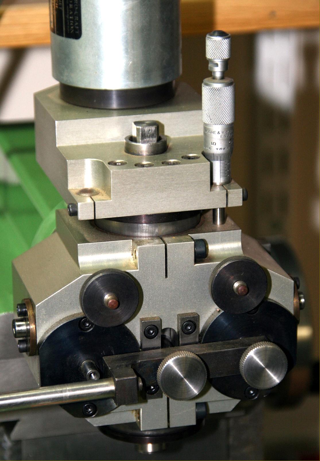Manufactured by Boley & Leinen, Werkzeug-und Machinenfabrik, Postfach 64, 7300 Esslingen, Germany the "Leinen" FM1 Micro-precision Miller/Driller was a super-accurate machine intended for the finest and most delicate of work in research and development laboratories. It was designed along the lines of a European-style universal precision miller as produced by, amongst many others, Schaublin, Thiel, Deckel and Christen where a T-slotted (330 mm x 128 mm) vertical table - with movements vertically and longitudinally (left to right) - was used to mount a (300 mm x 130 mm) right-angle work table of either a plain type or one that could be pivoted forwards in the longitudinal direction and to both sides in the traverse. To provided a traverse movement the overarm was arranged to move forwards and backwards and carried either a horizontal or vertical milling head. With a table travel of just 1 mm when turned once, the table feed screws were of a very fine pitch and carried scales engraved with 0.01 mm divisions; they drove the 300 mm x 130 mm table through a vertical travel (Z axis) of 130 mm, a longitudinal (X axis) of 180 mm and the overarm through 90 mm (Y axis). All the table and head movements could be run under power from rather complex electro-mechanical drives that gave very useful, infinitely-variable feed rates of up to 30 mm/min via a separate control box. Powered by a variable speed 170W, 36 Ncm torque DC motor, the vertical and horizontal spindles had a maximum speed of 10,000 rpm and carried original-type Boley & Leinen WW Type a31 collets with 8 mm shanks, a maximum through bore of 4.4 mm and a blind capacity of 7.0 mm Although the FM1 was relatively compact - just 520 mm long, 500 mm wide and 800 mm high - it was very heavily built with rigid, thick-walled castings and weighed 120 kg in basic form - or 140 kg when fitted with the optional electrical and electro-mechanical drives and a 3-axis digital read-out. Another interesting Leinen machine was a precision miller/driller/jig-borer made until the 1940s and based on Wolf Jahn designs as originating in the 1800s..