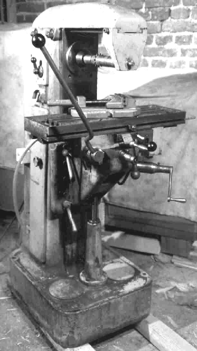 One of many types of milling machine produced by the well-known German Company of Malick & Walkows, (believed to have been manufactured in Berlin-Marienfelde) the first machine shown below is a 1940-built horizontal type that looks to have been a very carefully designed, well-built and thoroughly workmanlike little machine. It was available with a plain (non-quill feed) vertical head and, instead of being a round bar, as on so many contemporary light millers, the overarm was properly dovetailed into the full width of the main body and locked with two heavy bolts pulling up against pronounced bosses. The table was provided with a deep recess between the T-slots and the edge, helping to funnel coolant back into the storage tank - this being formed in the bottom part of the column casting. Longitudinal travel was by both screw feed and a quick-action rack - the latter operated through a lever of extraordinary length; the bolts used to lock the knee position were at the extreme top and bottom of the casting and fitted with man-sized handles. The spindle was driven by a 4-speed belt drive from a Siemens 2-speed, 3-phase motor.