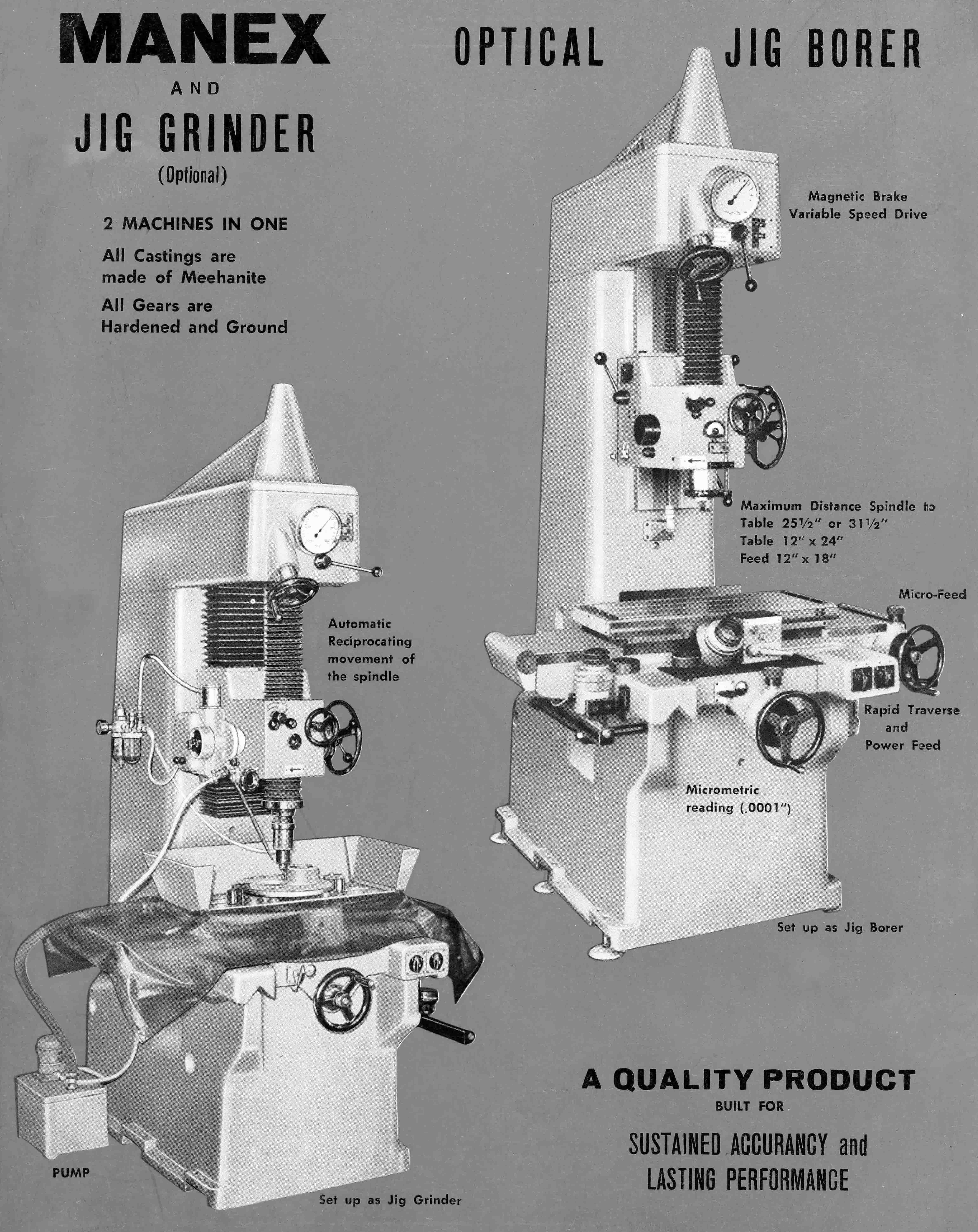 Manufactured from the late 1950s until the late 1960s, the origin of MANEX Jig borer/Jig grinder is a mystery - for in none of the writer's directories of Italian machine tool makers which span that period does the name MANEX appear. With importation into the U.K. organised by P.M.T. Machine Tools Ltd. from their offices in Oozells Street in Birmingham, it is known that the name MANEX was also applied to milling machines with examples of those, and jig borers, also being found in the United States. From the original photographs in the writer's collection (three are shown below), it appears that the maker's bade was screwed on - hence, there is a chance that the name would have been a marketing exercise by one of the better-known makers of milling machines in Italy at that time, perhaps Izeta, Bandini, Omega jig borer, Rambaudi, - though perhaps the best guesses are Induma and Riva as the rectangular style and font used on all the badges is so similar.