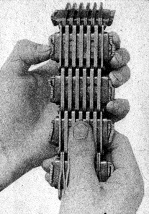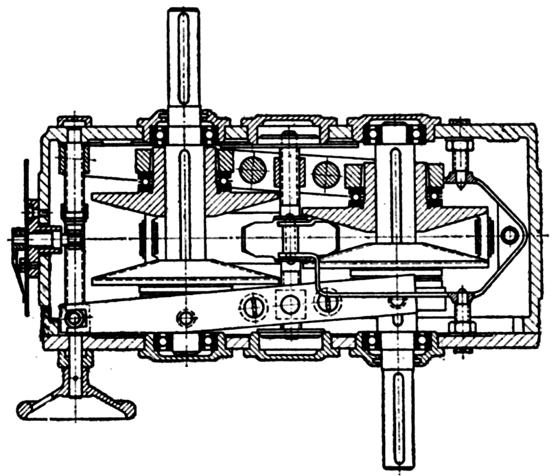 Hahn & Kolb were not manufactures, but a large German machine-tool organisation not dissimilar in many respects to the English Herbert Company who factored and distributed those from many other companies - in some cases forging so close an alliance with them that the machines lost their original identity and were badged Hahn & Kolb instead - this being the case with the "Variomat" miller manufactured by Metallwarnfabrilk Mylau Built in 1937, the first example shown below was based on a design that was to become popular throughout Europe* - and as originally developed through the contemporary Thiel 58, Maho SK250 and Deckel FP1 types. A rare machine, and almost certainly sold only in continental Europe, the early Variomat was fitted with a 2-speed, 3-phase (1 kW, 1500 r.p.m.) Siemens motor that powered two infinitely-variable-speed "gearbox" units by PIV (a maker still in existence) - one connected to the spindle and the other to the table drive. In the diagram below can be seen two sets of 4 conical expanding and contracting plates marked REGELTRIEB - these provided the alteration in ratio as they opened and closed. Whilst for lower power applications an ordinary "rubber and canvas" belt is used on this sort of drive this version employed conical plates with "teeth" - the belt being replaced by a special steel chain that could mate with the pulley indentations. The spindle variator worked through a safety-overload clutch, and completely integrated into the body of the machine; that for the table was similarly clutch protected though easily dismounted for maintenance. The system gave two speed ranges: low from 50 to 260 r.p.m. through a reduction gearbox and high from 250 to 1200 r.p.m in direct drive. A dial on the side of the column showed the various setting with the upper window displaying the cutting speed in m/min (depending on the milling cutter diameter - the words Schnittgeschwindigkeit and Fraser D can be made out) and a lower aperture giving spindle revolutions per minute (umdrehungen). A separate window displayed the table-feed rates - these varying from 10 mm/minute to about 120 mm/minute. Interestingly, the motor was switched on by a lever (Motor Ein) not a push-button, with a second lever (Getriebe Ein) to engage the spindle-variator clutch. The latter was spring-loaded, and required some force to move, the clutch engaging gradually across the arc of movement - in the manner of a car or motorcycle type. There was also an Einrichten position by which means the engagement could be "tuned". Once running, the setting of each variator was independently altered by separate 3-spoke capstan handles on the right-hand face of the main column. Apart from the ingenious drive system, the miller was conventional for its type and of the standard German design, a Universalwerkzeugfräs-und-Bohrmaschine (all-purpose tool milling and drill press). It used a vertical head that could be driven across the top of the main column (by a handwheel working through reduction gearing) to provide the in and out feeds. The knee, which moved from side to side and vertically, was fitted with a vertical T-slotted surface able to mount several different tables - plain, plain-tilting and compound swivelling. Control of the table's movements was by the popular joy-stick method that, as on similar models, may well have been able to engage (deliberately) both vertical and lateral feeds simultaneously. Fitted with a No. 4 Morse taper spindle running in a large front bearing of bronze, and a rear roller bearing backed by a separate thrust race the vertical head was a substantial affair. However, unlike most competing machines, the head on the Hahn & Kolb did not have separate upper and lower parts where the top could be removed and replaced by a different type - noticeably one to support an overarm to convert the miller into a horizontal model. This latter conversion was achieved, instead, by replacing just the end of the head with a boss - into which were socketed two steel bars that acted to hold the drop bracket. Almost certainly other types of head must have been offered - including self-contained high-speed models - for it is unlikely that the makers would have so limited the usefulness of the machine by not doing so. The Variomat had a long production run, from the 1930s until the early 1970s when competition from Maho and Deckel finally saw it off. If you have a Metallwarnfabrilk Mylau Variomat the writer would be pleased to hear from you..