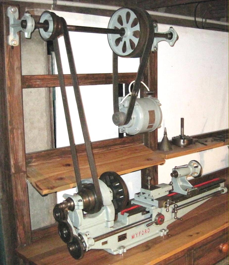 Never available from the factory - but Myford's idea of the perfect installation for an early ML2/ML4. Although there is no way of easily adjusting the tension of the headstock drive belt, the motor is fitted mounted on a frame that allows it to pivot - its weight applying the required tension