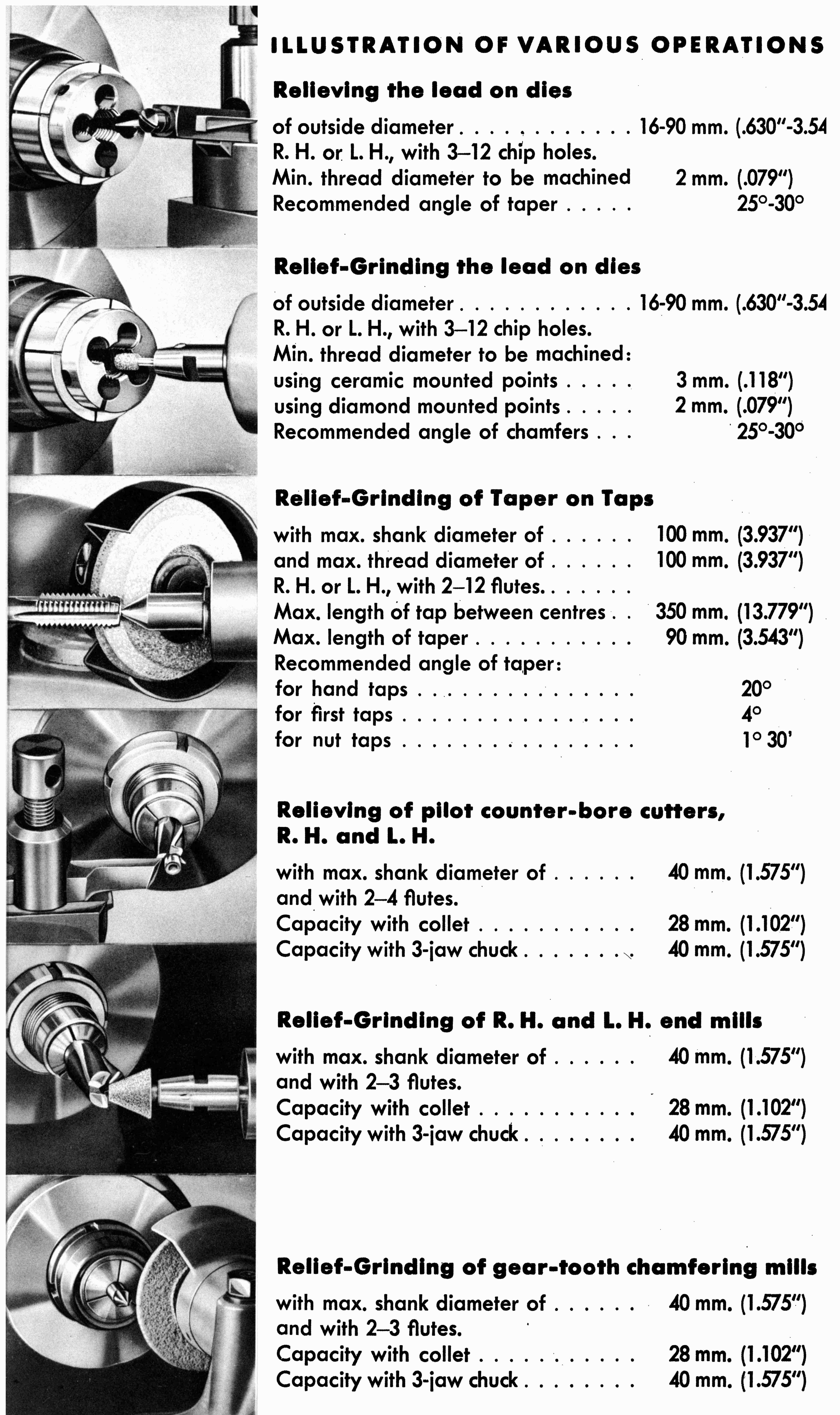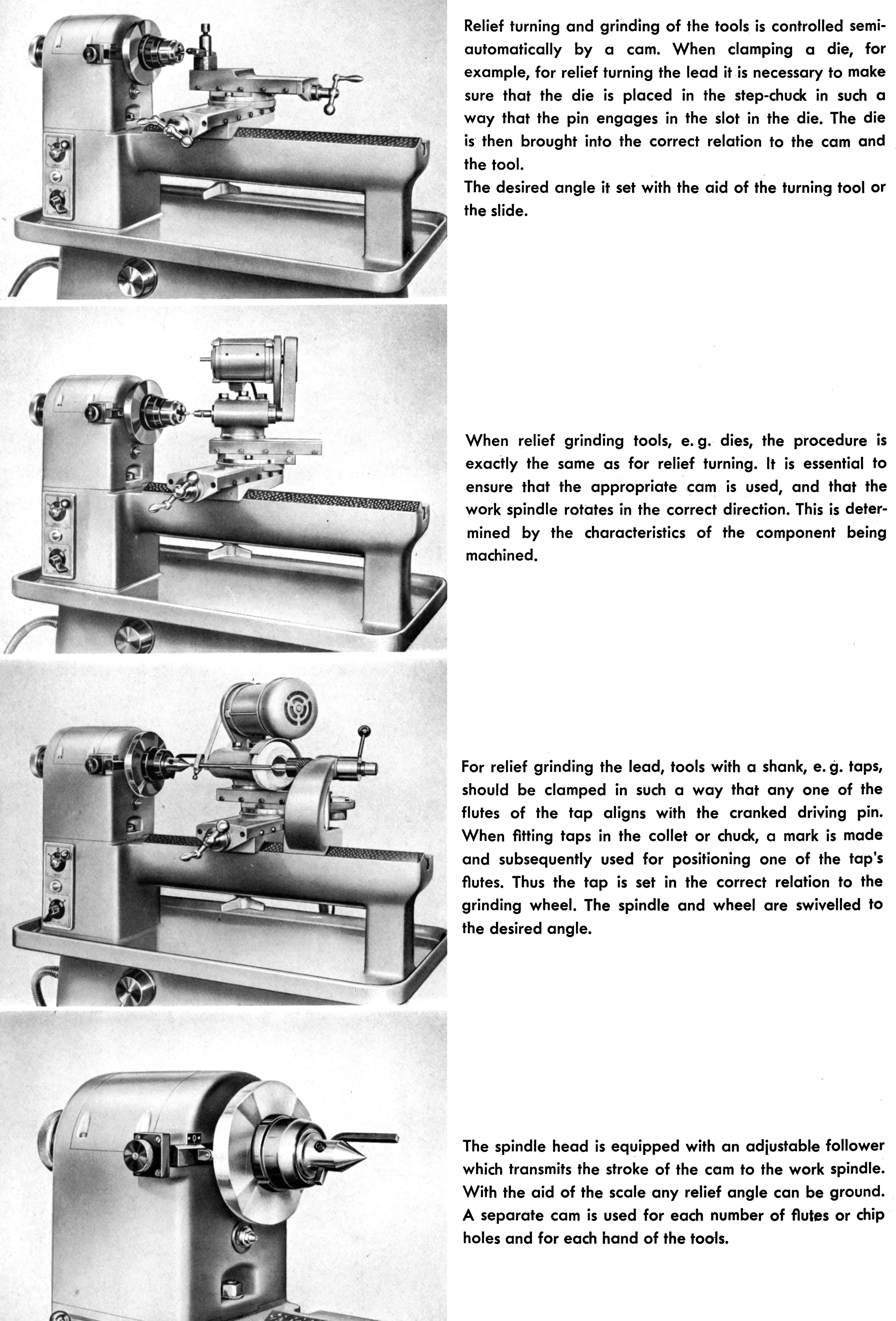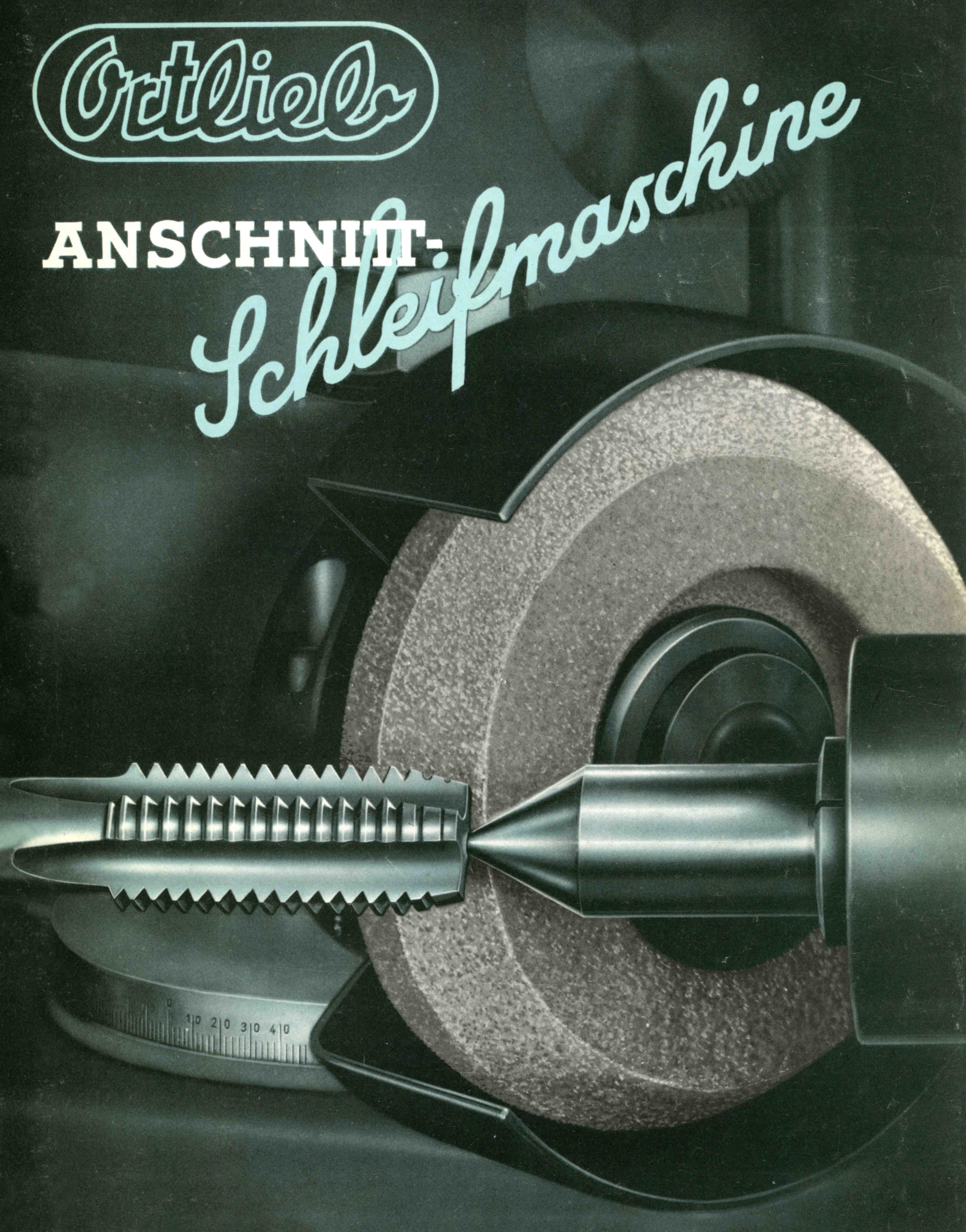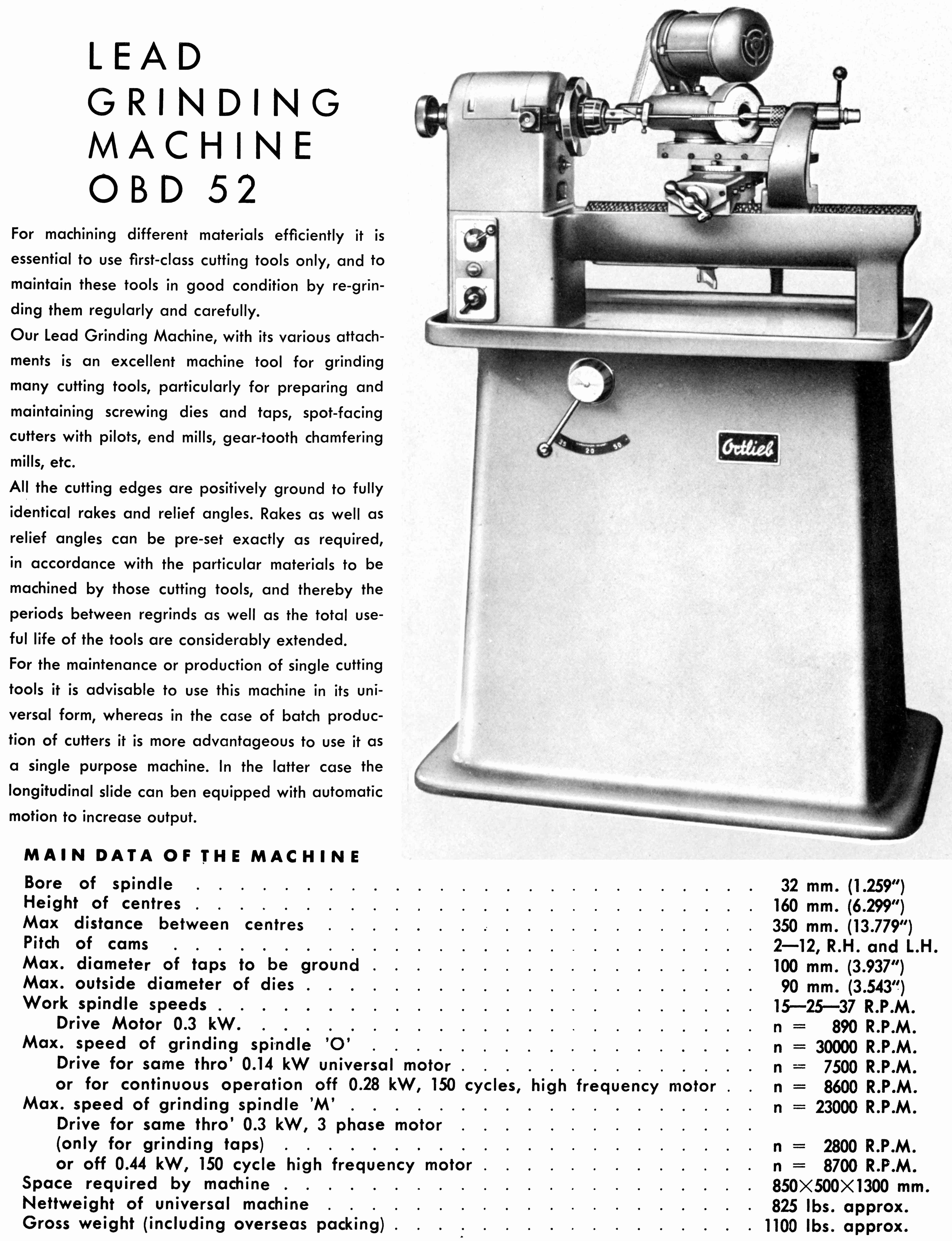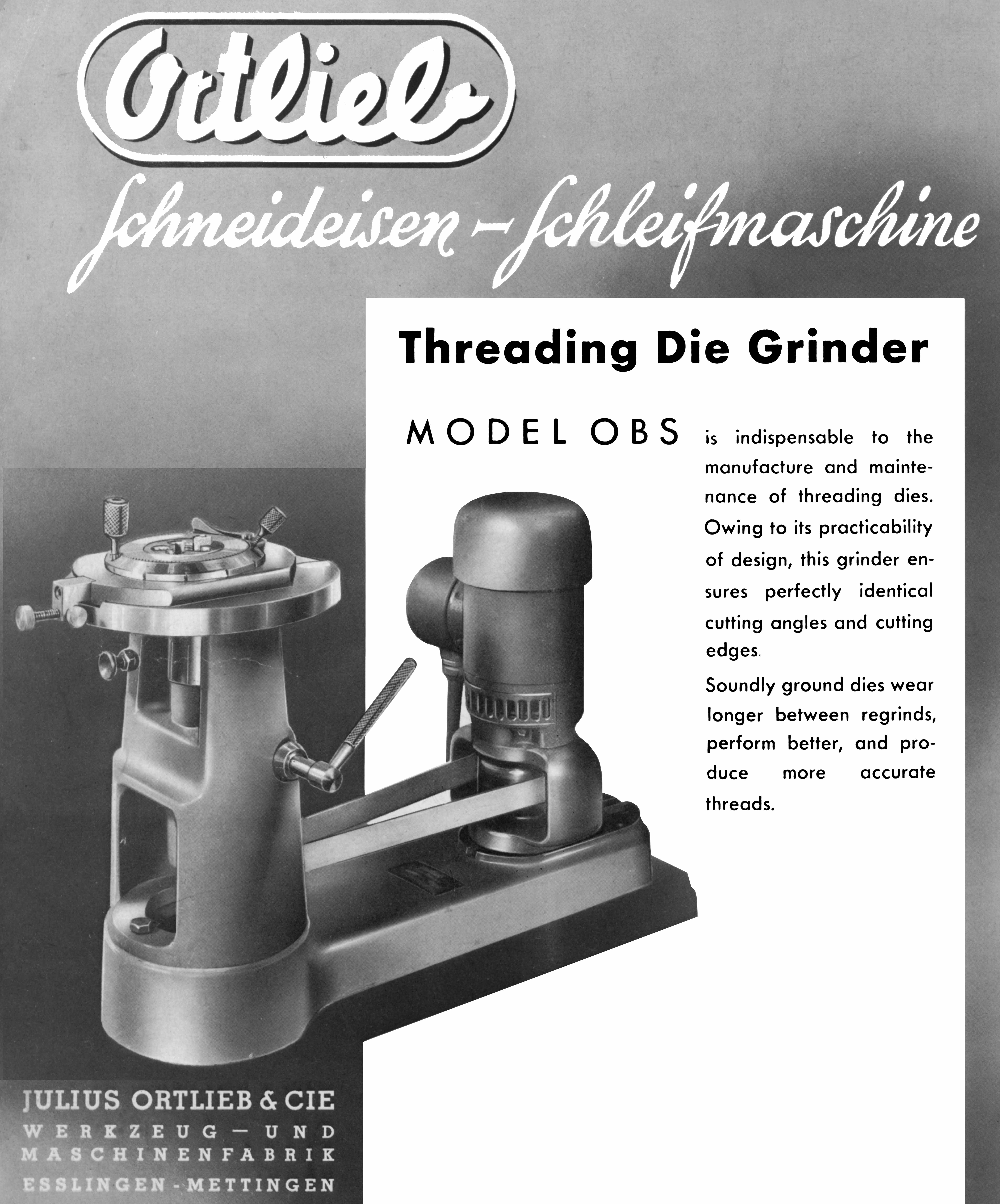 Made by Julius Ortlieb & Cie. Werkzeug-und Maschinefabrik of Esslingen-Mettingen in Germany from the 1950s until the 1970s, these two specialised machines were listed as the OBD52 chamfer grinder and the OBS die grinder. 'Anschnitt' the chamfer or lead (the tapered edge before a thread or cutting edge); 'schleifmaschine' a grinding machine; 'Schneideisen' as in threading die, and 'Schneideisen-Schleifmaschine' a die grinding machine. The Ortlieb Company was founded in 1911 in Esslingen-Mettingen and was led by its owner, Julius Ortlieb (1902-1991). In post-WW2 records, the firm was listed as "Ortlieb, Julius, Werkzeug- und Maschinenfabrik, Esslingen-Mettingen," and concentrated on precision work holding and tool-holding equipment, especially collets and chucks. In 1965, they introduced a new form of collet, the Rubber-Flex RFC multi-range type of an ingenious rubber-bonded, steel-segment design. This might have been an attempt to circumvent the English Crawford-Burned Multi-size collet patent that allowed inch, metric, slightly oversize, and slightly undersize barstock to be held. However, while the Ortlieb collet was limited to an adjustment of ±1 mm, the all-metal (and still available) Burnerd has a gripping range of 3 mm, with an extended range of 2.5 mm above and below each nominal size, for a total range of 3.7 mm per collet. From its introduction, the Burnerd was available with either key or quick-action lever operation and with several different mounting options. In 1967, Ortlieb was to produce another type of collet, the QUADRO, this being available in quick-action lever-operated and dead-length variants. Today, in 2025, the Company is ORTLIEB Präzisionssysteme GmbH & Co. KG, a machine-technology company that still makes collets, chucks, and linear-motion products..