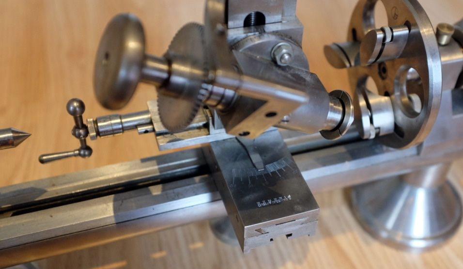 Based in Firenze, Italy, Panerai & Figli were known originally as specialists in the manufacture of instruments for the Italian Navy; today the Company is owned by a Swiss luxury goods organisation and produce expensive, high-end watches. Although a nation with a long tradition of high-class engineering, few Italian-based makers of specialist miniature precision machine tools are known. However, the Panerai was an exception, and a translation of the introduction to maker' brochure (circa the 1950s to 1970s) summarizes the Company's "philosophy" in regard to their machine tools : Our high precision lathes are built along the most modern processes of mechanical technology, with scientifically chosen materials and are treated in every single component. The modern high-class machine tools of our plant, the special devices, the exacting tests of every single part, allow us to build flawless lathes with perfect interchangeability, able to withstand every kind of comparison with the best foreign production. The metals used to build our lathes are appropriately seasoned, in order to be completely stable before the finishing steps are completed. We can, therefore, affirm that to produce our lathes we studied each element of the building in detail, in order to obtain a really high-class product, that would be the pride of the Italian industry. Beautifully finished, the lathes were built entirely in-house with even the nickel and chrome plating performed on-site to ensure, as the brochure explained, the best execution to avoid damage to parts in this delicate operation. On the headstock, tailstock and cross-slide the nickel plating was given an attractive "brushed" finished that, unfortunately in photographs, can look rather as though it's been "sandpapered". Two models were offered, both of traditional pattern: the G.P.1 a WW (Webster Whitcombe) model with a flat-topped, bevelled edged bed and G.P. 2, a much lighter Geneva type with a round, cantilever-form bed with a key-way guide running along the underside. Of 50 mm centre height and taking an 8 mm collet, the G.P.1 could be had in two bed length of 300 or 400 mm that gave, respectively, 80 and 180 mm between centres. The 40 mm centre height G.P.2 could be fitted with headstocks to take either 6 or 8 mm collets and was offered in bed lengths of 200, 250, 300, and 400 mm giving between-centres capacities of 50, 100, 150 and 250 mm. Supplied in boxed sets, three versions of the G.P.1 were listed from the basic G.P.1/8/A (with a hand T-rest, a screw-feed tailstock barrel, collet tube and a single 3 mm collet to), the G.P.1/8/B with a much greater range of equipment and the comprehensively specified G.P.1/8/C that included a compound feed-screw slide rest, a set of wire and stepped collets, 3-jaw ring scroll and 6-jaw chucks, carriers, a pivoting and self-centering drilling attachment, a Jacot drum, box and wax chucks and various runners, etc. The G.P.2 was also offered in three boxed sets: the basic G.P.2/6/A, intermediate G.P.2/6/B and top-of-the-line G.P.2/6/c. Also available as a self-contained unit, the G.P.1 could be supplied complete on an iron-framed under-drive stand with a wooden top that featured a most unusual let-in accessory tray covered with an unbreakable plate-glass cover - and two storage drawers in the front. The motor was controlled by a rheostat - giving variable-speed drive - and supplied with the unit was an integral "overhead" (to power grinding and drilling spindles mounted in place of the toolpost) an articulated-arm light unit (not illustrated) and a dust cover. For both models, the usual wide range of accessories was offered with most, including the collets and chucks, made by Panerai. These including wire, fir-tree and cone collets; box and wax chucks, 3-jaw chucks with ordinary and reversible face jaws, 4-jaw and 6-jaw chucks; lantern and wheel chucks, emery wheels, a carrier chuck, hand T-rests, carriers, Jacot drums, tailstock runners, safety pulley, self-centring drilling and pivoting attachments, faceplates with pump centres and dogs (clamps), quick-set toolposts, etc..