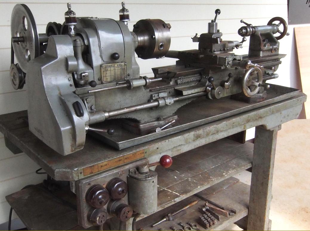 Home-made in Australia by a gifted engineer, Frank Parr, this 4.5" x 24" backgeared and screwcutting lathe was constructed to facilitate the building of a model Ruston Hornsby 11GG horizontal gas engine. Not only was the lathe home-built but so were all the wooden patterns, including those for faceplates and chuck backplates, the parts being cast in a local foundry A well-thought-out design, the lathe also exhibited a fine build quality and remarkable attention to detail. Based on the popular style used by many English makers of small lathes, the flat-topped, 60° V-edged bed had a gap that was carefully proportioned to give the maximum possible capacity yet minimise, as far as possible, the need for a 3-jaw chuck be to overhung on the spindle nose. Fitted with plain bearings (secured by 2-bolts caps and lubricated by drip-feed oilers), the headstock was of conventional layout with a rear-mounted 4 : 1 ratio backgear assembly held on an eccentric engagement shaft and the spindle fitted with a 4-step pulley to take an A-section V-belt. Drive came from neat, cast-iron countershaft unit, the belt tensioned by a lever working against a cam. A 2-speed (split-phase) motor was used, running at 1440 and 960 r.p.m. that gave, in conjunction with backgear, twelve spindle speeds of: 50, 70, 80, 90, 100, 120, 140, 180, 260, 350, 400, 460, 520, 600, 680 and 900 r.p.m. Remarkably, for a home-produced machine, all moving parts - backgears, changewheels and belt run - were guarded by neat, closely-fitting cast-aluminium covers. Screwcutting was by a train of changewheels, the drive passing through a tumble-reverse mechanism to the twin leadscrews. Gears were held on a forked bracket clamped in place by a lever that allowed quick and easy repositioning when the ratio needed changing. The reason for employing two leadscrews is uncertain, though as the two were geared together and so ran in opposite directions, it was possible when wanting to reverse the direction of a cut (instead of having to stop the lathe and operate the tumble-reverse lever) to keep everything running and simply engage the appropriate clasp-nut lever on the apron. Of ordinary design the compound slide-rest assembly had a T-slotted cross slide with the outer end of its feed screw carried in a Boxford-like bolt-on extension tube - the design enabling the slide to pass over it and so extend the travel when milling. Able to be rotated through 360°, the top slide was retained by pusher screws acting against an inverted cone - as used for decades on the South Bend 9-inch lathe. Gib strips on the cross and top slides were of the conventional push-screw-adjusted type but the saddle was adjusted to the bed by a tapered type - not the easiest of things to machine and get "just right". Each slide was provided with a handy lever-operated lock, the stems being serrated along their length to aid grip with oily fingers. Fastened to the face of the headstock was a long-stem, micrometer-adjusted carriage stop; however, though a neat installation, its location meant that (unlike a bed-clamped unit), it was only useful when working relatively close to the chuck and could not be repositioned to help with work being machined at the tailstock end of the bed. When the lathe is in the hands of its new owner, the writer hopes to add additional technical details. Some pictures are high resolution and may take time to load