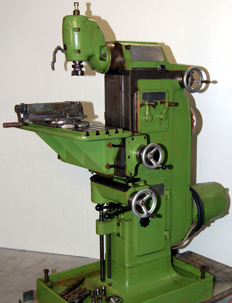 With thanks to "Greg Q" who provided the chronology for the following: In 1923, two mechanic brothers, Felix and Louis Perrin, started a workshop at the "Corner of the Mill" in Moutier, Switzerland, naming their new enterprise after themselves and producing, first, cutting stamps for timepieces as well as being involved in the local watch-making industry by modifying and repairing watch-makers lathes and developing a rolling machine with pivoting clockwork gears. After some difficulties due to high unemployment in the area, they moved, in 1929, to Rue de la Gare in an old barn that was transformed into a mechanical workshop. Despite the harsh economic times some success was achieved with automatic coin sorters, a milking machine, a continuously-variable automobile transmission and the manufacture of jigs and spare parts for armaments - including templates and components for the Lebel rifles used by the French Army. In 1939, the company status changed from a limited partnership to a company: Perrin Frères SA. With the advent of WW2, the decision was taken to manufacture machine tools: first ordinary drill presses, some with compound tables (the model TX-25) then a universal milling machine, the PF1. However, it is reported that Deckel, in Munich, makers of the FP1, objected to the name and it was renamed the U1. The miller was offered in two sizes, the U-0 and U-1, and also marketed by "Christen" (the latter version, in its later form, appearing to have been the more popular). The machines were built in early and late types, with little changed in the way of mechanical specification save for the introduction of infinitely variable-speed drive and the use of a box-form base housing. The following is a copy of the text on the Christen page: Better known in later years for their beautiful tool and cutter grinders the Christen Company of Berne also manufactured larger machine tools amongst which the pre-war designed "Dan" lathe and their universal Type U-O millers are probably the best known. The latter machines, built by Perrin Frèress S.A. of Moutier (ands sometimes sold with Perron Montier and Perrin Freres s.a. Moutier badges) were typical of the precision universal millers that became popular from the late 1940s onwards. During the 1950s and 1960s, very similar machines were introduced by a number of European manufacturers* with some being indigenous designs (that merely followed the general concept) while others were a direct copy of the most successful model of all, the Deckel FP1. The secret of the type's success, and the reason so many versions were built, was its ability to mount a number of different heads (horizontal, vertical, high-speed and slotting) in combination with a variety of tables (plain, plain-tilting and compound swivelling). By juggling this combination of options, and utilising other accessories, a skilled technician was seldom defeated in his attempts to produce the most complex of milled components to a very high standard of accuracy. Details of how the Christen miller was constructed and its drive system arranged are interesting: the top of the main column was machined as a slideway to carry a separate housing that doubled both to carry a horizontal spindle and act as a mounting for the various heads. The chrome-nickel alloy spindle was case hardened and ran in two taper roller bearings at the front and one journal bearing at the rear - an arrangement that provided both excellent support and an easy means of making adjustments. To solve the problem of how to drive the spindle when its housing was moved backwards and forwards (to provide lateral travel to the cutter), a long fixed gear was mounted parallel to and underneath it on the final-drive shaft and the upper gear allowed to slide along it. The spindle-mounted gear also drove the various heads that bolted to the top of the sliding housing. Early models had 2-speed motors and their spindles gear driven, from a box held within the main column. However, like its Swiss-built competitor, the Schaublin 13, later versions were fitted with an infinitely-variable speed drive by expanding and contracting pulleys; this arrangement, powered by a single-speed 2 h.p. 2800 r.p.m. 3-phase motor, gave the final output shaft a speed range from 60 to 2500 r.p.m. A gearbox was also incorporated (containing hardened gears and operated by a handwheel on the miller's left-hand face) that gave a low-speed range and enabled (for the size of machine) larger-than-usual cutters to be used at unusually high rates of metal removal. As standard, the miller was equipped with just a simple prismatic overarm with a bronze-bushed drop bracket and a hardened and ground No. 30 INT milling arbor - this being available in three sizes to accept 1-inch, 3/4-inch or 1/2-inch bore cutters. The two smaller arbors were provided with a sleeve on their end bearing surface to fit inside the drop-bracket bearing, the smallest being 110 mm long against the 145 mm of the other two. With the assembly in place the maximum diameter of cutter that could be mounted was 150 mm (6-inches). Catalogued by the makers as their Part Number 12, the standard vertical milling head carried a No. 30 INT nose fitting. The front section of the unit could be swivelled 90-degrees from either side of central and, although there was no quill feed as standard, this could be provided by an accessory kit that gave a lever-action drilling feed. The head was driven at a 1 : 1 ratio by the output shaft and so had exactly the same speed range - 60 to 2500 r.p.m. - as the horizontal spindle. The maximum clearance between spindle nose and table was 325 mm, the minimum 12 mm - while the centre line of the spindle could be moved as far as 277 mm from the front face of the column, or brought as close as 127 mm. Continued below: