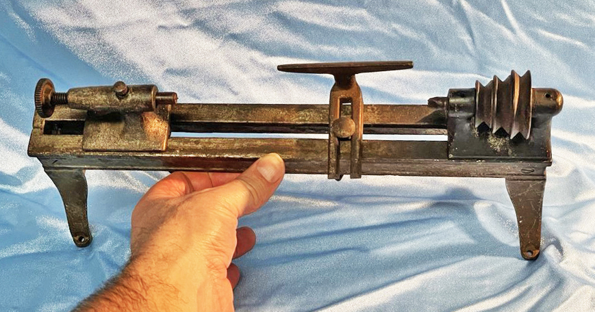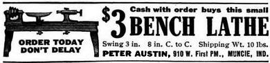 Made in or marketed from the town of Muncie in Indiana - it's not clear if Peter Austin was a manufacturer or just a reseller who had commissioned a local engineering company to make the lathe for him. Very small - just 13 5/8" long and 3.375" wide and weighing either 5 lbs (or 10 lbs packed for shipping) - the lathe was intended for only the lightest of tasks and, for just $3, was, of course, supplied without a motor or drive system. With a centre height of just 11/2", it was limited to turning a piece of wood up to three inches in diameter and eight inches long. Advertised for only two years with tiny entries during 1917 in the "Popular Science" magazine for July, September, October and December and, in 1918, in July, August, September, October and November. Other entries, in the "Popular Mechanics" magazine of 1917, were in April, May, June, August, September, October and November..