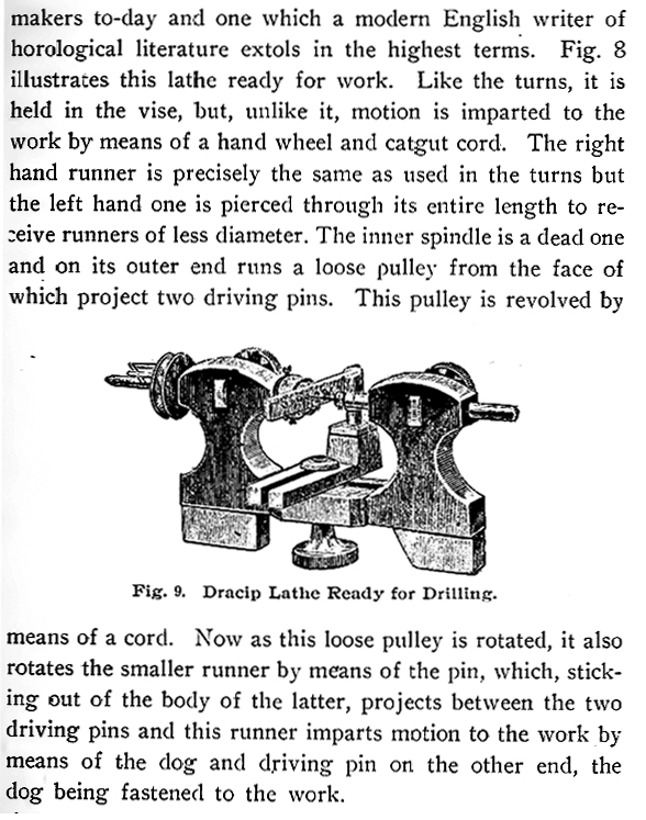 Although an example of a watchmakers' lathe branded with the name Picard has yet to be found, the writer has received this very interesting message that provides some useful background on the Company: Sir, I am an admirer of your work and I want to take the opportunity to, again, thank you for that monumental site, lathes.co.uk that you have built. In your "List of Watchmaker Lathes" (https://www.lathes.co.uk/watchmaker) you include Picard (Henri Picard et Frere), I think I might have relevant pieces of information about them. Henri Picard was a member of a large family of watchmakers, from La-Chaux-de-Fonds. It seems his company devoted itself to making and sell watchmaking accessories, and they are still in business...in Surrey. https://wiki.grail-watch.com/index.php/Henri_Picard_%26_Cie - http://www.picard.co.uk I don't know if Henri Picard & Cie were makers of lathes but I think their relative, Theodore Picard, was the one who created and produced the Dracip lathe that you briefly describe in your website. "Dracip" is the anonym of "Picard", and Theodore used it not only in the lathe, but in their watches. For more information about Theodore Picard: https://www.judaisme-alsalor.fr/synagog/hautrhin/g-p/hegenh/horloge/tpicard.htm I found these facts (or just clues?) while searching online for some photos of the Dracip lathe. It seems they were quite popular in their time but I have not been able to see one, just these two illustrations: