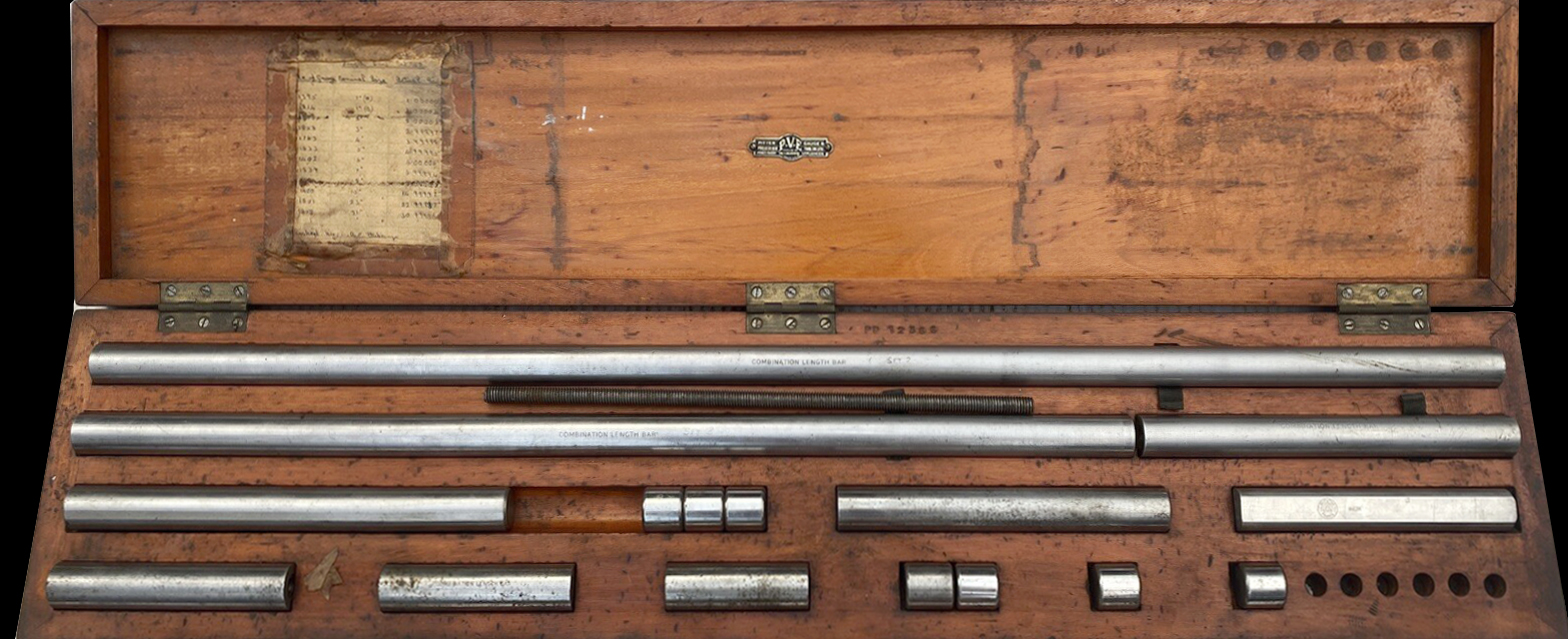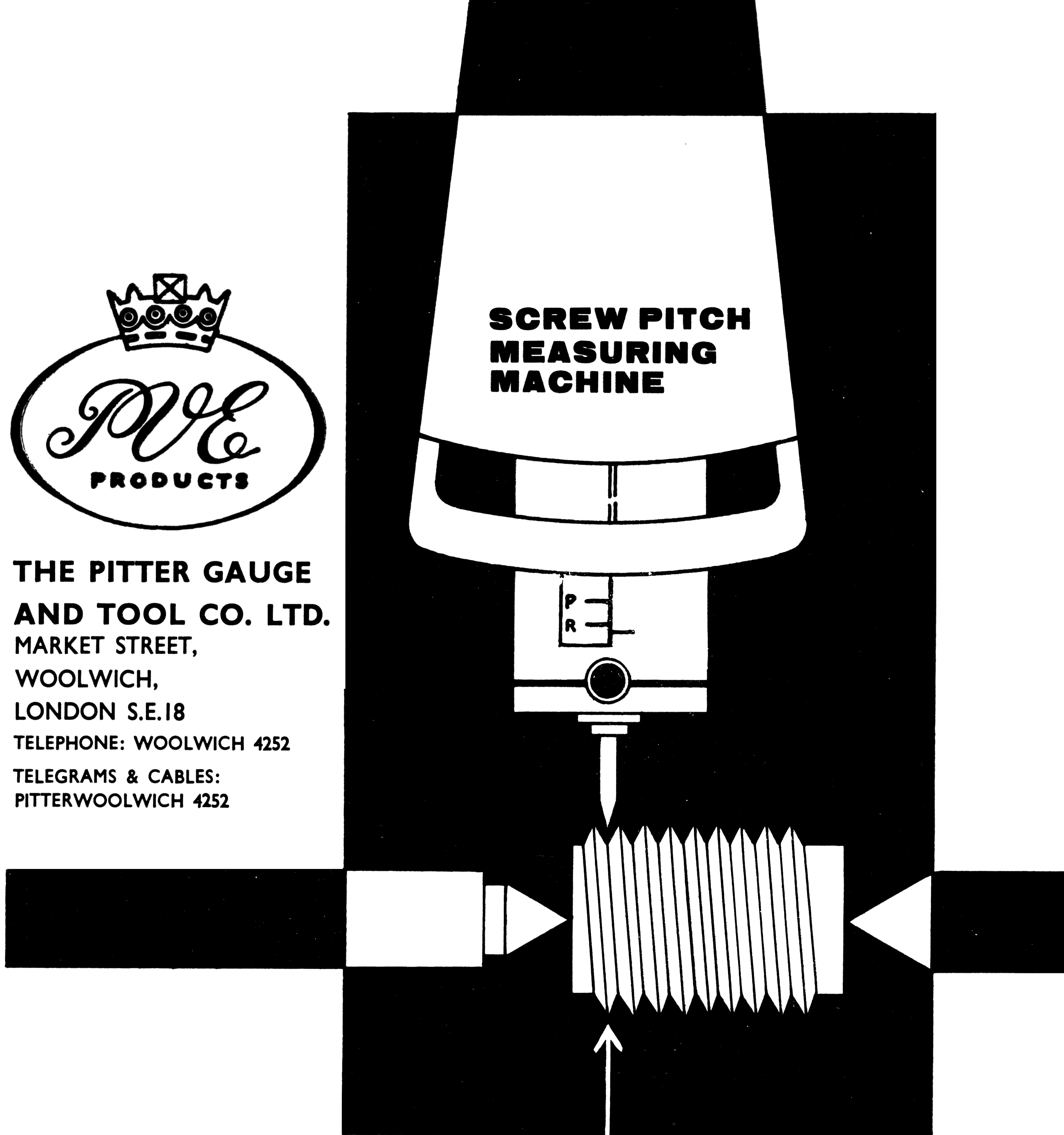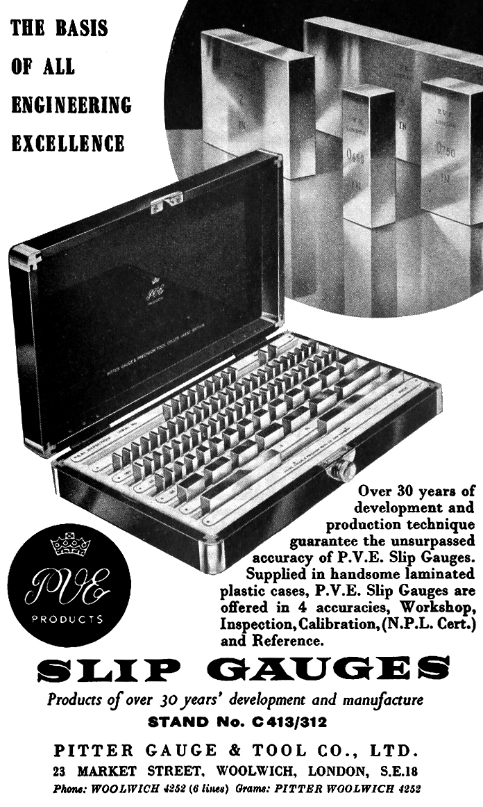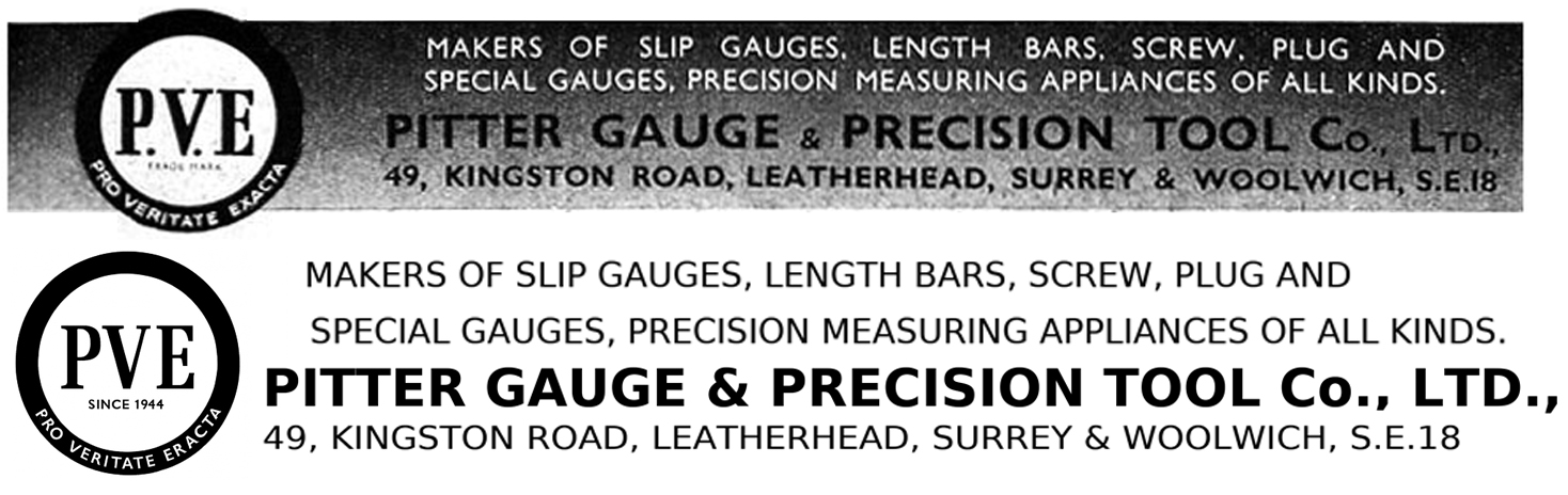 Thought to have been founded in the early 1920s, the Pitter Gauge & Precision Tool Co. was based in Upper Market Street/Upper Market Street, Woolwich, SE London and operated until 1970. Another address associated with the firm was 49 Kingston Road, Leatherhead (Surrey) from 1944 to 1946, though local directories don't confirm a lasting presence there, and it might have been a temporary WW2 location. Known originally (from 1914) as the Pitter Ventilation & Engineering Co. (P.V.E), and based in Woolwich, the company also used the "P.V.E." trade mark. Somebody must have noticed that the initials, if expressed in Latin (and so written on some of their logos) read as Pro Veritate Exacta, meaning, rather aptly, in Latin, for "the exact truth". Items made by Pitter were usually stamped P.V.E. or "Pitter Guage" The Company's business concentrated on very high precision measuring and inspection equipment with products including slip gauge (gauge blocks) that were available in various grades e.g. Workshop, Inspection, and Calibration and all available with an NPL (National Physical Laboratory) certificates; thread measuring machines; length bars; screw, plug and special gauges; optical flats; high-precision comparators, and makers of the Eden-Rolt "Millionth" Comparator that was used to detect wear on slip gauges down to ~1 micro-inch. This was an NPL-designed, mechanical-optical unit with contemporary reports stating that the overall magnification was 20,000× with a replacement threshold of v˜ 30 micro-inch or 3 millionths of an inch (0.00003"). Slip gauges that had worn could be resurfacedand recalibrated (they were, of course, slightly reduced in size) and their new size recorded on a calibration chart, an item that was always supplied with every reconditioned set. If a gauge was too badly worn, it was always replaced by a new one, the maximum amount of wear that P.V.E, recommended being 30 millionths of an inch (0.00003 inch). The Eden Rolt Millionth Comparator used the web of a black spider (Oedithorax fuscus ) as the vertical scale marker ( a spider's silk was prized for its fineness and strength and made it ideal for the delicate crosshairs needed in optical instruments such as bombsights, telescopes, and theodolites)..