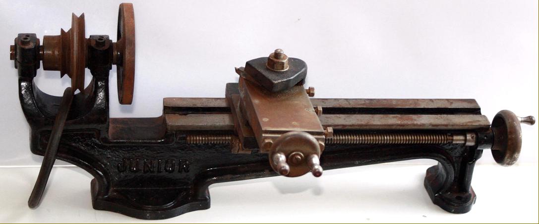 Badged as the "Junior", the 3" x 12" Portass lathe dates from the late 1920s to the early 1930s. However, as non of those discovered carry a Portass badge, uncertainty exists as to whether the model was ever offered under the company's own name - or sold only though third parties. The latter would have included large tool distributors, a department store - Gamages in London for example sold an almost identical model with their own name cast in - or for retailers or manufacturers to re-badge as their own with examples including: Altona, A.T.M., B.I.L., Bond's Maximus, "Eclipse" (for the Sheffield hand-tool makers James Neil & Sons) Excel, G.A. (George Adams), Gamages, Graves (a mail order company of Sheffield), James Grose Ltd. of London (the latter chiselling off the Portass name and substituting their own badge), Juniper, Randa, Temmah, Wakefield, Woolner and Zyto. Another connection, discovered in 2018 when looking through the Myford Archives, was the marketing of the lathe as the "Lincoln", this having a lower, 21/8" centre height and being, possibly, a machine sold by Myford during their very early days in the 1930s. All appear to have been based on established Portass models, nearly always a version of the "Junior" or the venerable "S Type", although in every case some small differences, usually down to cost-cutting, can be found. However, it may be that some examples were not made by Portass, but copied - one Portass advertising sheet claiming: Beware of Imitations. Portass lathes are being systematically copied and marketed and purchases should be careful to ascertain that the maker's label is attached to the machine. Of a simple, inexpensive plain-turning type, the "Junior" was identical in general form to the Portass sold as a backgeared and screwcutting Zyto, even to the single swivelling top slide - though without a T-slotted top to the saddle. At least two versions appear to have been made (Portass were particularly adept at mixing up castings and fittings): one with the top of the bed having two separate ways and another with an entirely flat top. Although, at a glance, looking to be identical, the beds were cast from different patterns and, with the possible exception of the headstock spindle, bearings and pulley, every fitting was different..