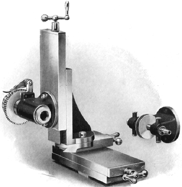 Unusual in that, instead of being adapted to fit the standard slide rest, the Pratt & Whitney swivelling vertical milling attachment was complete with its own compound slide unit - and thus could be used on lathes fitted with were only equipped with the simpler types of hand-tool rest. The slide carried an indexing unit, of the same collet fitting as the headstock, designed to hold small components whilst milling cutters, diamond laps or grinding wheels, held it the headstock spindle, were applied to them. A separate high-speed cutter head, driven by an extra pulley on the countershaft and designed to allow work held in the headstock spindle to be machined, was provided as standard.