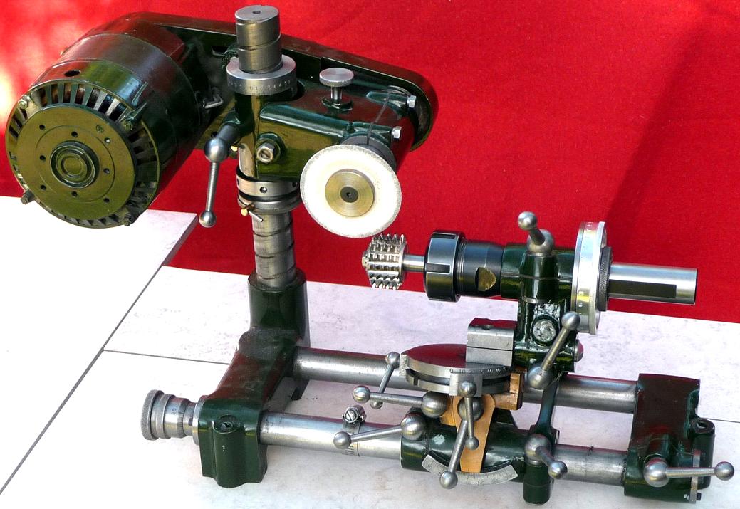 Since the vertical adaptation was made, the owner has realised that there was, in fact, no need to mount the spindle vertically - hobs can be sharpened with the grinding spindle set horizontally as Prof. Chaddock intended, above.
