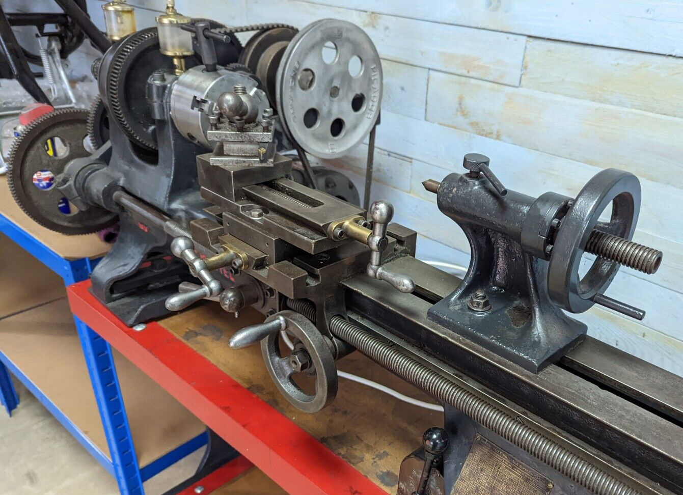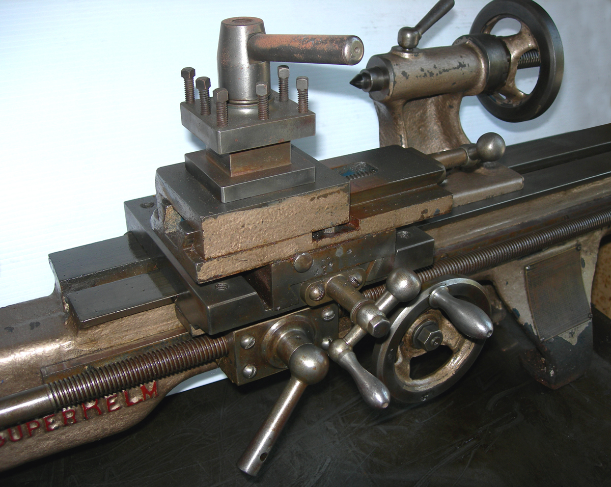 Continued: Relm lathes were also to be found advertised as the RelMac in both technical and non-technical magazines with the firm advising the availability of machines from 2 to 5.5-inches in centre height - though most surviving examples are of 4.25-inches with either 15 or 24-inches between centres. In line with the economic stringency of the time, they were made available not only as complete, working lathes but also as a kit of parts, semi-finished, for home assembly. As with lathes from Portass, in order to cover as wide a market segment as possible, numerous variations on a basic model were always offered - these consisting of simple and inexpensive plain-turning types, ones fitted with backgeared and finally the full-price, backgeared and screwcutting versions - these also being available, as were many contemporary small lathes, on a treadle stand. In 1913 the screwcutting (but not backgeared) 4.5-inch centre height gap-bed "Relmac" was advertised at £5 : 10s : 0d for bench mounting or at £8 : 10s : 0d on the (now very rare) self-contained stand and treadle assembly. The Relmac had a number of interesting design quirks: the cross slide was supported on a post carried in a extension to the saddle casting (in the photograph below the T-headed locking lever can be seen protruding from the side of the casting) while the top slide was fixed rigidly to the T-slotted cross slide and could not be swivelled - a most frustrating feature. Both slide feed-screws carried micrometer dials - an unusual luxury on many cheaper lathes at the time, though the tailstock could not be set over to turn tapers. The leadscrew ran down the centre line of the bed, as on the original Drummond 3.5-inch flat-bed lathes from the early years of the 20th century, and was fitted with a dog clutch, a device necessitated by the full nut carried under the saddle. However, its operation depended upon an over-complex and unnecessary arrangement involving a lever, crank rod and collet-closer type arrangement passing through the hub of the boss that carried the headstock-end of the leadscrew (perhaps the designer should have looked at the simple system used on the previously mentioned Drummond lathes). Of more advanced design, the 4-inch "Super Relm" was the company's most useful lathe and, for an inexpensive machine, well built and finished - at least in its early years. Production was to span the 1914-1918 "Great War" and, judging by the numbers surviving, it must have been a popular buy. Obviously a development of the original Relmac it featured a longer bed and, of greater importance, a proper compound slide rest with a swivelling top slide in place of the former fixed assembly. Repositioned at the front of the bed, the leadscrew was clasped by two substantial bronze half nuts (though the apron, as on so many similar lathes, was of the most perfunctory sort) with the carriage able to be propelled independently by a handwheel working through the usual rack-and-pinion gearing. Of similar appearance the headstock carried a plain-bearing spindle with the same 1.25" x 12 t.p.i. Thread and a No. 1 Morse taper socket. The screwcutting changewheels were beefed up, being increased in width from 3/8" to 5/8" thick and the tooth form altered from a rather delicate 20 DP to a stronger 16DP. While the bore remained at 1", instead of running directly on studs and being held together by pins when compounded in pairs, each gear was fitted to a keyed sleeve - the sleeve running on the mounting stud and so preventing wear from occurring in the bore of the gear. In 1923 the Cheltenham Works Co. Ltd. announced the RelMinor, an inexpensive but remarkably robust small lathe with a 3-inch centre height, 12-inches between centres and a 10.5-inch swing in the gaps. Although the option was offered of backgear and screwcutting, the few surviving examples tend to be just simple, plain-turning types. During 1924 what was probably the company's last new machine, the much smaller and lighter 2-inch centre height RelmBee was introduced. However, as competition in the model-engineering field increased and more makers, including Patrick, Portass, ETA, Ideal, Granville, Pools, Grayson, EXE, Randa, Zyto and others made for an overcrowded and very competitive market with thin profit margins. In addition, as well-established makers such as Drummond continued to develop and refine their small lathes, the Relm Machine Company failed to respond and gradually vanished from the scene. If you have a Relm lathe of any kind, or any literature about them, the writer would be pleased to hear from you.