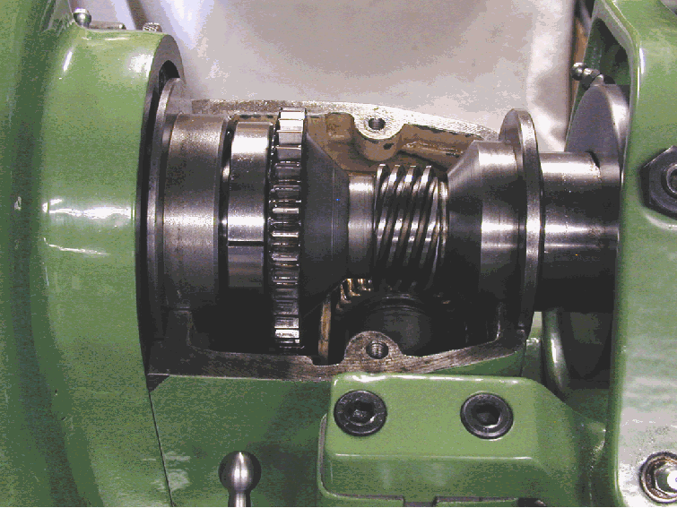 Viewed from the rear: the spindle take-off to the worm-driven fine-feed belt drive--see picture below