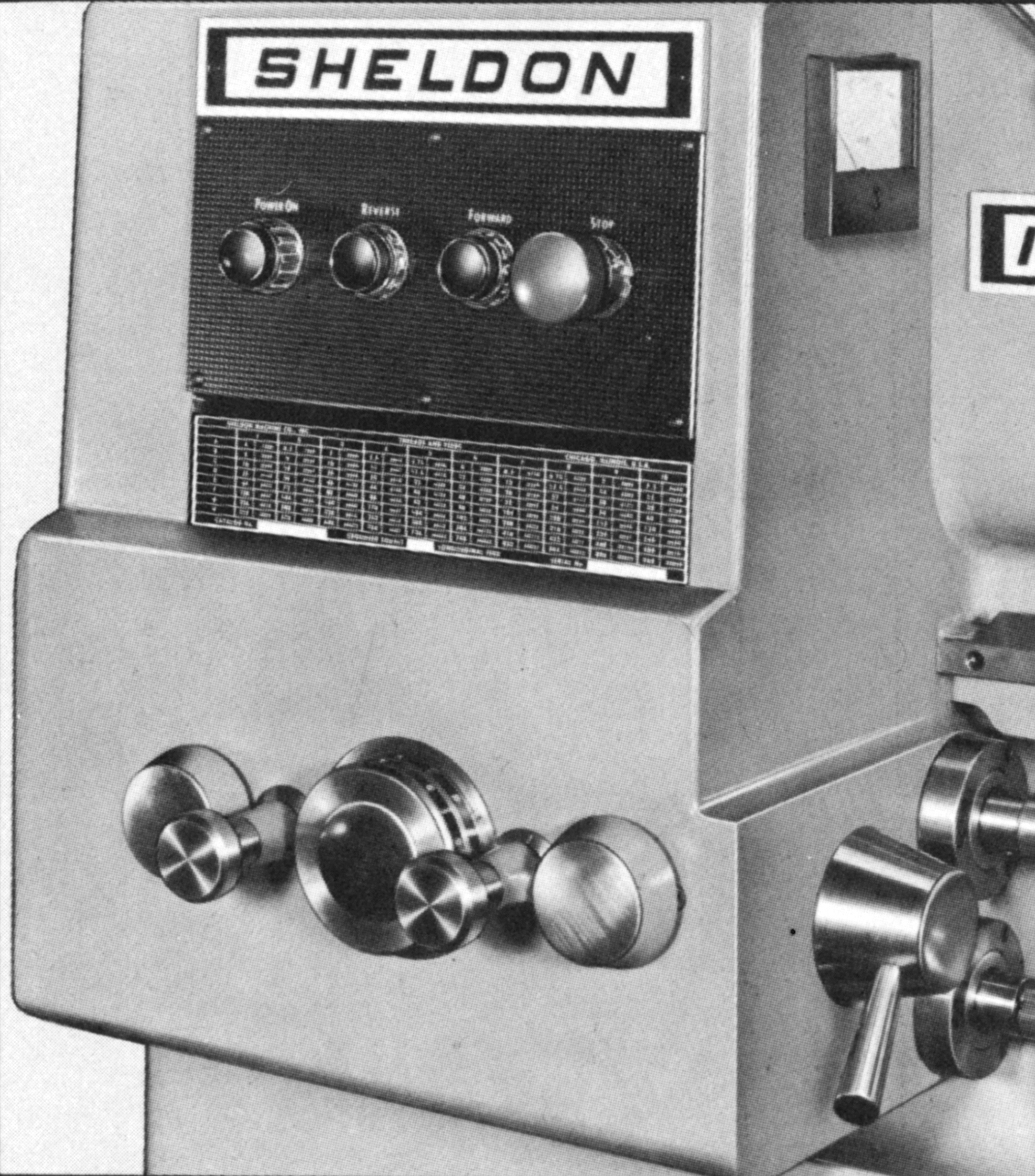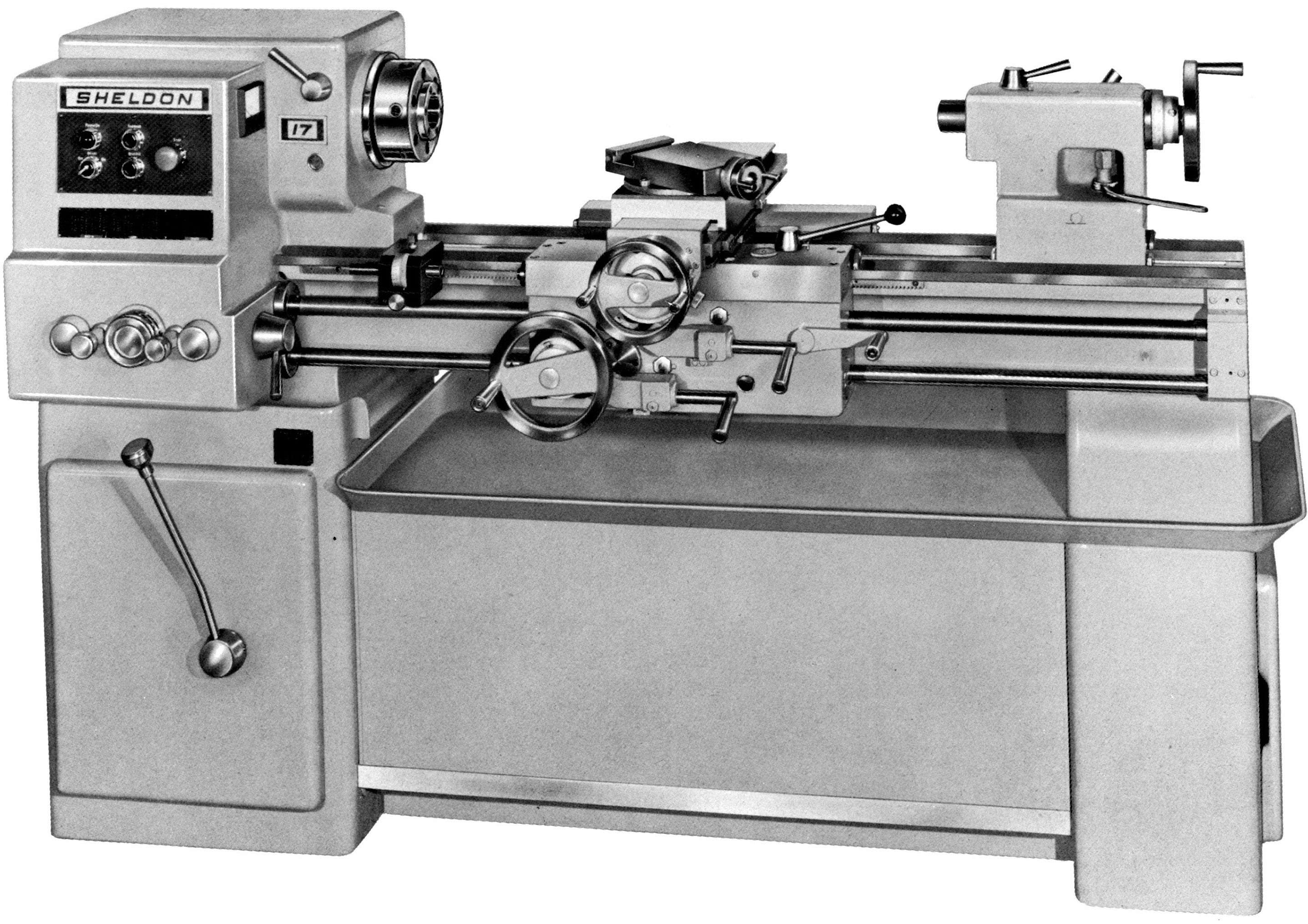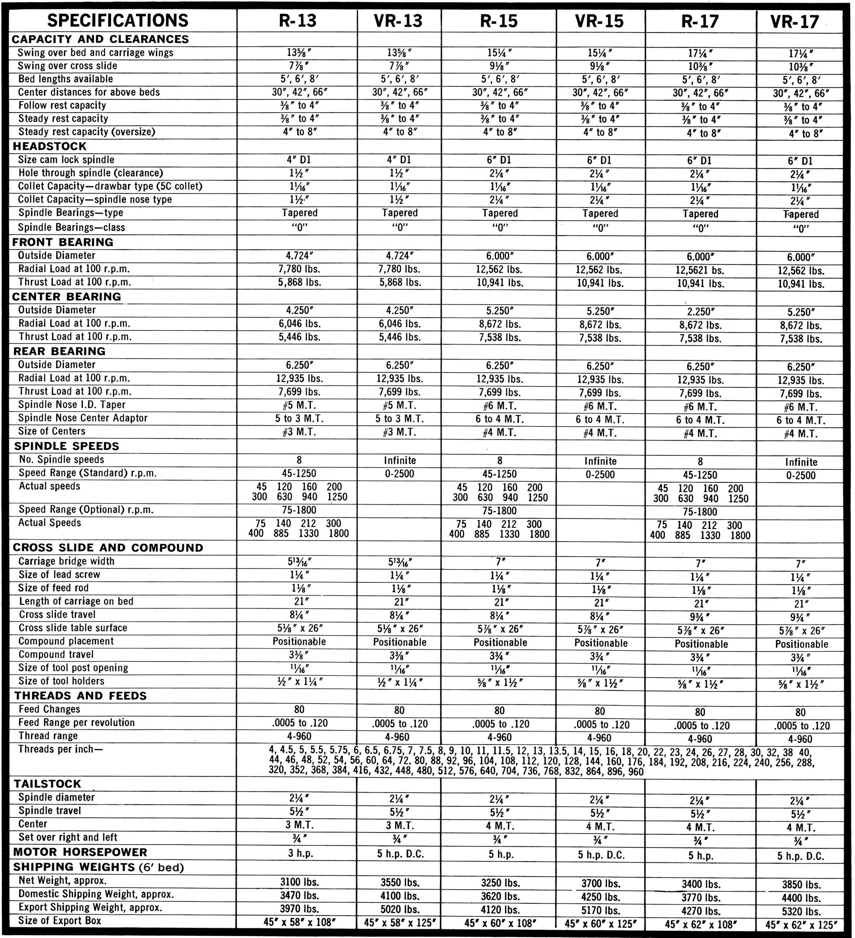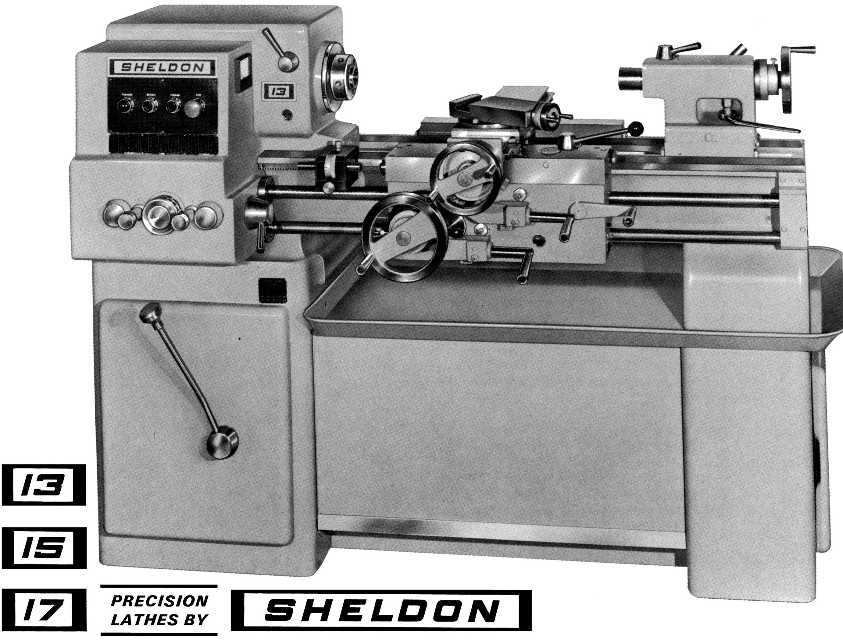 Introduced during the late 1970s and built until perhaps 1982, the Sheldon R-Series lathes - fitted with distinctive dial-change screwcutting gearboxes - were directly equivalent to the Colchester Colchester Master 2500 (Clausing Models 8014/15/16/17), Triumph 2000 (Clausing 8030 Series) and Mascot 1600 (Clausing 8050 Series). Both makes were a revolution in styling and specification and, though they may have lacked mechanical novelty, were a strong reminder that even machine tools are subject to the vagaries and whims of fashion. With their distinctive 'square' styling, ergonomically-designed controls and bright finishes, the new lathes and their angular styling made competing machines look distinctly dowdy and old-fashioned. Based on the earlier 15-inch Sheldon - itself a development of even earlier machines - the new Sheldon lathes had been carefully designed to incorporate a range of significant improvements and could be had with between-centre capacities of 30, 42 and 66 inches. While the 13-inch model was more lightly built than the larger pair - these differing only in capacity - all shared a number of useful design details intended to help survival in an industrial environment. Beds were flame hardened, the cross-slide dovetails and ways hard-chrome plated, the top and cross-slide screws hardened (and the latter with an anti-backlash nut), one-shot lubrication to the bed, carriage and cross-slide ways and cross-feed nut, very useful automatic stops to both the power sliding and surfacing feeds - and a micrometer-equipped carriage stop as standard. Two cross-feed stops were provided as part of the standard equipment with others able to be fitted as required. Similar to many lathes made in Europe( e.g. Voest, Dimco, Cardiff and Smart & Brown) the lathes used a drive system with a motor inside the cabinet base connected to a 4-speed gearbox. Final drive to the fully hardened and ground spindle (that ran in three "zero precision" taper roller bearings) was by three V-belts, the spindle pulley being overhung on the outside end of the spindle. The pulley drove the spindle though a "peg" and so was isolated from it, the aim of this arrangement being to stop gear chatter being transferred to the workpiece - though the headstock did contain low-speed backgears with the whole assembly running in an oil bath. On the R-13 the D1-4" spindle nose was formed with a 3 Morse taper and a bore of 1.5" - while R-15 and R-17 both had a D1-6" nose, a 6 Morse socket and a bore of 2.25". As standard, just a single-speed motor was fitted but, at extra cost, a 2-speed one could be fitted - as could ones with a brake. The R13 had a 3 h.p. motor while a 5 h.p. was used on the R-15 and R-17. Standard speeds, across the range, were 45, 120, 160, 200, 300, 630, 940 and 1250 r.p.m.; however it was also possible to order a faster set that spanned from 75 to 1800 r.p.m. As a further option, another range of models was offered, the VR-Series, these being equipped with a high-precision spindle with a maximum run-out at the spindle nose of 0.0001". There was also a guarantee that the vertical and horizontal alignment of the headstock, measured at the end of a 12-long test bar was held within 0.0003". In place of the standard drive system, VR-Series lathes were equipped with an infinitely variable-speed drive that used a 5 h.p.. DC motor fitted with dynamic braking. These models aimed to provide not only higher accuracy but also, by the use of a series of 4-speed geared reductions, improved torque over the full range. Speeds were divided into eight ranges of 0 to 100 r.p.m, 0 to 230 r.p.m., 0 to 300 r.p.m., 0 to 400 r.p.m., 0 to 650 r.p.m., 0 to 1300 r.p.m., 0 to 1950 r.p.m. and 0 to 2500 r.p.m. A motor-load indicator was provided that showed the operator when to change to a different geared range would provide a more efficient rate of production. The motor control system was built into the top section of a 3-drawer tool-storage unit, a dial-operated potentiometer and electronic tachometer being provided alongside a set of push-button controls for spindle start, stop and reverse - these being duplicated across the front face of the headstock. All models used the same screwcutting and feeds gearbox with an identical range of 80 different rates of feed from as slow as 0.0005" and 80 inch pitches from 4 to 960 t.p.i. The box was fully enclosed, oil-bath lubricated and operated by two knobs that could be revolved in both directions either individually or together. As the knobs were rotated, the feed rate and pitch appeared on a dial fitted between them. The box, which incorporated an instant-reverse control that could, very usefully, be operated with the box running, drove a leadscrew that was made from a stress-relieved steel and accurate to 0.0004" in any 4 inches and 0.001" per foot. . Made as an enclosed box, the apron was fully enclosed, oil-bathe lubricated and two separate, lever-operated multi-disc clutches for the power sliding and surfacing feeds. The tension applied to each clutch could be adjusted from the front to provide a safety overload that could be varied according to the job at hand. The saddle carried the compound slide rest assembly slightly offset to the left, with the bed's ways extending for a short distance in front of and behind the headstock. This arrangement allowed the cutting tool could be advanced right up to the spindle nose while still being fully supported. A possibly unique fitting was a built-in thread dial indicator that could be removed and stored in an apron cavity when not needed. The cross-slide way was, on all versions an unusual 26 inches long and so able to mount both front and rear swivelling top slides, raiser blocks to carry rear-mounted parting-off tools, an 8-station capstan head, a hydraulically-driven tracer attachment and various "fixture plates" that included a form of milling slide. Cross-feed travel on the R-13 and R15 was 8.25 inches and on the R-17 9.75 inches. Top
