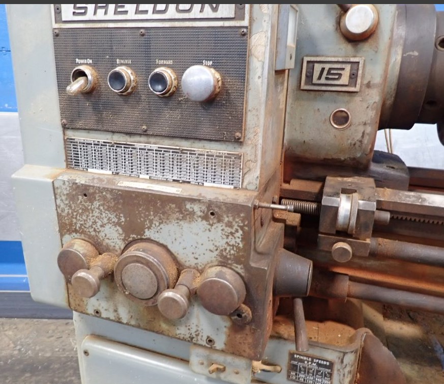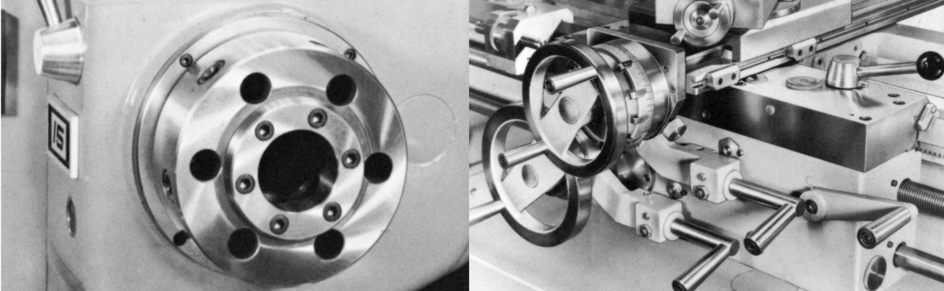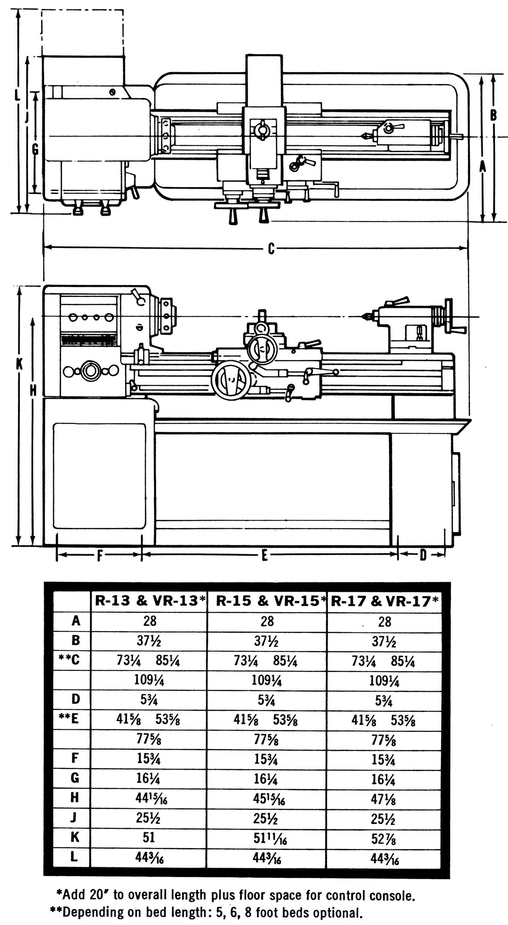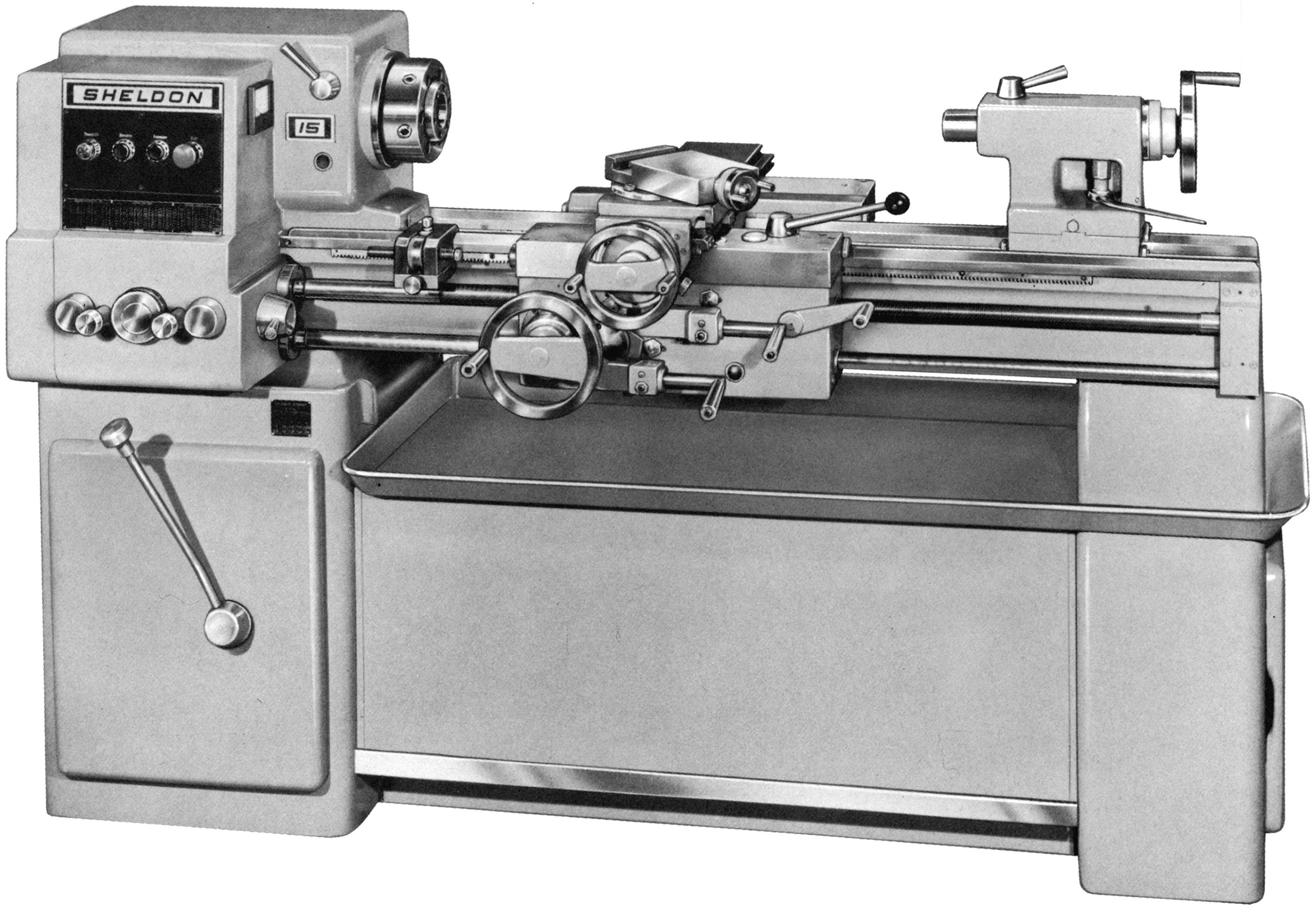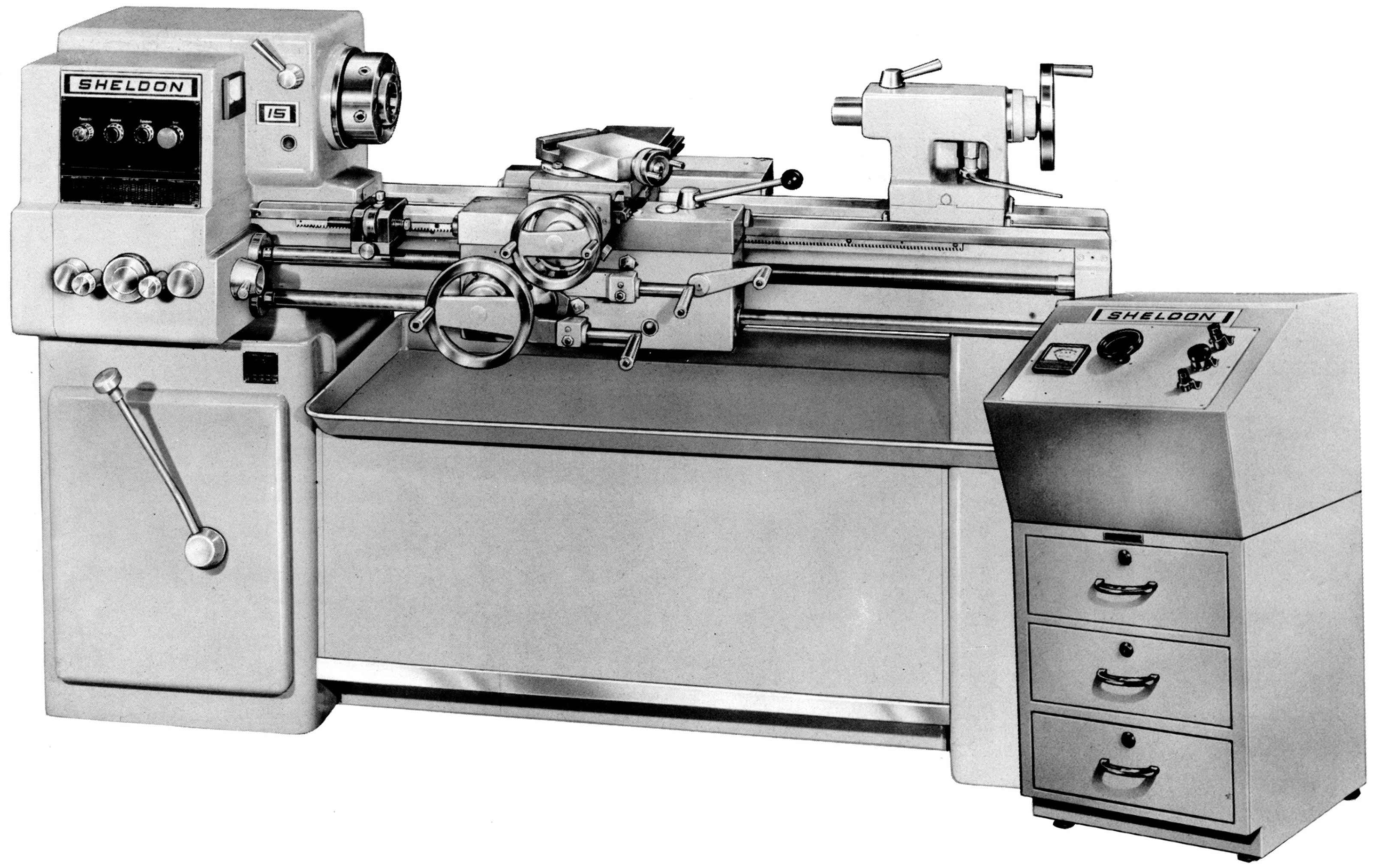 Introduced during the late 1970s and built until perhaps 1982, the Sheldon R-Series lathes - fitted with distinctive dial-change screwcutting gearboxes - were directly equivalent to the Colchester Colchester Master 2500 (Clausing Models 8014/15/16/17), Triumph 2000 (Clausing 8030 Series) and Mascot 1600 (Clausing 8050 Series). Both makes were a revolution in styling and specification and, though they may have lacked mechanical novelty, were a strong reminder that even machine tools are subject to the vagaries and whims of fashion. With their distinctive 'square' styling, ergonomically-designed controls and bright finishes, the new lathes and their angular styling made competing machines look distinctly dowdy and old-fashioned. Based on the earlier 15-inch Sheldon - itself a development of even earlier machines - the new Sheldon lathes had been carefully designed to incorporate a range of significant improvements and could be had with between-centre capacities of 30, 42 and 66 inches. While the 13-inch model was more lightly built than the larger pair - these differing only in capacity - all shared a number of useful design details intended to help survival in an industrial environment. Beds were flame hardened, the cross-slide dovetails and ways hard-chrome plated, the top and cross-slide screws hardened (and the latter with an anti-backlash nut), one-shot lubrication to the bed, carriage and cross-slide ways and cross-feed nut, very useful automatic stops to both the power sliding and surfacing feeds - and a micrometer-equipped carriage stop as standard. Two cross-feed stops were provided as part of the standard equipment with others able to be fitted as required. Similar to many lathes made in Europe( e.g. Voest, Dimco, Cardiff and Smart & Brown) the lathes used a drive system with a motor inside the cabinet base connected to a 4-speed gearbox. Final drive to the fully hardened and ground spindle (that ran in three "zero precision" taper roller bearings) was by three V-belts, the spindle pulley being overhung on the outside end of the spindle. The pulley drove the spindle though a "peg" and so was isolated from it, the aim of this arrangement being to stop gear chatter being transferred to the workpiece - though the headstock did contain low-speed backgears with the whole assembly running in an oil bath. On the R-13 the D1-4" spindle nose was formed with a 3 Morse taper and a bore of 1.5" - while R-15 and R-17 both had a D1-6" nose, a 6 Morse socket and a bore of 2.25". As standard, just a single-speed motor was fitted but, at extra cost, a 2-speed one could be fitted - as could ones with a brake. The R13 had a 3 h.p. motor while a 5 h.p. was used on the R-15 and R-17. Standard speeds, across the range, were 45, 120, 160, 200, 300, 630, 940 and 1250 r.p.m.; however it was also possible to order a faster set that spanned from 75 to 1800 r.p.m. As a further option, another range of models was offered, the VR-Series, these being equipped with a high-precision spindle with a maximum run-out at the spindle nose of 0.0001". There was also a guarantee that the vertical and horizontal alignment of the headstock, measured at the end of a 12-long test bar was held within 0.0003". In place of the standard drive system, VR-Series lathes were equipped with an infinitely variable-speed drive that used a 5 h.p.. DC motor fitted with dynamic braking. These models aimed to provide not only higher accuracy but also, by the use of a series of 4-speed geared reductions, improved torque over the full range. Speeds were divided into eight ranges of 0 to 100 r.p.m, 0 to 230 r.p.m., 0 to 300 r.p.m., 0 to 400 r.p.m., 0 to 650 r.p.m., 0 to 1300 r.p.m., 0 to 1950 r.p.m. and 0 to 2500 r.p.m. A motor-load indicator was provided that showed the operator when to change to a different geared range would provide a more efficient rate of production. The motor control system was built into the top section of a 3-drawer tool-storage unit, a dial-operated potentiometer and electronic tachometer being provided alongside a set of push-button controls for spindle start, stop and reverse - these being duplicated across the front face of the headstock. All models used the same screwcutting and feeds gearbox with an identical range of 80 different rates of feed from as slow as 0.0005" and 80 inch pitches from 4 to 960 t.p.i. The box was fully enclosed, oil-bath lubricated and operated by two knobs that could be revolved in both directions either individually or together. As the knobs were rotated, the feed rate and pitch appeared on a dial fitted between them. The box, which incorporated an instant-reverse control that could, very usefully, be operated with the box running, drove a leadscrew that was made from a stress-relieved steel and accurate to 0.0004" in any 4 inches and 0.001" per foot. . Made as an enclosed box, the apron was fully enclosed, oil-bathe lubricated and two separate, lever-operated multi-disc clutches for the power sliding and surfacing feeds. The tension applied to each clutch could be adjusted from the front to provide a safety overload that could be varied according to the job at hand. The saddle carried the compound slide rest assembly slightly offset to the left, with the bed's ways extending for a short distance in front of and behind the headstock. This arrangement allowed the cutting tool could be advanced right up to the spindle nose while still being fully supported. A possibly unique fitting was a built-in thread dial indicator that could be removed and stored in an apron cavity when not needed. The cross-slide way was, on all versions an unusual 26 inches long and so able to mount both front and rear swivelling top slides, raiser blocks to carry rear-mounted parting-off tools, an 8-station capstan head, a hydraulically-driven tracer attachment and various "fixture plates" that included a form of milling slide. Cross-feed travel on the R-13 and R15 was 8.25 inches and on the R-17 9.75 inches. Top