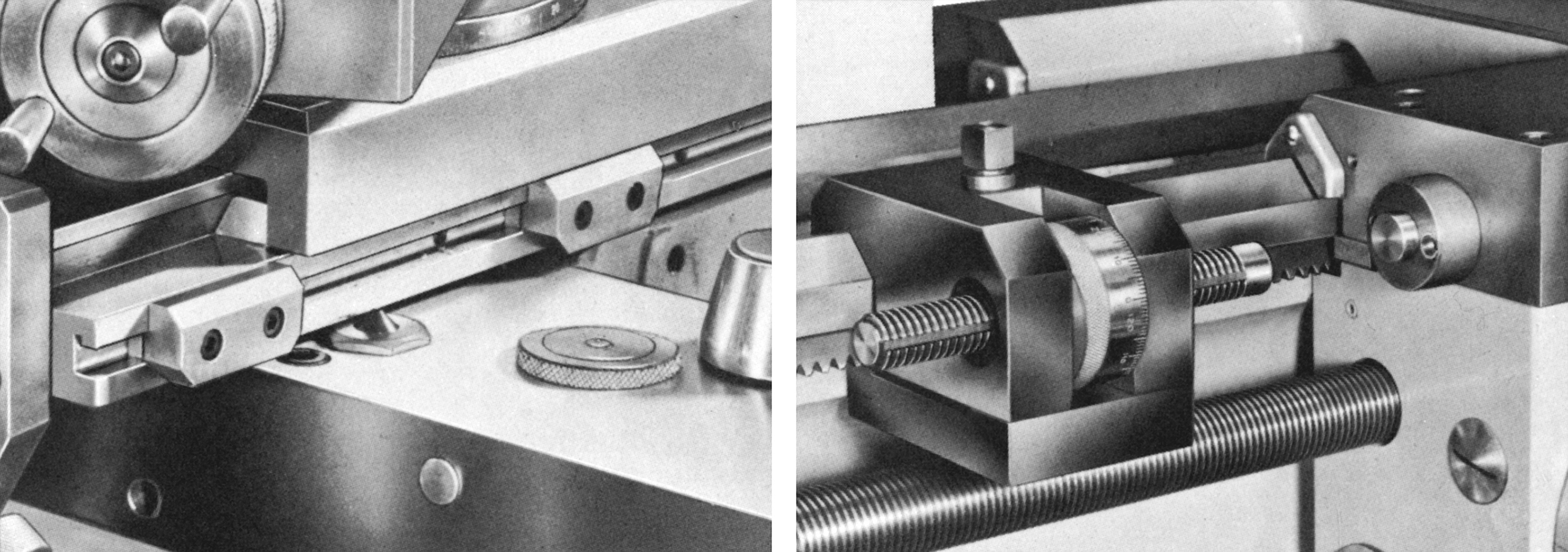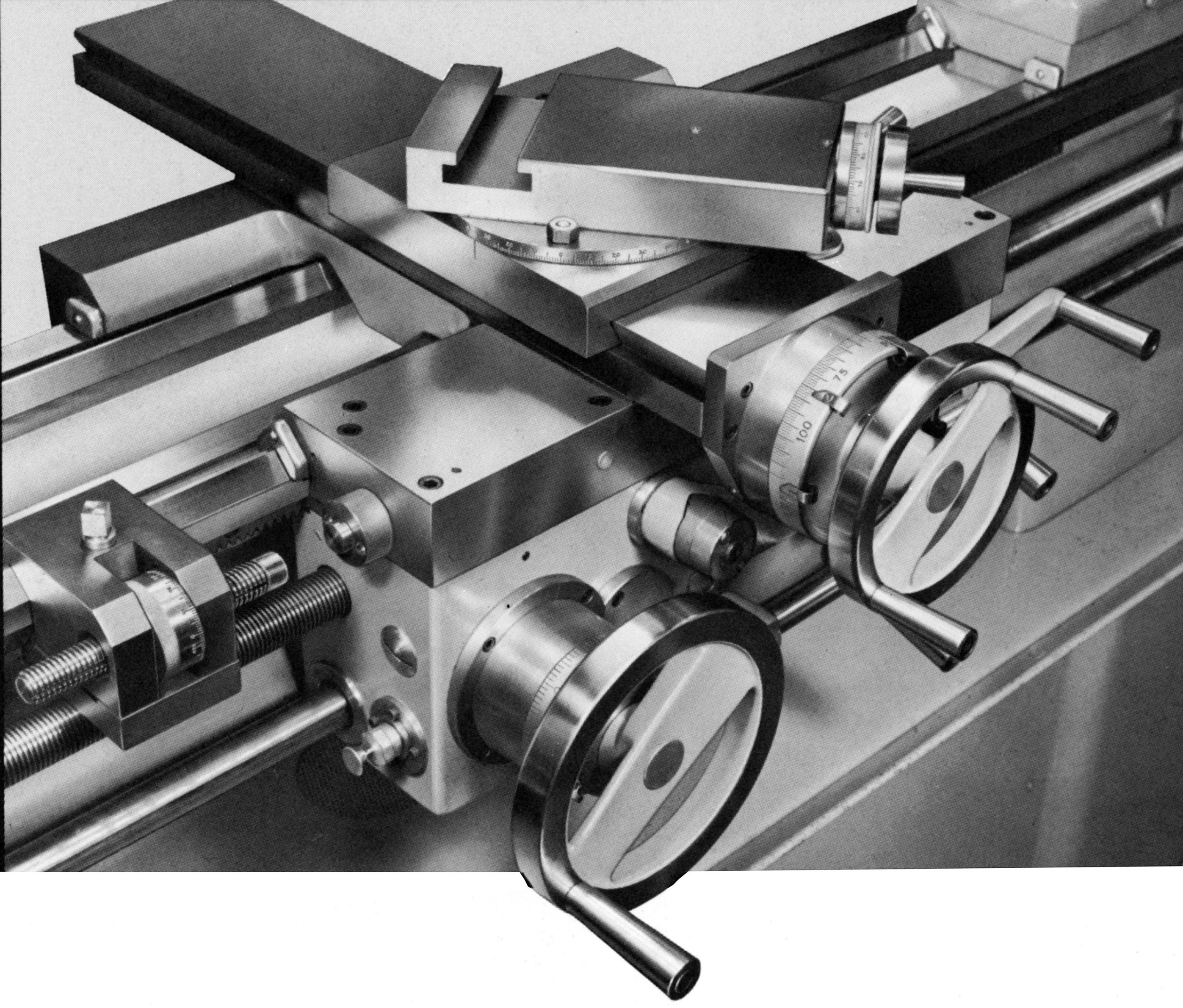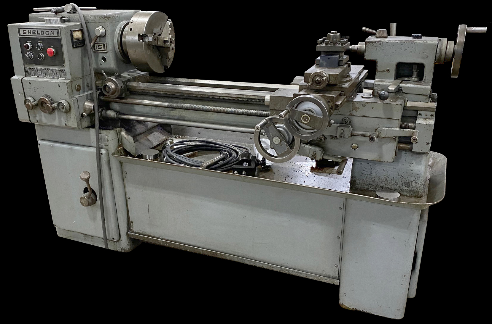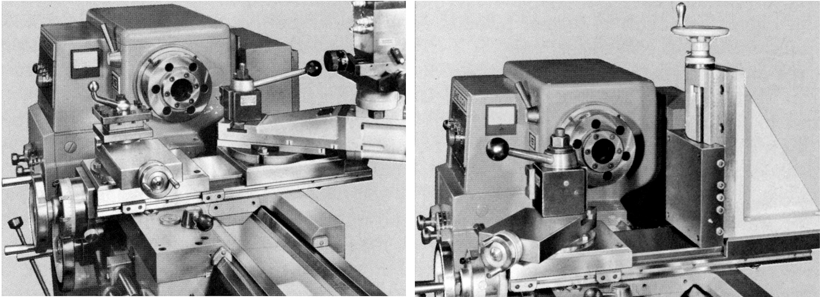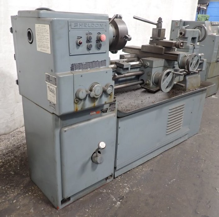 Introduced during the late 1970s and built until perhaps 1982, the Sheldon R-Series lathes - fitted with distinctive dial-change screwcutting gearboxes - were directly equivalent to the Colchester Colchester Master 2500 (Clausing Models 8014/15/16/17), Triumph 2000 (Clausing 8030 Series) and Mascot 1600 (Clausing 8050 Series). Both makes were a revolution in styling and specification and, though they may have lacked mechanical novelty, were a strong reminder that even machine tools are subject to the vagaries and whims of fashion. With their distinctive 'square' styling, ergonomically-designed controls and bright finishes, the new lathes and their angular styling made competing machines look distinctly dowdy and old-fashioned. Based on the earlier 15-inch Sheldon - itself a development of even earlier machines - the new Sheldon lathes had been carefully designed to incorporate a range of significant improvements and could be had with between-centre capacities of 30, 42 and 66 inches. While the 13-inch model was more lightly built than the larger pair - these differing only in capacity - all shared a number of useful design details intended to help survival in an industrial environment. Beds were flame hardened, the cross-slide dovetails and ways hard-chrome plated, the top and cross-slide screws hardened (and the latter with an anti-backlash nut), one-shot lubrication to the bed, carriage and cross-slide ways and cross-feed nut, very useful automatic stops to both the power sliding and surfacing feeds - and a micrometer-equipped carriage stop as standard. Two cross-feed stops were provided as part of the standard equipment with others able to be fitted as required. Similar to many lathes made in Europe( e.g. Voest, Dimco, Cardiff and Smart & Brown) the lathes used a drive system with a motor inside the cabinet base connected to a 4-speed gearbox. Final drive to the fully hardened and ground spindle (that ran in three "zero precision" taper roller bearings) was by three V-belts, the spindle pulley being overhung on the outside end of the spindle. The pulley drove the spindle though a "peg" and so was isolated from it, the aim of this arrangement being to stop gear chatter being transferred to the workpiece - though the headstock did contain low-speed backgears with the whole assembly running in an oil bath. On the R-13 the D1-4" spindle nose was formed with a 3 Morse taper and a bore of 1.5" - while R-15 and R-17 both had a D1-6" nose, a 6 Morse socket and a bore of 2.25". As standard, just a single-speed motor was fitted but, at extra cost, a 2-speed one could be fitted - as could ones with a brake. The R13 had a 3 h.p. motor while a 5 h.p. was used on the R-15 and R-17. Standard speeds, across the range, were 45, 120, 160, 200, 300, 630, 940 and 1250 r.p.m.; however it was also possible to order a faster set that spanned from 75 to 1800 r.p.m. As a further option, another range of models was offered, the VR-Series, these being equipped with a high-precision spindle with a maximum run-out at the spindle nose of 0.0001". There was also a guarantee that the vertical and horizontal alignment of the headstock, measured at the end of a 12-long test bar was held within 0.0003". In place of the standard drive system, VR-Series lathes were equipped with an infinitely variable-speed drive that used a 5 h.p.. DC motor fitted with dynamic braking. These models aimed to provide not only higher accuracy but also, by the use of a series of 4-speed geared reductions, improved torque over the full range. Speeds were divided into eight ranges of 0 to 100 r.p.m, 0 to 230 r.p.m., 0 to 300 r.p.m., 0 to 400 r.p.m., 0 to 650 r.p.m., 0 to 1300 r.p.m., 0 to 1950 r.p.m. and 0 to 2500 r.p.m. A motor-load indicator was provided that showed the operator when to change to a different geared range would provide a more efficient rate of production. The motor control system was built into the top section of a 3-drawer tool-storage unit, a dial-operated potentiometer and electronic tachometer being provided alongside a set of push-button controls for spindle start, stop and reverse - these being duplicated across the front face of the headstock. All models used the same screwcutting and feeds gearbox with an identical range of 80 different rates of feed from as slow as 0.0005" and 80 inch pitches from 4 to 960 t.p.i. The box was fully enclosed, oil-bath lubricated and operated by two knobs that could be revolved in both directions either individually or together. As the knobs were rotated, the feed rate and pitch appeared on a dial fitted between them. The box, which incorporated an instant-reverse control that could, very usefully, be operated with the box running, drove a leadscrew that was made from a stress-relieved steel and accurate to 0.0004" in any 4 inches and 0.001" per foot. . Made as an enclosed box, the apron was fully enclosed, oil-bathe lubricated and two separate, lever-operated multi-disc clutches for the power sliding and surfacing feeds. The tension applied to each clutch could be adjusted from the front to provide a safety overload that could be varied according to the job at hand. The saddle carried the compound slide rest assembly slightly offset to the left, with the bed's ways extending for a short distance in front of and behind the headstock. This arrangement allowed the cutting tool could be advanced right up to the spindle nose while still being fully supported. A possibly unique fitting was a built-in thread dial indicator that could be removed and stored in an apron cavity when not needed. The cross-slide way was, on all versions an unusual 26 inches long and so able to mount both front and rear swivelling top slides, raiser blocks to carry rear-mounted parting-off tools, an 8-station capstan head, a hydraulically-driven tracer attachment and various "fixture plates" that included a form of milling slide. Cross-feed travel on the R-13 and R15 was 8.25 inches and on the R-17 9.75 inches. Top