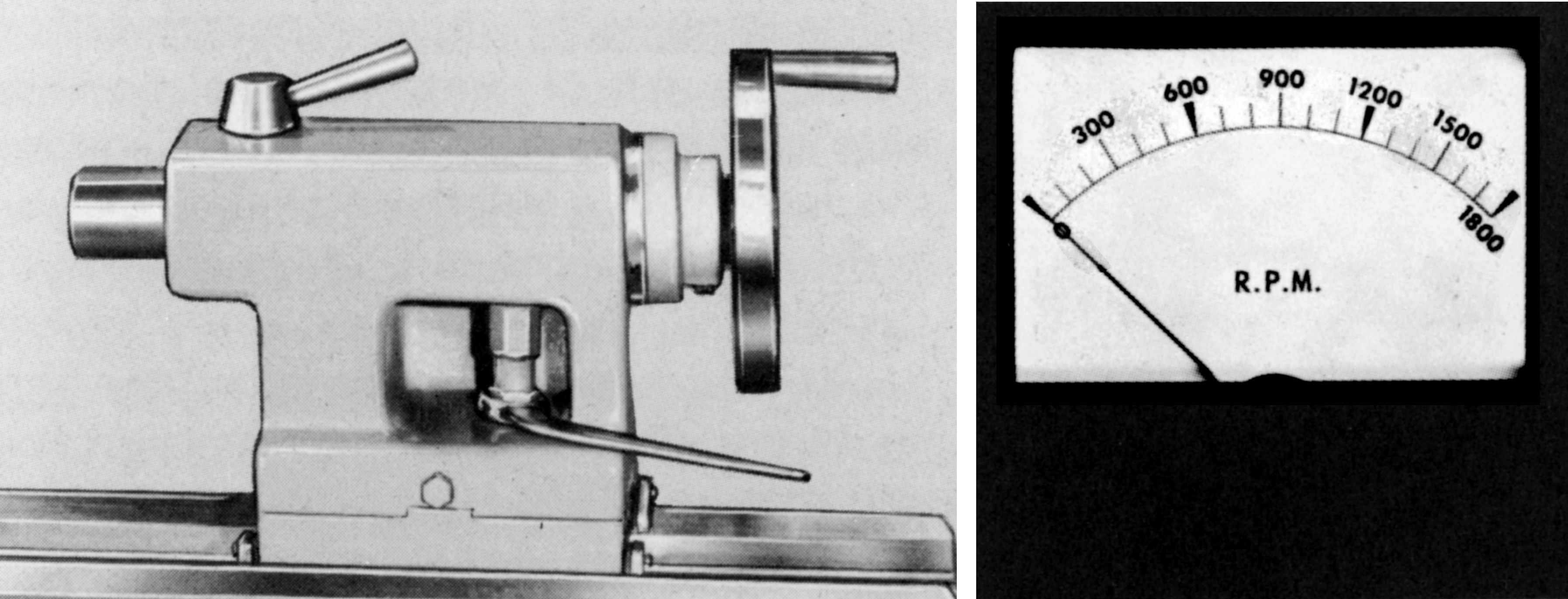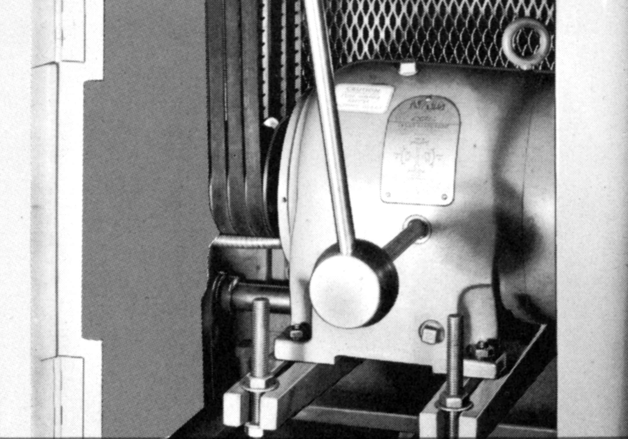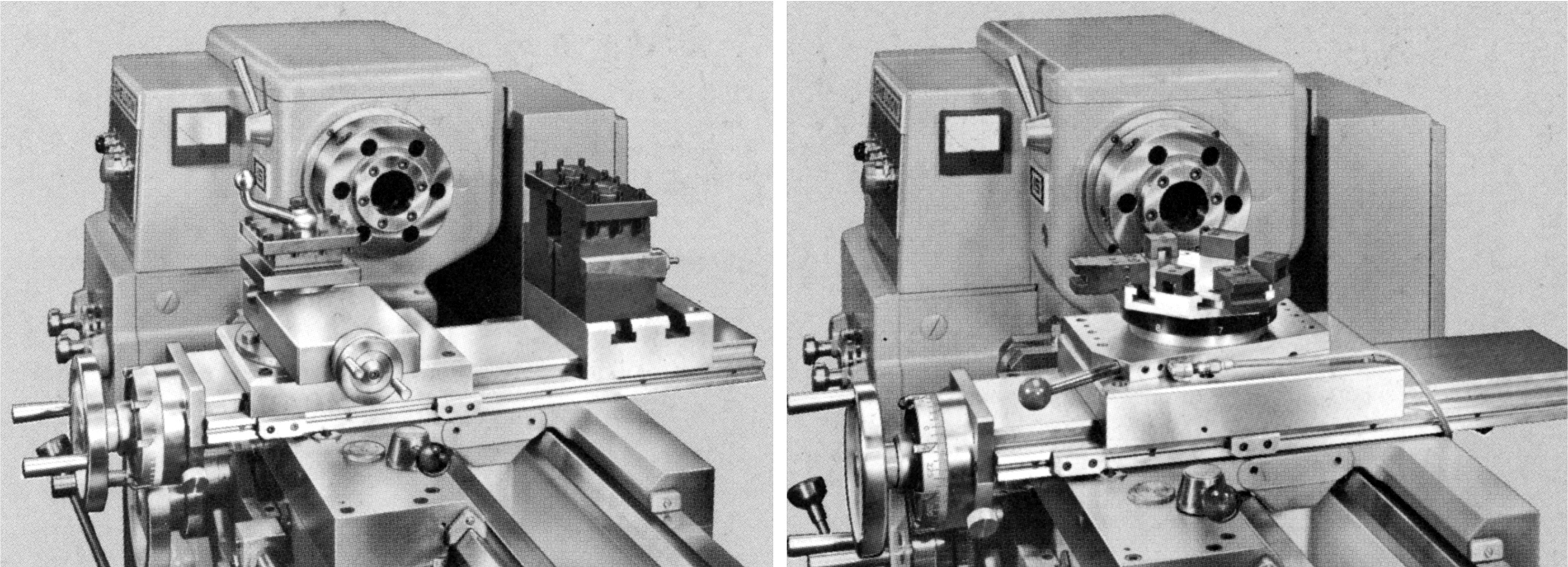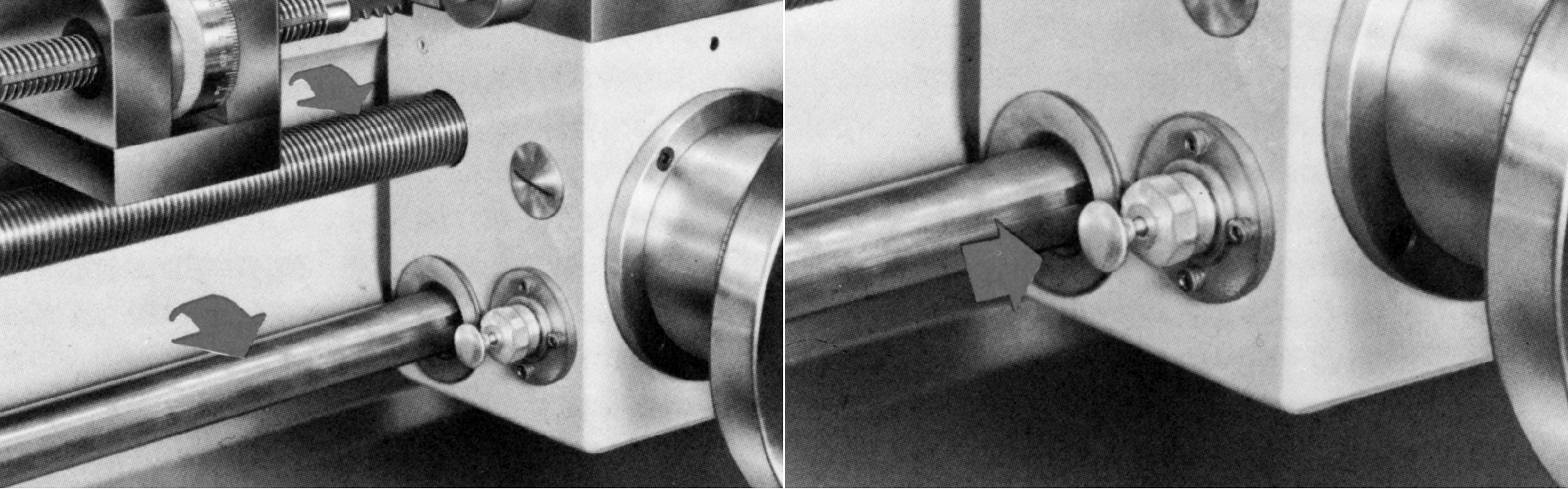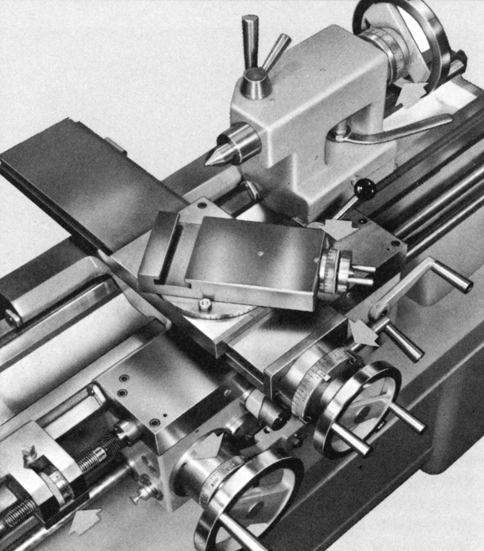 Introduced during the late 1970s and built until perhaps 1982, the Sheldon R-Series lathes - fitted with distinctive dial-change screwcutting gearboxes - were directly equivalent to the Colchester Colchester Master 2500 (Clausing Models 8014/15/16/17), Triumph 2000 (Clausing 8030 Series) and Mascot 1600 (Clausing 8050 Series). Both makes were a revolution in styling and specification and, though they may have lacked mechanical novelty, were a strong reminder that even machine tools are subject to the vagaries and whims of fashion. With their distinctive 'square' styling, ergonomically-designed controls and bright finishes, the new lathes and their angular styling made competing machines look distinctly dowdy and old-fashioned. Based on the earlier 15-inch Sheldon - itself a development of even earlier machines - the new Sheldon lathes had been carefully designed to incorporate a range of significant improvements and could be had with between-centre capacities of 30, 42 and 66 inches. While the 13-inch model was more lightly built than the larger pair - these differing only in capacity - all shared a number of useful design details intended to help survival in an industrial environment. Beds were flame hardened, the cross-slide dovetails and ways hard-chrome plated, the top and cross-slide screws hardened (and the latter with an anti-backlash nut), one-shot lubrication to the bed, carriage and cross-slide ways and cross-feed nut, very useful automatic stops to both the power sliding and surfacing feeds - and a micrometer-equipped carriage stop as standard. Two cross-feed stops were provided as part of the standard equipment with others able to be fitted as required. Similar to many lathes made in Europe( e.g. Voest, Dimco, Cardiff and Smart & Brown) the lathes used a drive system with a motor inside the cabinet base connected to a 4-speed gearbox. Final drive to the fully hardened and ground spindle (that ran in three "zero precision" taper roller bearings) was by three V-belts, the spindle pulley being overhung on the outside end of the spindle. The pulley drove the spindle though a "peg" and so was isolated from it, the aim of this arrangement being to stop gear chatter being transferred to the workpiece - though the headstock did contain low-speed backgears with the whole assembly running in an oil bath. On the R-13 the D1-4" spindle nose was formed with a 3 Morse taper and a bore of 1.5" - while R-15 and R-17 both had a D1-6" nose, a 6 Morse socket and a bore of 2.25". As standard, just a single-speed motor was fitted but, at extra cost, a 2-speed one could be fitted - as could ones with a brake. The R13 had a 3 h.p. motor while a 5 h.p. was used on the R-15 and R-17. Standard speeds, across the range, were 45, 120, 160, 200, 300, 630, 940 and 1250 r.p.m.; however it was also possible to order a faster set that spanned from 75 to 1800 r.p.m. As a further option, another range of models was offered, the VR-Series, these being equipped with a high-precision spindle with a maximum run-out at the spindle nose of 0.0001". There was also a guarantee that the vertical and horizontal alignment of the headstock, measured at the end of a 12-long test bar was held within 0.0003". In place of the standard drive system, VR-Series lathes were equipped with an infinitely variable-speed drive that used a 5 h.p.. DC motor fitted with dynamic braking. These models aimed to provide not only higher accuracy but also, by the use of a series of 4-speed geared reductions, improved torque over the full range. Speeds were divided into eight ranges of 0 to 100 r.p.m, 0 to 230 r.p.m., 0 to 300 r.p.m., 0 to 400 r.p.m., 0 to 650 r.p.m., 0 to 1300 r.p.m., 0 to 1950 r.p.m. and 0 to 2500 r.p.m. A motor-load indicator was provided that showed the operator when to change to a different geared range would provide a more efficient rate of production. The motor control system was built into the top section of a 3-drawer tool-storage unit, a dial-operated potentiometer and electronic tachometer being provided alongside a set of push-button controls for spindle start, stop and reverse - these being duplicated across the front face of the headstock. All models used the same screwcutting and feeds gearbox with an identical range of 80 different rates of feed from as slow as 0.0005" and 80 inch pitches from 4 to 960 t.p.i. The box was fully enclosed, oil-bath lubricated and operated by two knobs that could be revolved in both directions either individually or together. As the knobs were rotated, the feed rate and pitch appeared on a dial fitted between them. The box, which incorporated an instant-reverse control that could, very usefully, be operated with the box running, drove a leadscrew that was made from a stress-relieved steel and accurate to 0.0004" in any 4 inches and 0.001" per foot. . Made as an enclosed box, the apron was fully enclosed, oil-bathe lubricated and two separate, lever-operated multi-disc clutches for the power sliding and surfacing feeds. The tension applied to each clutch could be adjusted from the front to provide a safety overload that could be varied according to the job at hand. The saddle carried the compound slide rest assembly slightly offset to the left, with the bed's ways extending for a short distance in front of and behind the headstock. This arrangement allowed the cutting tool could be advanced right up to the spindle nose while still being fully supported. A possibly unique fitting was a built-in thread dial indicator that could be removed and stored in an apron cavity when not needed. The cross-slide way was, on all versions an unusual 26 inches long and so able to mount both front and rear swivelling top slides, raiser blocks to carry rear-mounted parting-off tools, an 8-station capstan head, a hydraulically-driven tracer attachment and various "fixture plates" that included a form of milling slide. Cross-feed travel on the R-13 and R15 was 8.25 inches and on the R-17 9.75 inches. Top