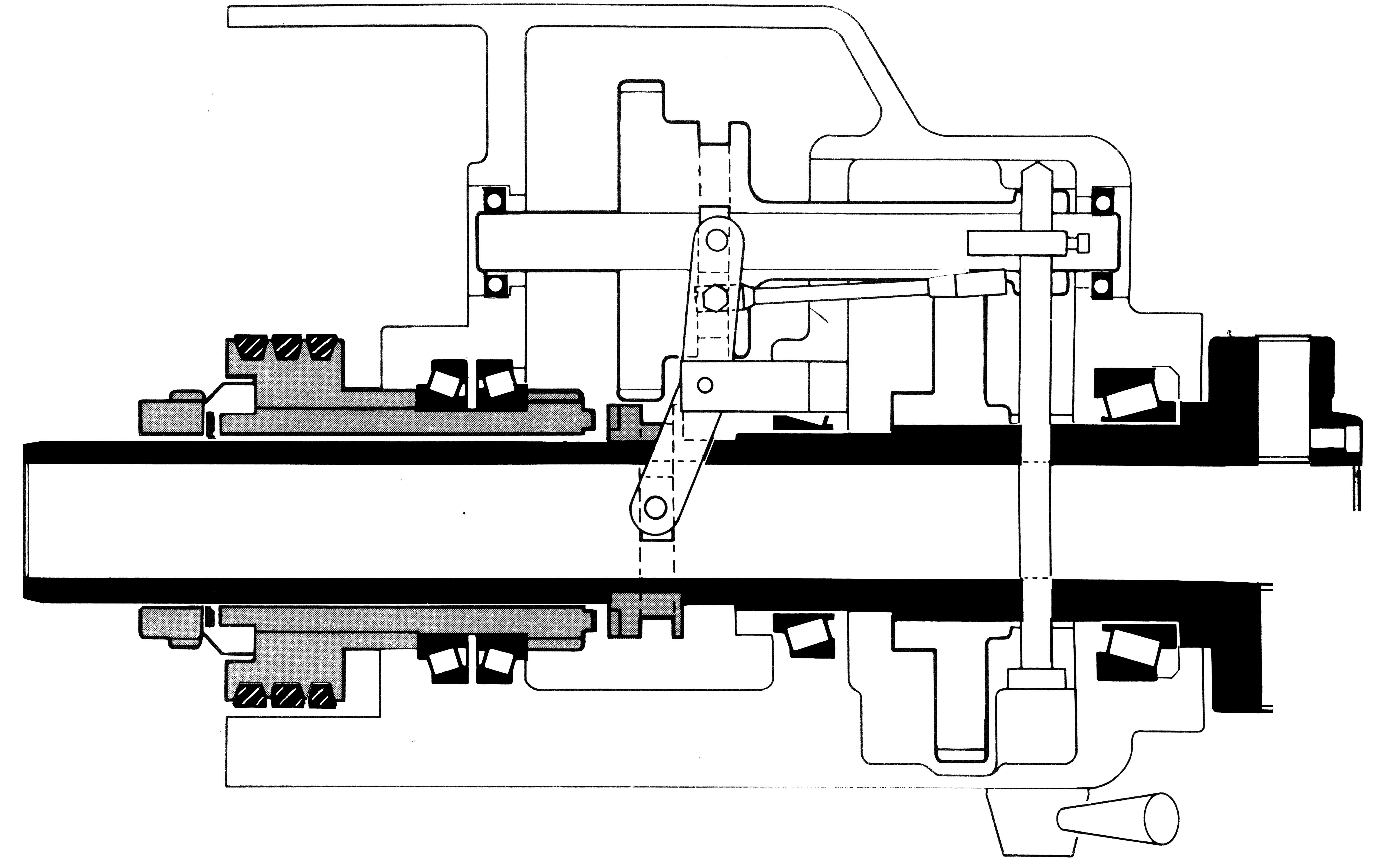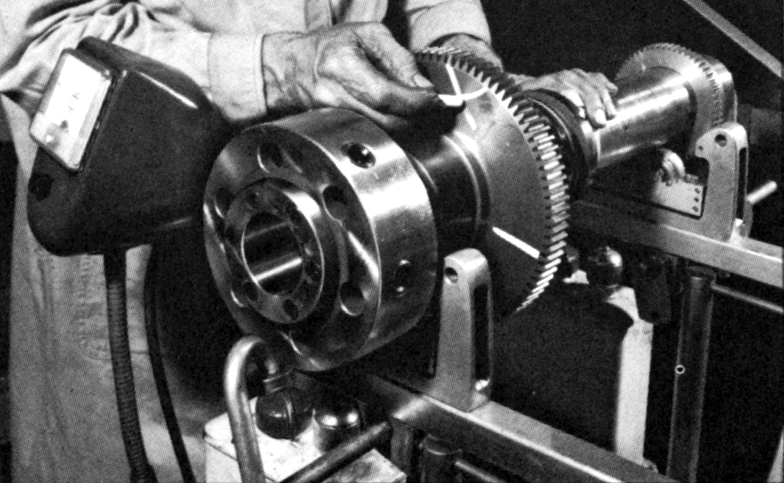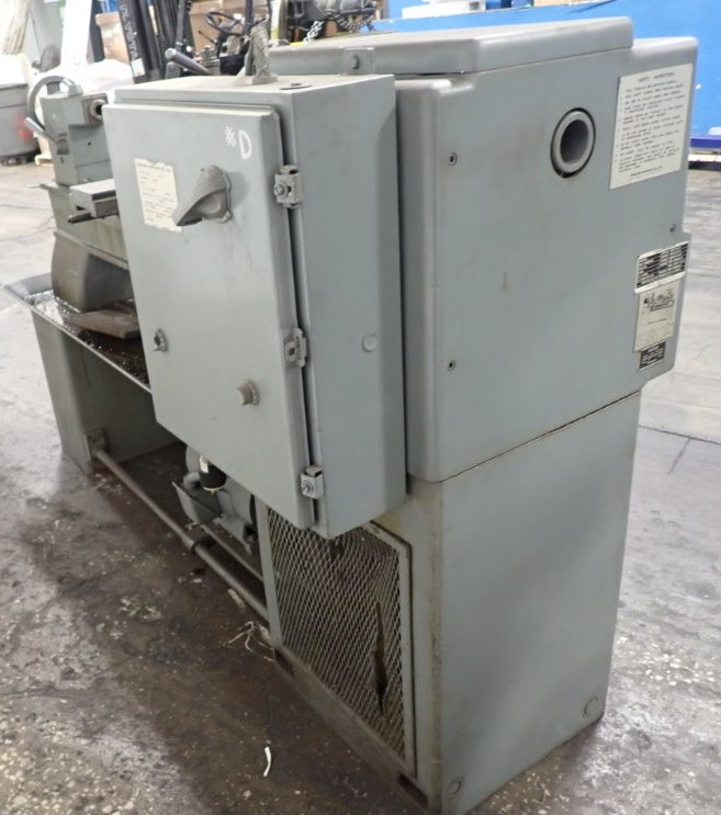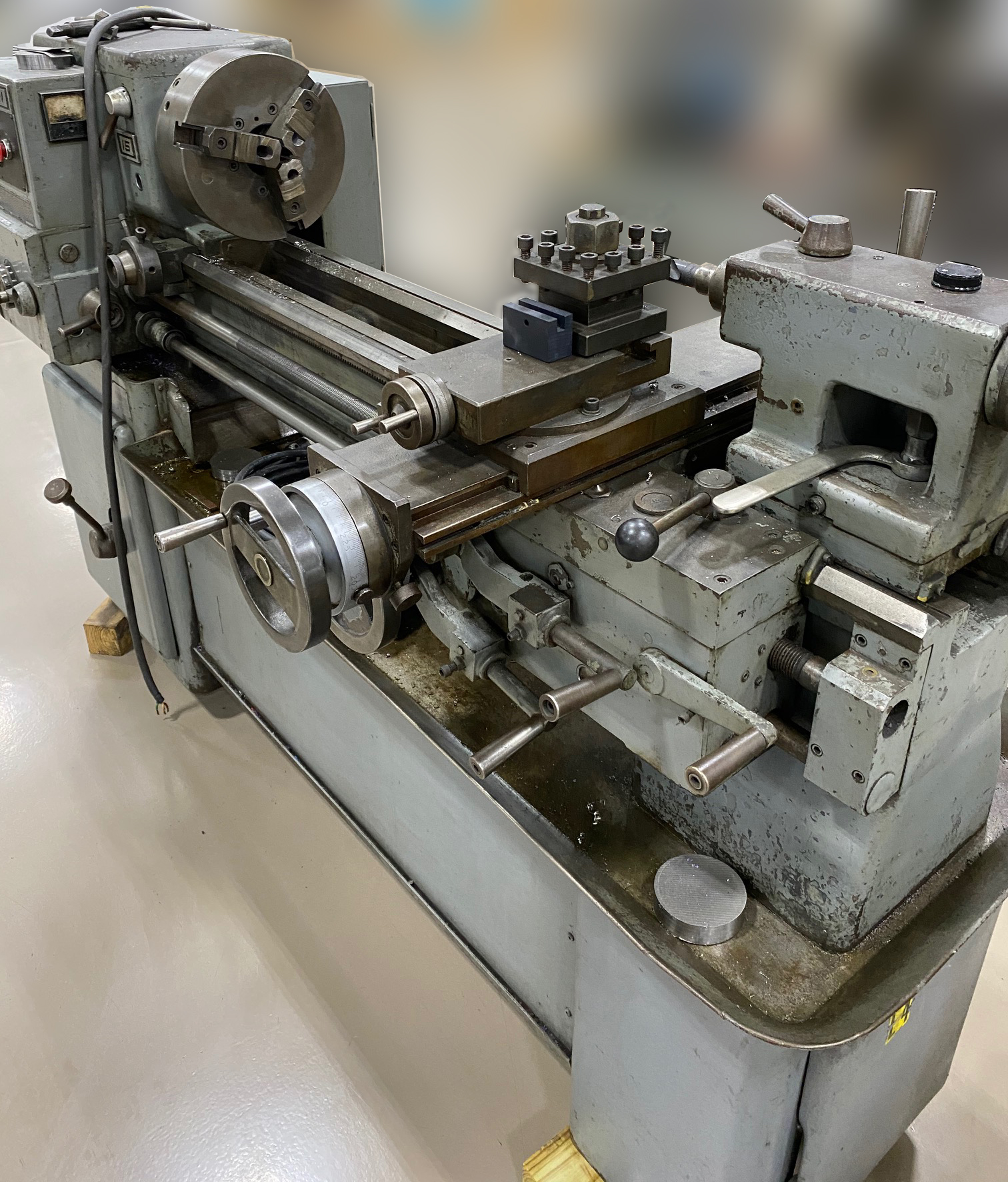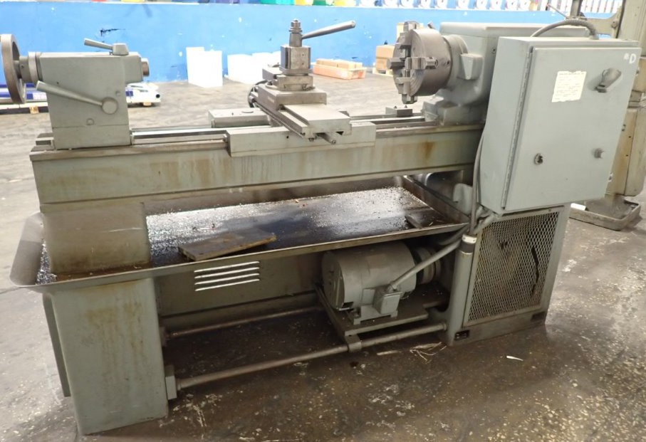 Introduced during the late 1970s and built until perhaps 1982, the Sheldon R-Series lathes - fitted with distinctive dial-change screwcutting gearboxes - were directly equivalent to the Colchester Colchester Master 2500 (Clausing Models 8014/15/16/17), Triumph 2000 (Clausing 8030 Series) and Mascot 1600 (Clausing 8050 Series). Both makes were a revolution in styling and specification and, though they may have lacked mechanical novelty, were a strong reminder that even machine tools are subject to the vagaries and whims of fashion. With their distinctive 'square' styling, ergonomically-designed controls and bright finishes, the new lathes and their angular styling made competing machines look distinctly dowdy and old-fashioned. Based on the earlier 15-inch Sheldon - itself a development of even earlier machines - the new Sheldon lathes had been carefully designed to incorporate a range of significant improvements and could be had with between-centre capacities of 30, 42 and 66 inches. While the 13-inch model was more lightly built than the larger pair - these differing only in capacity - all shared a number of useful design details intended to help survival in an industrial environment. Beds were flame hardened, the cross-slide dovetails and ways hard-chrome plated, the top and cross-slide screws hardened (and the latter with an anti-backlash nut), one-shot lubrication to the bed, carriage and cross-slide ways and cross-feed nut, very useful automatic stops to both the power sliding and surfacing feeds - and a micrometer-equipped carriage stop as standard. Two cross-feed stops were provided as part of the standard equipment with others able to be fitted as required. Similar to many lathes made in Europe( e.g. Voest, Dimco, Cardiff and Smart & Brown) the lathes used a drive system with a motor inside the cabinet base connected to a 4-speed gearbox. Final drive to the fully hardened and ground spindle (that ran in three "zero precision" taper roller bearings) was by three V-belts, the spindle pulley being overhung on the outside end of the spindle. The pulley drove the spindle though a "peg" and so was isolated from it, the aim of this arrangement being to stop gear chatter being transferred to the workpiece - though the headstock did contain low-speed backgears with the whole assembly running in an oil bath. On the R-13 the D1-4" spindle nose was formed with a 3 Morse taper and a bore of 1.5" - while R-15 and R-17 both had a D1-6" nose, a 6 Morse socket and a bore of 2.25". As standard, just a single-speed motor was fitted but, at extra cost, a 2-speed one could be fitted - as could ones with a brake. The R13 had a 3 h.p. motor while a 5 h.p. was used on the R-15 and R-17. Standard speeds, across the range, were 45, 120, 160, 200, 300, 630, 940 and 1250 r.p.m.; however it was also possible to order a faster set that spanned from 75 to 1800 r.p.m. As a further option, another range of models was offered, the VR-Series, these being equipped with a high-precision spindle with a maximum run-out at the spindle nose of 0.0001". There was also a guarantee that the vertical and horizontal alignment of the headstock, measured at the end of a 12-long test bar was held within 0.0003". In place of the standard drive system, VR-Series lathes were equipped with an infinitely variable-speed drive that used a 5 h.p.. DC motor fitted with dynamic braking. These models aimed to provide not only higher accuracy but also, by the use of a series of 4-speed geared reductions, improved torque over the full range. Speeds were divided into eight ranges of 0 to 100 r.p.m, 0 to 230 r.p.m., 0 to 300 r.p.m., 0 to 400 r.p.m., 0 to 650 r.p.m., 0 to 1300 r.p.m., 0 to 1950 r.p.m. and 0 to 2500 r.p.m. A motor-load indicator was provided that showed the operator when to change to a different geared range would provide a more efficient rate of production. The motor control system was built into the top section of a 3-drawer tool-storage unit, a dial-operated potentiometer and electronic tachometer being provided alongside a set of push-button controls for spindle start, stop and reverse - these being duplicated across the front face of the headstock. All models used the same screwcutting and feeds gearbox with an identical range of 80 different rates of feed from as slow as 0.0005" and 80 inch pitches from 4 to 960 t.p.i. The box was fully enclosed, oil-bath lubricated and operated by two knobs that could be revolved in both directions either individually or together. As the knobs were rotated, the feed rate and pitch appeared on a dial fitted between them. The box, which incorporated an instant-reverse control that could, very usefully, be operated with the box running, drove a leadscrew that was made from a stress-relieved steel and accurate to 0.0004" in any 4 inches and 0.001" per foot. . Made as an enclosed box, the apron was fully enclosed, oil-bathe lubricated and two separate, lever-operated multi-disc clutches for the power sliding and surfacing feeds. The tension applied to each clutch could be adjusted from the front to provide a safety overload that could be varied according to the job at hand. The saddle carried the compound slide rest assembly slightly offset to the left, with the bed's ways extending for a short distance in front of and behind the headstock. This arrangement allowed the cutting tool could be advanced right up to the spindle nose while still being fully supported. A possibly unique fitting was a built-in thread dial indicator that could be removed and stored in an apron cavity when not needed. The cross-slide way was, on all versions an unusual 26 inches long and so able to mount both front and rear swivelling top slides, raiser blocks to carry rear-mounted parting-off tools, an 8-station capstan head, a hydraulically-driven tracer attachment and various "fixture plates" that included a form of milling slide. Cross-feed travel on the R-13 and R15 was 8.25 inches and on the R-17 9.75 inches. Top