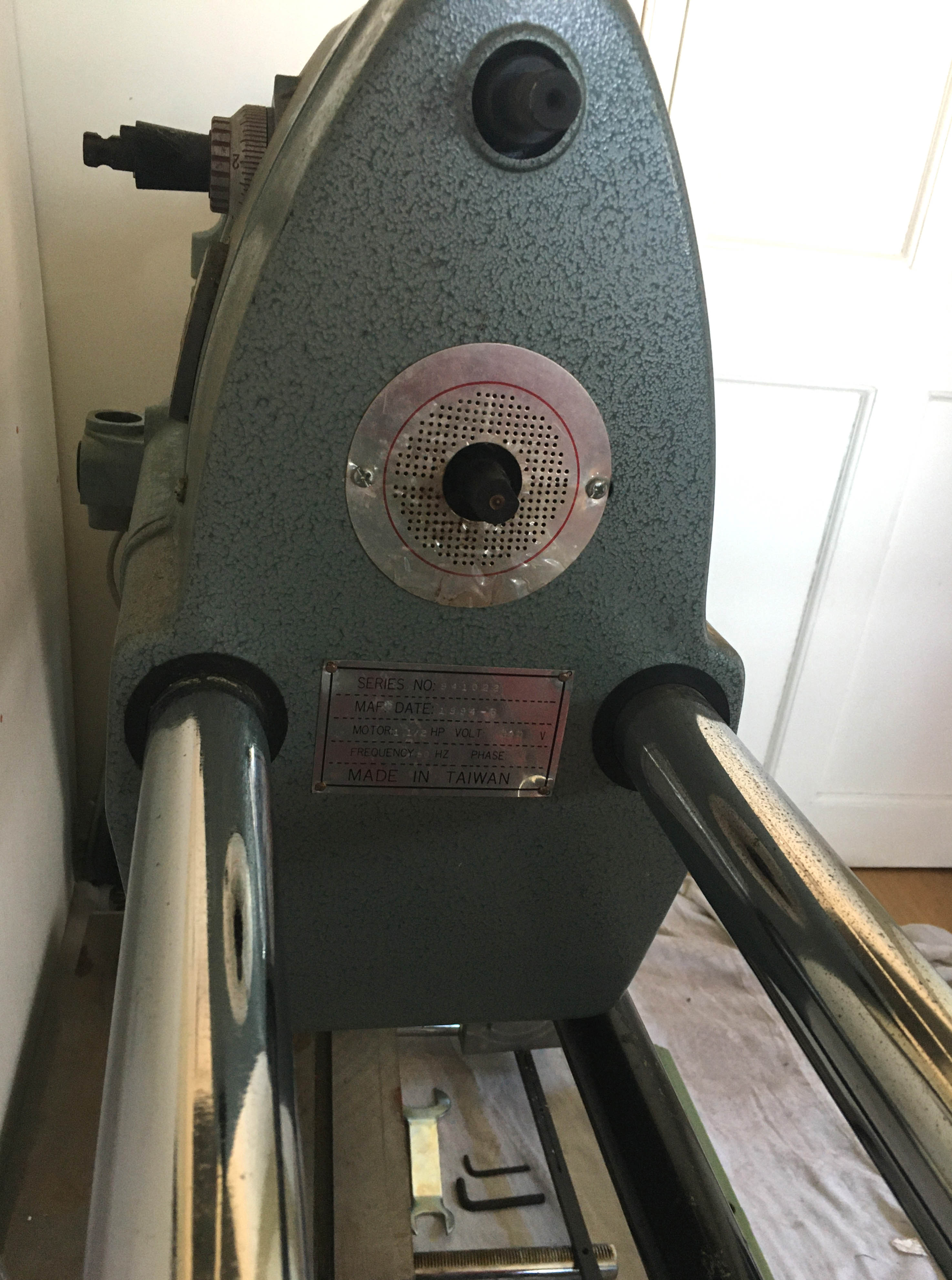 Developed in the late 1940s by a gifted German immigrant Hans Goldschmidt, the Shopsmith Company's first machine was intended to meet an emerging domestic market for a compact, do-it-all, reasonably-priced woodworker. Cataloged as the Model 10er, Goldschmidt's first machine was first put on the market in 1947 and became the model upon which all following types were to be based. Combining a saw table, lathe, drill press, sanding disc (faceplate) and a horizontal borer, all were powered, with great ingenuity, from a single motor. The machine, which took up no more room than a conventional wood-turning lathe, was built around a robust bed of two widely-spaced steel tubes (further braced by two lower, parallel bars that connected the legs) and branded "Shopsmith". The actual manufacture was by the Magna Engineering Corp. of San Diego, CA., a company owned by Mr. Goldschmidt. A unique feature for a multi-function wood machine was a moveable quill - this being a circulr cast-iron housing - just like that used on most drill presses - that held a spindle running in anti-friction bearings and machined its outside surface with a rack so that it could be moved in and out of the headstock casting. This design had two advantages: the machine could be arranged to hinge into an upright position and so be used as a conventional but very large-capacity drill press or, in its normal "lathe" mode, as a horizontal boring or drilling machine. By 1953 an improved model was in production, the long-lived and very popular Mk.V. This was to be steadily developed and refined with improved drive belts and the motor eventually becoming a 3/4 h.p., with speeds infinitely variable from 700 to 5200 r.p.m. Although fittings included with a new machine varied over the years, by the mid-950s the new owner received a machine ready to run and, in the box, items that included a dual-locking rip fence, a support table at the other end of the bed to hold large sheets when using the saw bench, a hand T-rest for wood-turning, a 9-inch saw blade and arbor, lathe drive and cup centres, a miter gauge, a 12-inch sanding disc and sheet of sanding paper and a half-inch capacity Jacobs drill chuck. Larger accessories were driven by a flexible shaft from the left-hand end of the machine, so obviating the need for pulleys and belts, and included a horizontal-to-vertical swivelling band sander, a 19-inch throat jig-saw, a 4-inch wide jointer (a planer in the UK), an 11-inch throat bandsaw - and even a compressor to run a spray gun. As standard, the Shopsmith unit was mounted on handy tread-down castors, so enabling it to be pushed easily to one side of the garage or workshop when not in use. Although production had ceased in 1964, by 1972 the Company had been restructured and the unit, largely unchanged, was back in production. Development continued and, in 1985, the improved Mk.V 510 was introduce this, is turn, being superseded by the current Mk.7, the new model having a redesigned headstock with a powerful, 1.75 h.p. motor driving a remarkably wide, infinitely-variable speed range from 250 to 10,000 r.p.m. Happily, the entire head assembly from the Mk.7, and some other parts, can be used to upgrade the Mk.V and Mk.V 510 models. Many copies of the Shopsmith have been made, some being exact clones and manufactured in Taiwan - the photographed example below being one of the rarer examples, a machine branded Tyme for an English makers of simple wood-turning lathes. Like all copies of the American original, the Tyme "Multi-tool" enjoyed a surprisingly high build quality with smooth, chrome-plated bed rails and was supplied complete with all the usual Shopsmith-type fittings. Fitted out ready for immediate use, power came from a 1.5 h.p. single-phase motor that provided a range of infinitely variable speeds spanning 850 to 5,200 r.p.m. on the UK's 50 Hz supply. Accessories supplied with each Tyme included a miter gauge, a miter gauge safety grip, a rip fence, hand-T-rest for woodturning, a 11.750-inch diameter sanding faceplate complete with an aluminium oxide medium-grit sheet, a general-purpose saw blade, an extension table to support large sheets being cut on the saw bench, the necessary wrenches, Allen keys, a wood-drive centre, a rotating centre for the tailstock, a drill chuck - and even a pair of goggles, touch-up paint and a "safety push stick" to keep hands away from rapidly rotating blades. Optional extra available - and all driven from the main spindle - included 4 and 6-inch spindle-moulders (described using the American term "jointer), an 11-inch throat bandsaw, a choice of 18 and 24-inch throat jigsaws and a 6-inch belt-sander..