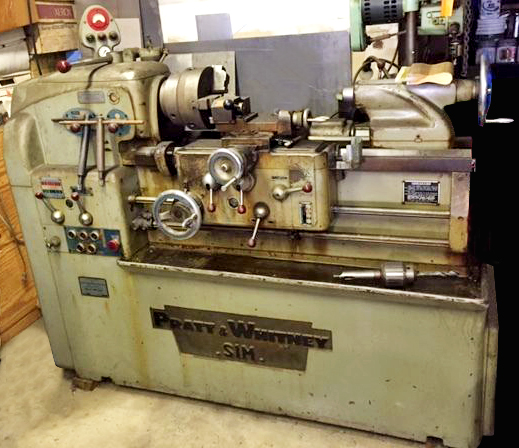 SIM was the abbreviation for 'Societe les Innovations Mecaniques', a Company based in Moret-Loing-et-Orvanne, France, a Company wound up in 1998. Not an "engine" lathe for general workshop use, the SIM T5 was intended for production use. Hence, it could not produce threads but was equipped instead with power longitudinal and cross feeds - each fitted with four micrometer-adjustable stops. Thus, a repeat production job could be set up with the necessary cuts already arranged and an unskilled operator employed to do the work of loading and unloading a job. In addition to a 4-way toolpost, a second multi-holder rear toolpost was also fitted. The lathe, intended for continuous heavy work, was very strongly built with the bed and base formed as a one-piece casting in iron, with multiple internal ribs to add stiffness. Bedways - and the cross-feed screw were hardened and ground. Although strongly built, the lathe was of limited capacity; the swing was 13.75 inches and the capacity between centres just 20.5 inches. With a 1-inch bore, the headstock spindle was in a case-hardened chrome-nickel steel, ran in three high-precision roller bearings, and, driven by a powerful 7.5 h.p. motor, had eight speeds of 180, 250, 355, 500, 710, 1000, 1400, 2000 and 2800 r.p.m. Nine longitudinal power feeds of 0.0015, 0.002, 0.003, 0.004, 0.006, 0.008, 0.0012, 0.0016 and 0.024 inches per rev were available with the power cross feed rates set (as usual on this class of lathe) at half the longitudinal. The lathe was 65 inches long, 32.5 inches wide, 53.5 inches height and weighed 2880 lbs (1.28 tons). Rather oddly, the "SIM" lathe was a 1960s addition to the usual rather limited selection offered by Pratt & Whitney. Known for their very wide variety of machine tools, P & W never concentrated on lathes but instead contented themselves with what might be described - relative to the size of the company - as a toe-in-the-water approach. Discounting the Pratt & Whitney's ranges of plain-turning bench precision, capstan, spinning, cutting-off, pattern-makers' and simple hand-turning and drilling types, their 399-page brochure for 1891 included just 16 pages that listed conventional backgeared and screwcutting lathes (generally referred to in the USA as the "engine" type, but BGSC (backgeared and screwcutting in the UK). Models listed included ones with 10-inch, 14-inch, 16-inch, and 24-inch swings. By 1917 the range had shrunk to just five models of backgeared and screwcutting "engine" lathes - two being of cone-head type with flat-belt drive and a 10-inch version described as a 'Toolmakers'' model. A pair of 'ordinary' engine 14-inch and 16-inch lathes could be had with either a cone-head or all-geared headstock. By the late 1920s and into the early 1930s, the range had changed to become the well-made, very much more robust Model B types with swings of 13, 16 and 20 inches.By the late 1940s, the range had changed to the improved Model C, with just three engine types listed, these having swings of 12, 14 and 16-inches. Heavy industrial lathes dedicated to production-only use have included the Liecht, Porter Cable, Porter Cable Carbo, Smallpeice, Sebastian, Tovaglieri, 'Hogarth', UMA, Chard, Eugen Weisser Gerbrüder Heineman, and Bridgeford..