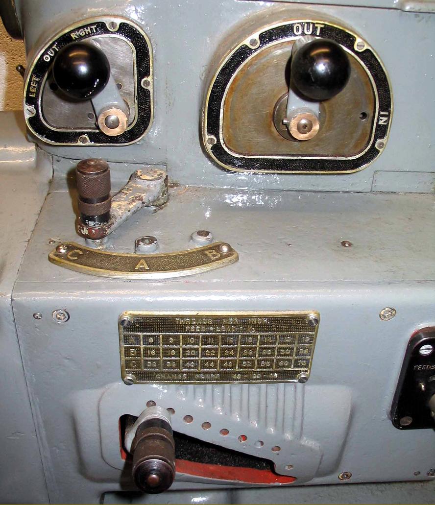 Like all the larger toolroom S & B lathes the speed-change gearbox of the model A was mounted inside the base of the cast-iron cabinet stand and the drive transmitted smoothly to the plain-bearing headstock by a flat belt. The apron contained an automatic oil pump whilst the headstock bearings, and gear drive to the screwcutting gearbox, were lubricated by a hand pump - the plunger handle of which can be seen protruding through the headstock cover. The maximum collet capacity was 0.75" (19 mm), the spindle nose was 1.75" x 8 t.p.i and the headstock bore 63/64" (25 mm). The centres were No. 2 Morse taper, the twelve spindle speeds ranged from 39 to 1430 rpm. and the machine weighed 1736 lbs. Direct-fitting spindle collets are the Crawfor dType 2804, these have a plain diameter of 0.984", a length of 3.625" and a collet head (closed down) of 1.310". Another collet that fits, though the maker is not know, is stamped 1266. Pictures showing details of the Model A are lower down the page. One important point about early versions of the Model A concerns the sometimes-encountered difficulty of changing speeds - this being done by a 3-position quadrant lever, on the front face of the stand, connected by a shaft to a three-speed gearbox mounted inside the cabinet. The design of this mechanism is faulty, the shaft connecting the lever to the gearbox being fixed rigidly in position on the lever, but free to move up and down with gearbox motor-support plate. As the latter is adjusted up and down to set the tension of the headstock drive belt, the shaft is deflected out of line making gear section difficult - or even impossible. The solution? Make sure that the belt is kept as short as possible; this means that any necessary adjustment of the belt's final tension is reduced to a minimum and hence shaft misalignment greatly reduced. As short-cut, if gear changing is difficult, before moving the quadrant lever, use the belt tensioning lever to slacken the belt, change the speed and then re-tension. Lathes.co.uk can supply the correct drive belt, made from either this or this. Phone 01298-871633 for more details of belts and their fitting