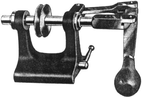 Toolpost-mounted Grinding Attachment: This early version, which lacked the heavier build of later designs, was described in the first catalogs as a simple "grinding attachment" and was intended for internal and light external grinding. The unit was driven by a round rope driven from a long drum attached to the overhead countershaft and was usually clamped into the position usually occupied by the tool post - and was therefore adjustable through all the normal movements and angles associated with the compound slide. Whilst Stark eventually listed four different models to suit the various sizes of lathe, all had the same 17/16" spindle travel.