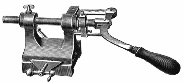 A Stark No. 3 Bench Lathe equipped as a rather large watchmaker's lathe with a faceplate (possibly with a "Pump Centre") and Jewelling Tool. Stark advised that the Pump Centre was used for: "uprighting all kinds of Train Movements, such as Chronometers, Water and Gas Meters and all Electrical Trains constructed for Electricians", whilst the jewelling tool was for: "setting Lenses in Transit Instruments or setting Jewels in Chronometers or other train holes". Several large cut-aways in the "faceplate" allowed the operator to see the work from behind as it rotated.