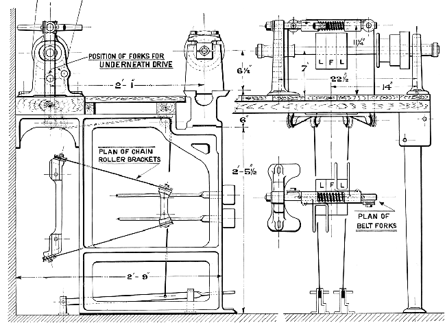 Cross sectional drawings showing how a line of "Reversing" Brass-finishers' lathes could be arranged, bolted to both floor and wall - and driven from an overhead line-shaft system.