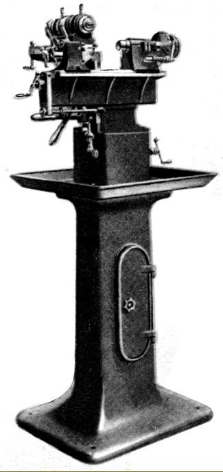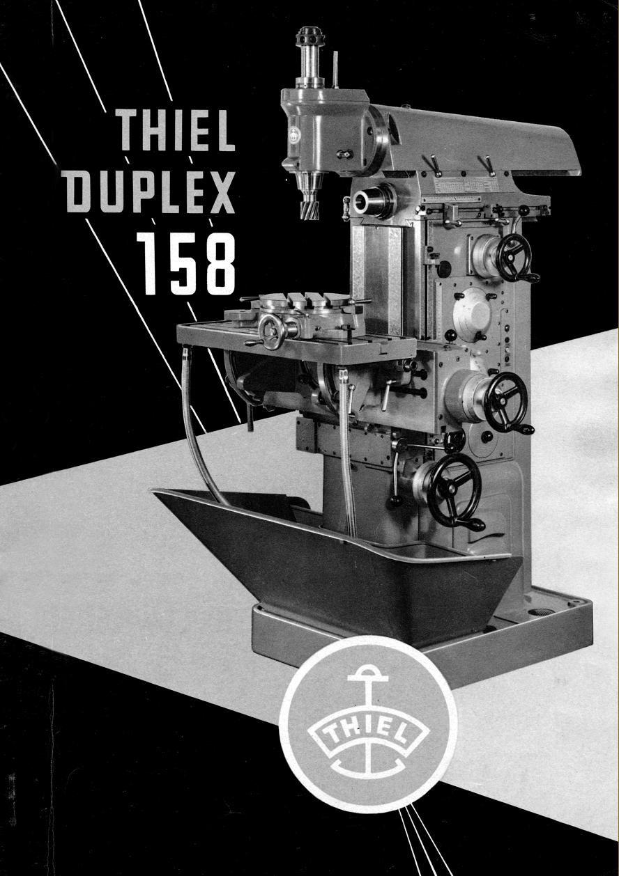 To solve the problem of how to drive the spindles when their housings were moved forwards and backwards (to provide lateral travel to the cutter), the topmost gear of the column-mounted speed-change gearbox was made very long and a small gear, fitted to the first of the overhead rams, allowed to slide along it. In turn, this gear protruded above the top face of the casting so that a splined shaft, held within the uppermost ram housing (and connected to the head at the front end by bevel gears), passed through its centre and allowed the gear to slide as the head was moved to and fro. Besides normal horizontal and vertical milling operations, all models were available with a range of accessories to cover slotting, jig boring, jig grinding, spiral milling and punch milling. In respect of these operations, an important part of the machine's versatility was dictated by the multi-angle, swivelling and tilting table and indexing attachments; a machine with just the plain table and standard vertical head available remained very useful, but it was not possible to enjoy, in full, all its ingenious capabilities. Drive System Arranged to drive both the milling spindle and the feeds to the head and table, the main motor fitted to the standard 158 was a single-speed, 3-phase, 2.2 h.p. 1500 r.p.m. type mounted inside the column at the back with drive by, at first 2 and then later 3 external V-belts (guarded by a full-height cast-aluminium cover) to the input pulley of the speed-change gearbox. Positioned in the column below the spindle-speed gearbox, the table and head-feed gearbox (on the ordinary version) 158 had eight speeds that gave feed rates (for horizontal, vertical and head in-out travels) of 9.5, 16, 25, 32, 45, 90, 100 and 160 mm/min. On all models the gears were hardened and ground, ran on multi-splined shafts and were lubricated by an oil bath. Although the table feed rates were independent of the spindle-speed settings (any combination of speeds and feeds was possible), the arrangement could not provide a "rapids" travel and, to allow this, Thiel offered another version, the 158S, a type equipped with a separate motor to run the feeds' gearbox while also providing a rapids feed rate of 900 mm/min. The feeds on the S could be reversed while running and rapids selected at any moment or position simply by depressing a red-painted lever - simply releasing the lever stopped the feed. Table feeds were engaged by a pair of long levers, one positioned at each side of the knee and so allowing operation from either end of the table--or even from behind. Automatic table stops were, of course, provided and all drives protected by easily accessed shear pins. Table travels (which were not shortened by use of power feeds as on so many other makes) were 310 mm left to right and 400 mm vertically; the in and out feed (provided, of course by the ram head), was 200 mm. Feed screws on all three exes were precision ground, ran though substantial bronze nuts and were turned by large handles that provided exactly the right degree of "feel". Micrometer dials were huge, finely engraved, satin-chrome finish and equipped with vernier scales. Built-in steel rulers were provided for each axis of movement which, in combination with the standard-fit holders to accept dial-test indicators and gauge blocks, allowed high-precision measurements by co-ordinates to be made, independent of the feed-screw readings. Provided in a correct geometric progression, the 12 spindle speeds spanned a useful: 60, 80, 106, 140, 180, 240, 320, 470, 536, 700, 920 and 1200 r.p.m. Fitted with a sliding commutator, when switched off the motor provided a braking action that stopped all rotating feeds - as there was no idle time to the stop point, safety was considerably increased. Motor control for start, stop, brake release and jog was by push buttons with reverse selected by a separate lever. Case hardened and ground all over, the horizontal spindle ran in high-precision taper roller bearings that provided both excellent support and an easy means of adjustment. Heads Although the range of heads was not as wide as that offered by Deckel, a good basic range was available with, for horizontal use, an overarm and drop bracket to hold a milling arbor - both being supplied as part of the standard equipment. Also provided with each new machine was a 360° swivelling milling and drilling head, this being powered by the machine's own drive system and fitted with a No. 40 INT nose with a collet capacity of 25 mm. The quill travel was a reasonable 90 mm (and it was possible to space the centre line of its cutter a maximum of 700 mm away from the inaner face of the column). 12 speeds were provided, these being geared up from the horizontal drive to give a useful: 90, 120, 160, 210, 270, 360, 480, 705, 805, 1050, 1380 and 1800 r.p.m. Speed changes were made by three concentric dials on the columns right-hand face, this modern arrangement (as first used on Cincinnati "Dial-Type" millers) replacing the externally-mounted box with a pair of quadrant levers used on the Model 58. To aid the drilling of small holes and the use of tiny milling cutters, a special 0.5 to 5 mm collet capacity head was available with a second spindle mounted parallel to the first and geared to give 6 useable speeds of 1720, 2240, 2920, 3840 and 5000 r.p.m. The maximum quill stroke by lever (no fine feed by handwheel was fitted) was 40 mm. When a lot of jig, or high-precision boring or drilling was envisaged, a special automatic down-feed head (Attachment N. 7) was provided. This could be swivelled through 90° each side of vertical, had a spindle with a No. 5 Morse taper nose socket, a slide traverse of 150 mm (under power or by a hand lever) and 12 speeds from 90 to 1800 r.p.m. Three rates of power feed were fitted: 0.03, 0.06 and 0.12 mm/min. - all able to be engaged, disengaged or changed at will during as run For slotting, the usual king of head was provided: this could be swive